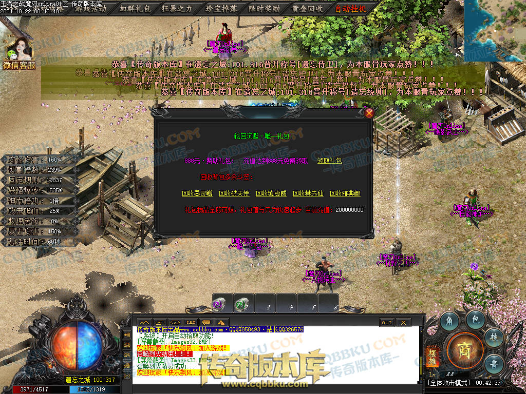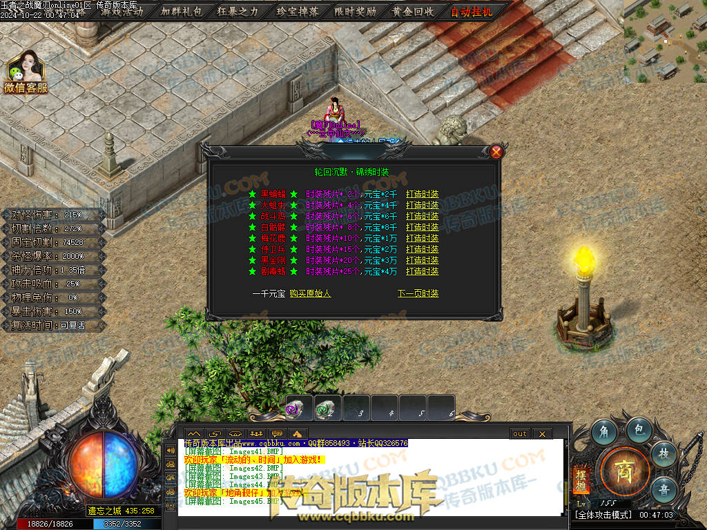 充值回馈 88元送(破天荒切割面巾) 时空只心6个 时装残片50个 人物爆率100% 全屏吸怪冷却50秒 5万元宝)