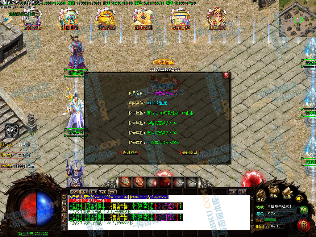 称号:最高19级称号(鸿蒙掌控者) 等级:最高888级