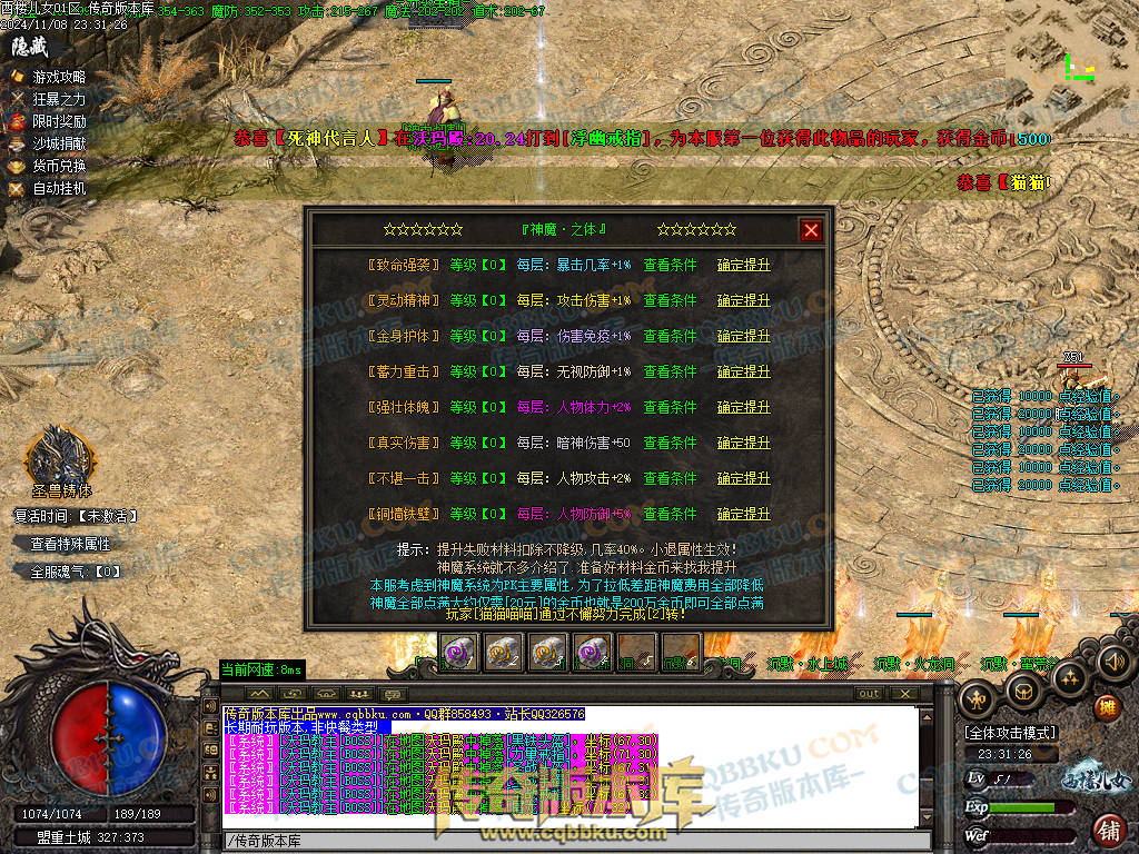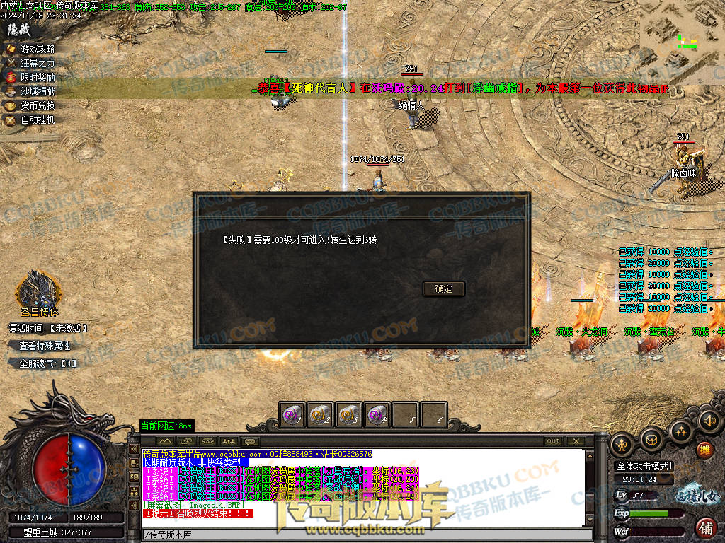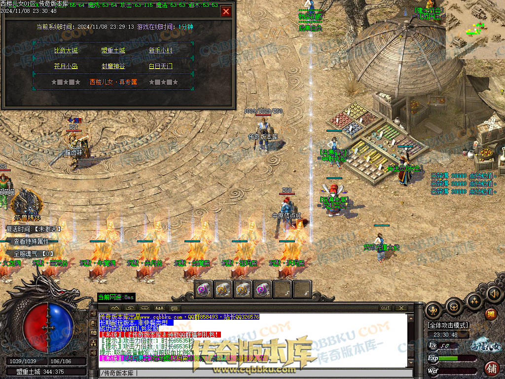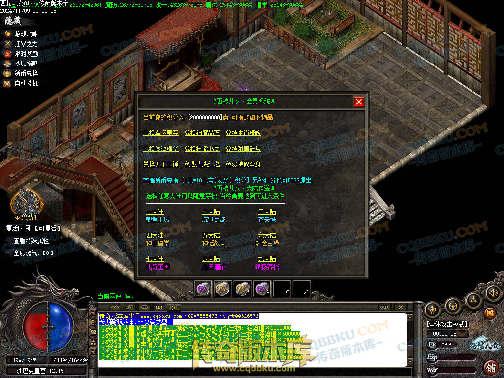 九大陆:土城-沉默之都-苍天城-神兽殿堂-神话战场-封魔古堡-比奇王国-白日道馆-终极客栈-未知!!!!