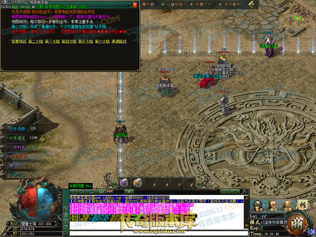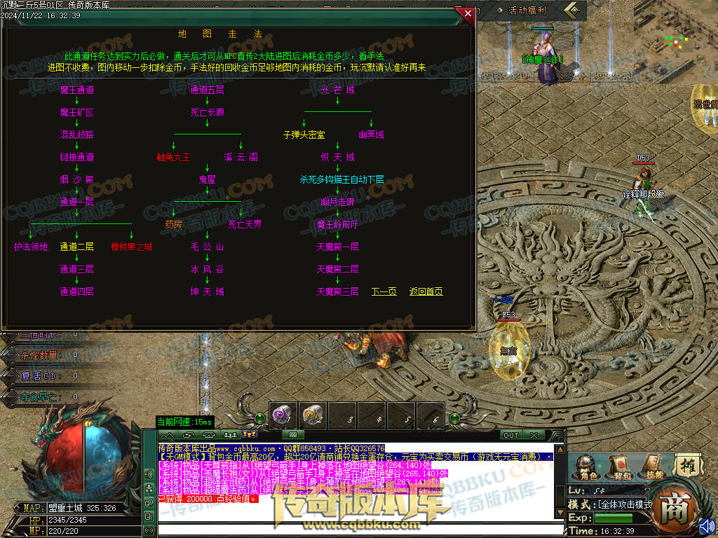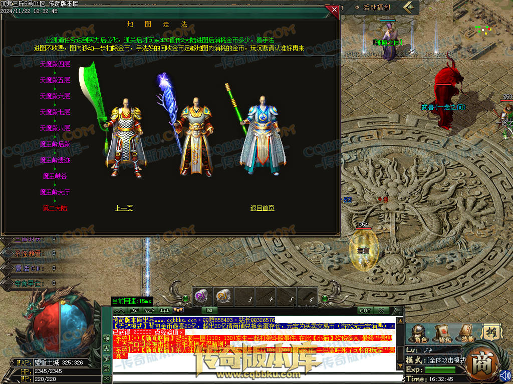 一共分为多个大陆:2大陆走一次魔王岭通道通关,第二次就可直传2大陆(通道里每移动一步扣除少许金币,可随机,不可传送)