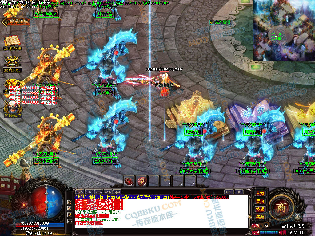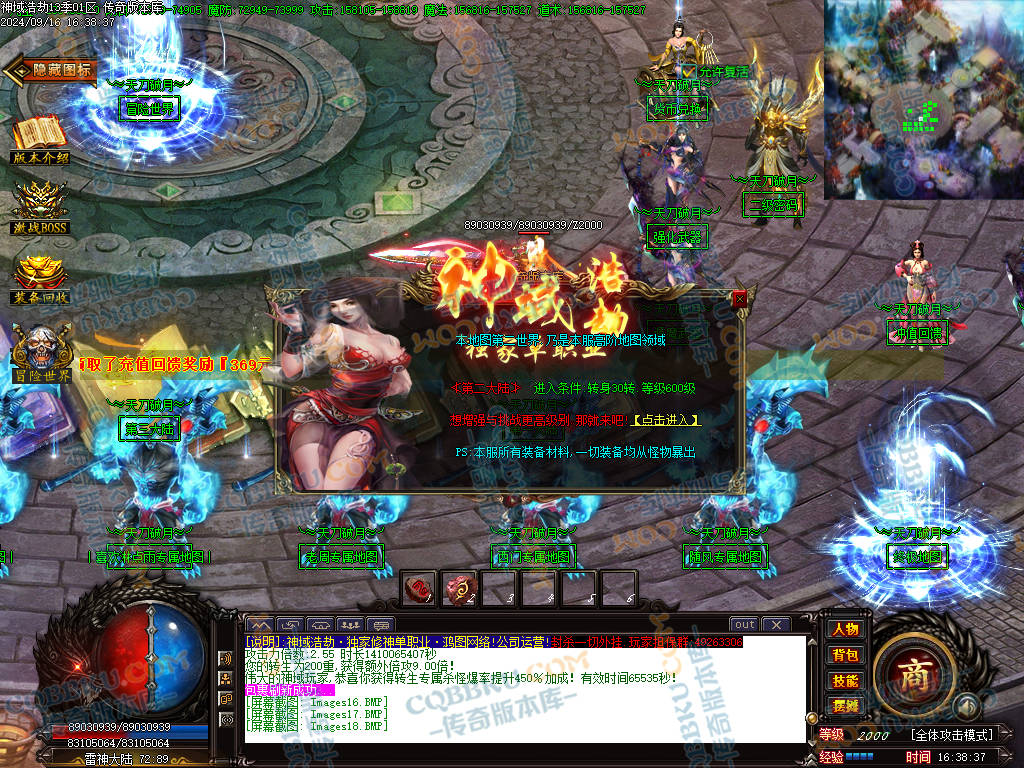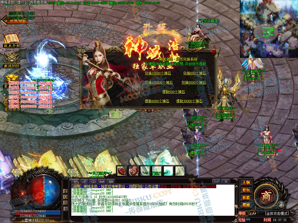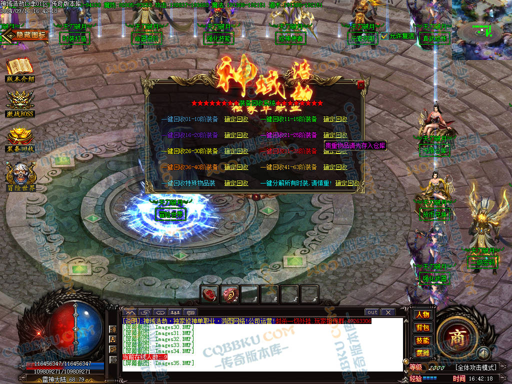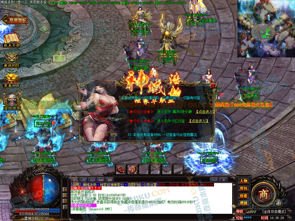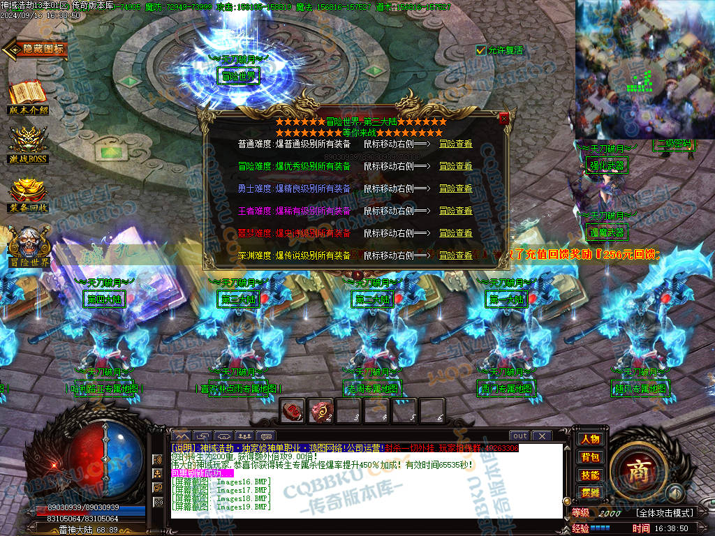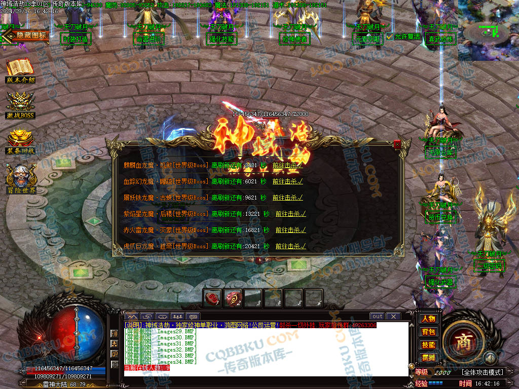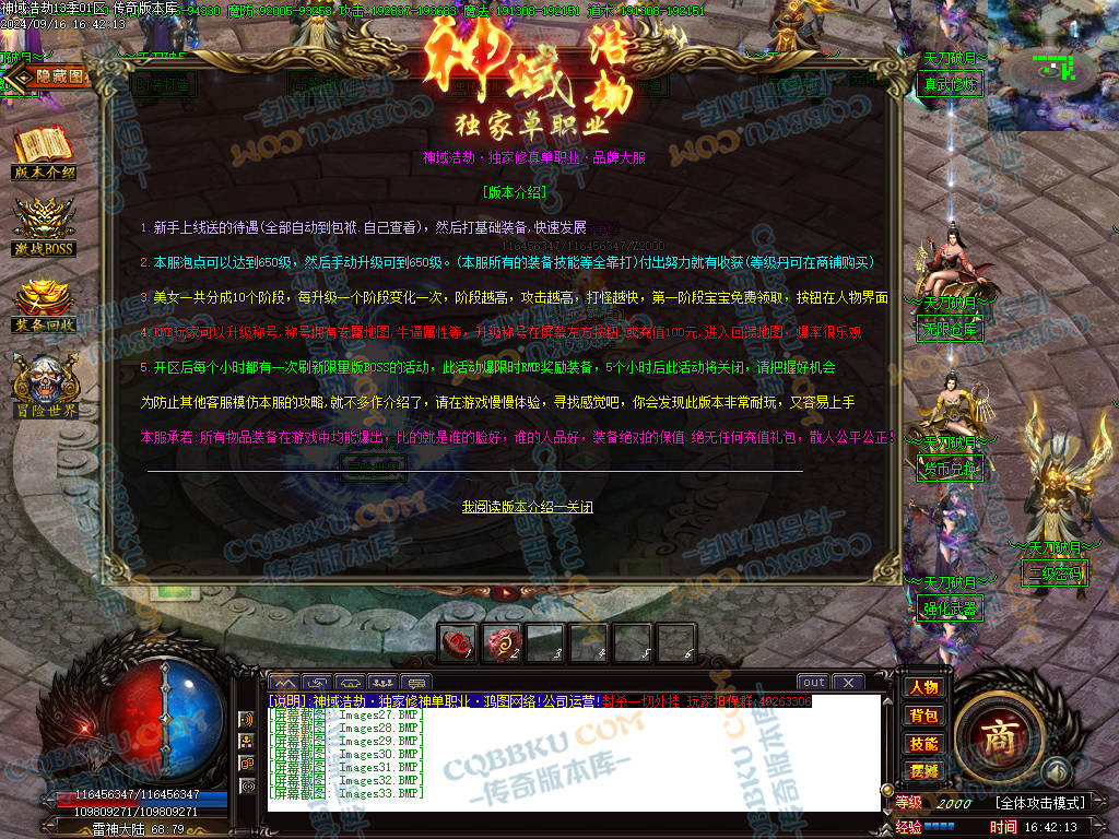 本服比奇大城,苍月岛,封魔谷,白日门刷新怪物.更有爆终极的终极BOSS刷出,刷新地点时间请进服体验!