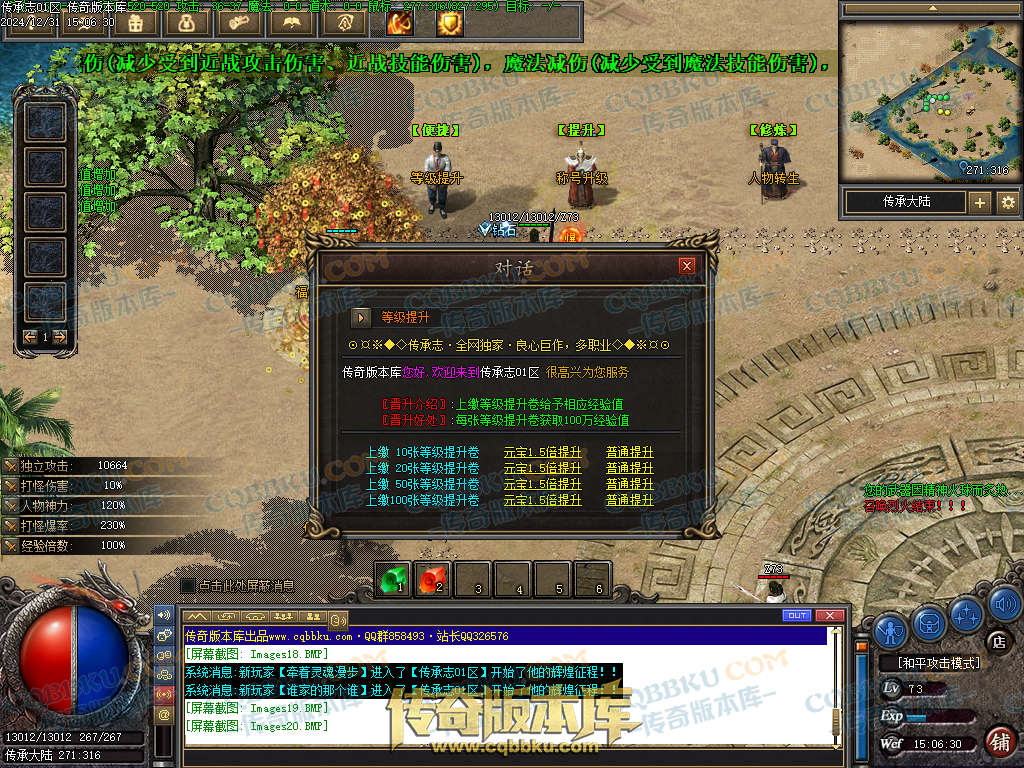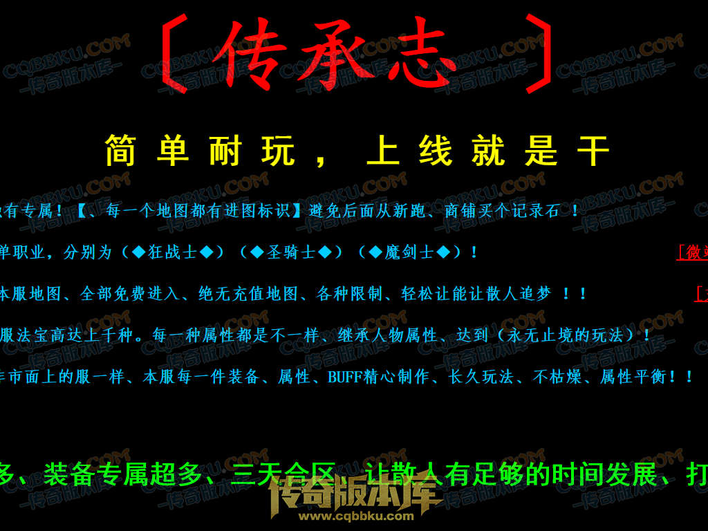 传承志是暗黑专属三职业传奇,带假人,带光柱,装备增幅,神魔之体,带大背包和自动回收系统,此端采用翎风引擎精心耗时制作,更多细节参考详情图文介绍