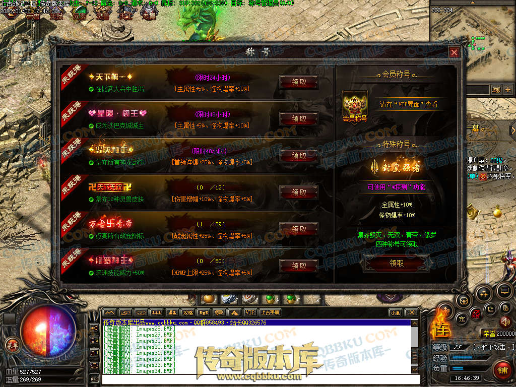 理员”拿称号,商城买血脉精玉升坐骑属性,“时装界面”买魔皇时装加切割属性。