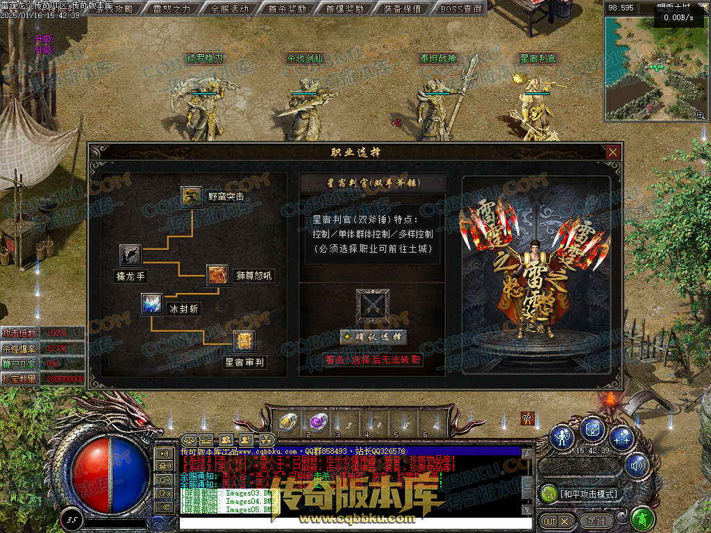 独家特色职业:四职业、分别对应武器 (刀 剑 枪 斧)全新技能、职业平衡、各有特殊、专属武器 专属套装、