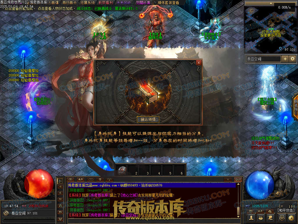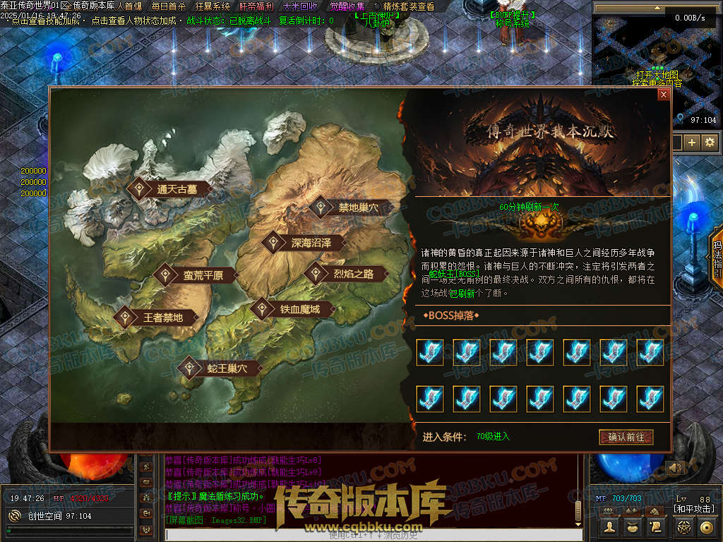 本服<空间跳跃三大陆> 有地图4张 +每一张地图分别有一,二,三层!能同时满足100人刷怪需求,毫无压力