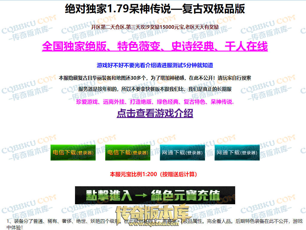 呆神传说是1.79复古双极品经典版三职业传奇,纵横古墓,树界降临,拏蘢海,烛龙之地,此端采用翎风引擎精心耗时制作,更多细节参考详情图文介绍
