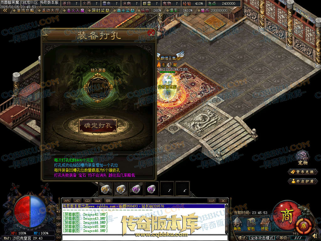 装备没有孔可以背包按钮打孔 第一个孔100%成功 仅只需400元宝 非常好搞 散人花时间一样牛