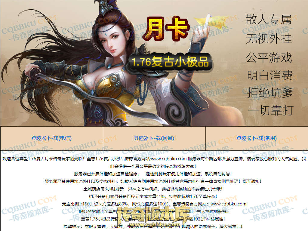 1.76复古月卡传奇玩家的光临!至尊1.76复古小极品传奇官方网站:www.cqbbku.com 服务器每个新区都会强力宣传,请玩家放心游戏的人气问题。我们会提供一个最公平最稳定的传奇游戏给大家!