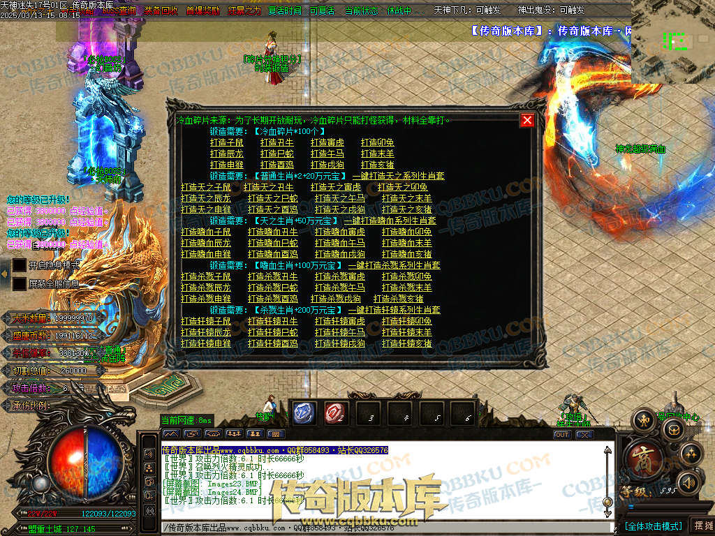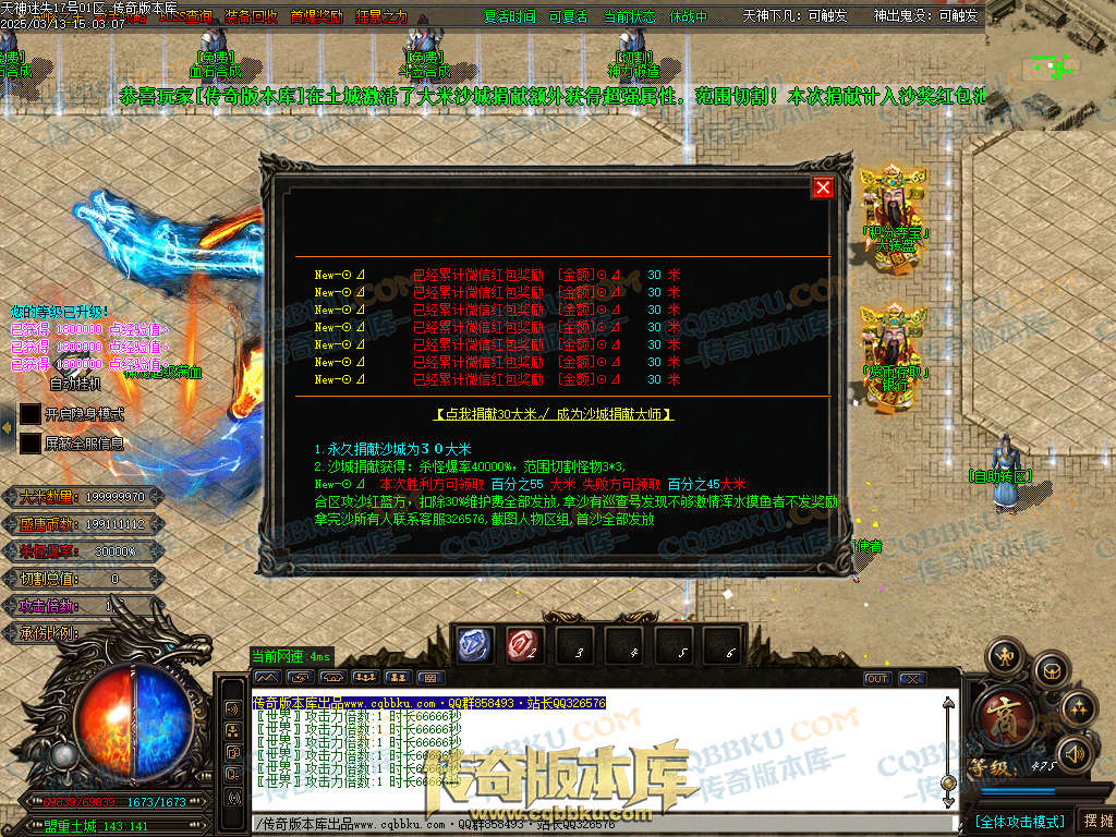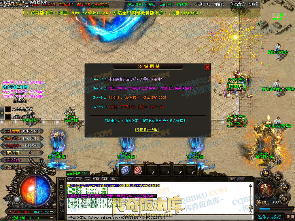 上线领取赞助礼包QQ群礼包送珍宝龙珠,开启狂暴之力和免费公益捐献
