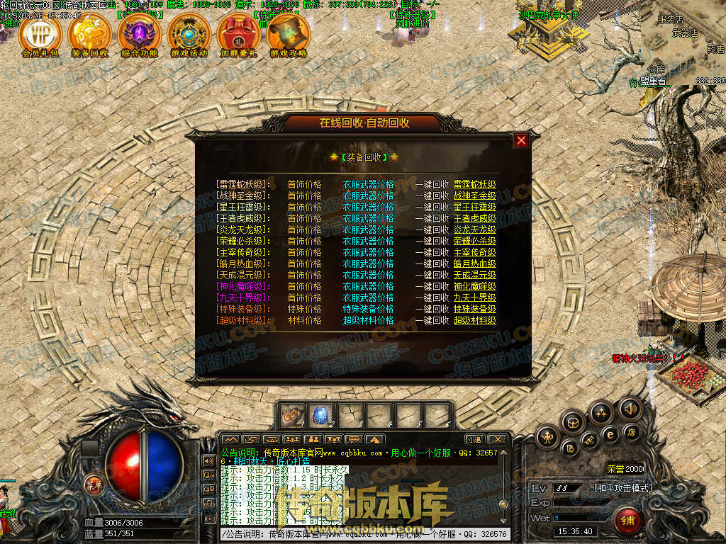 天赋轮回是新纪元复古三职业传奇,带假人功能,装备光柱特效,稳定耐玩,沙城捐献,带大背包和自动回收系统,此端采用翎风引擎精心耗时制作,更多细节参考详情图文介绍