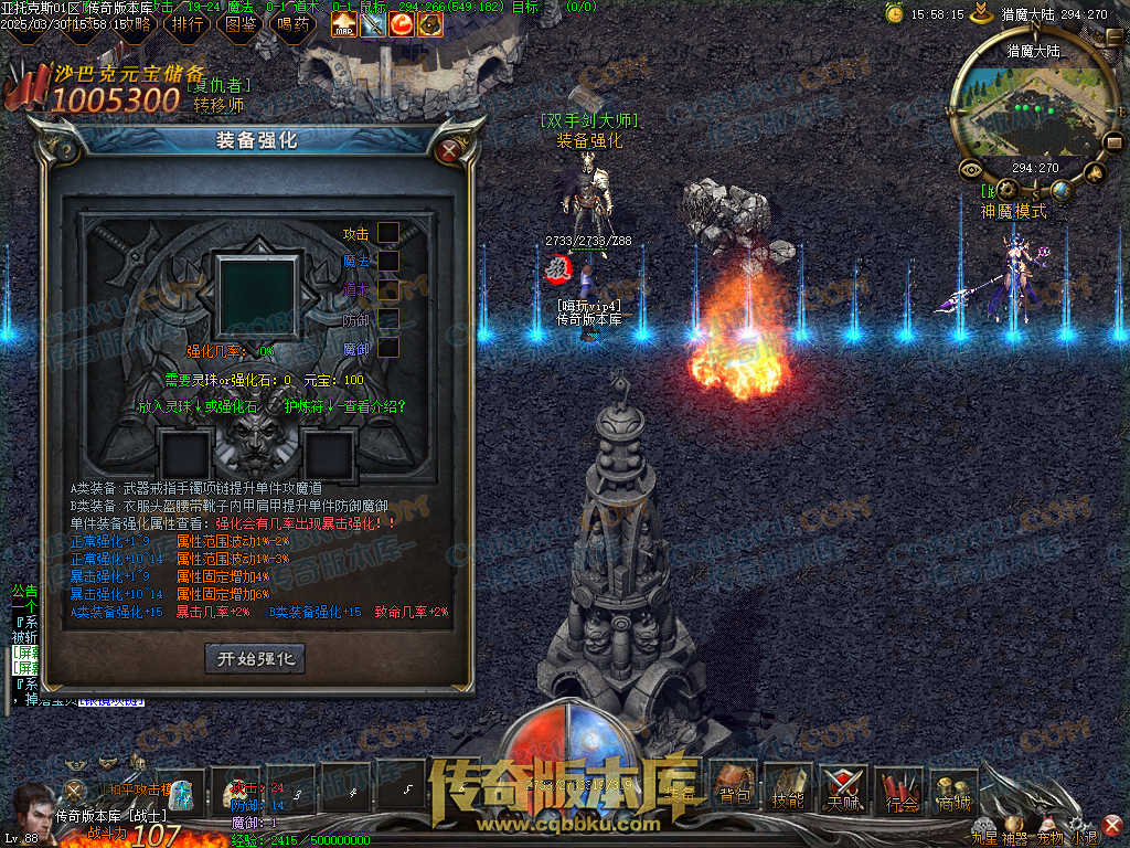 装备强化:小怪出产灵珠,可去装备强化NPC强化装备、装备强化可转移