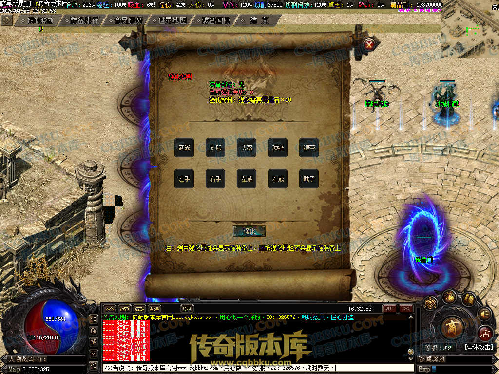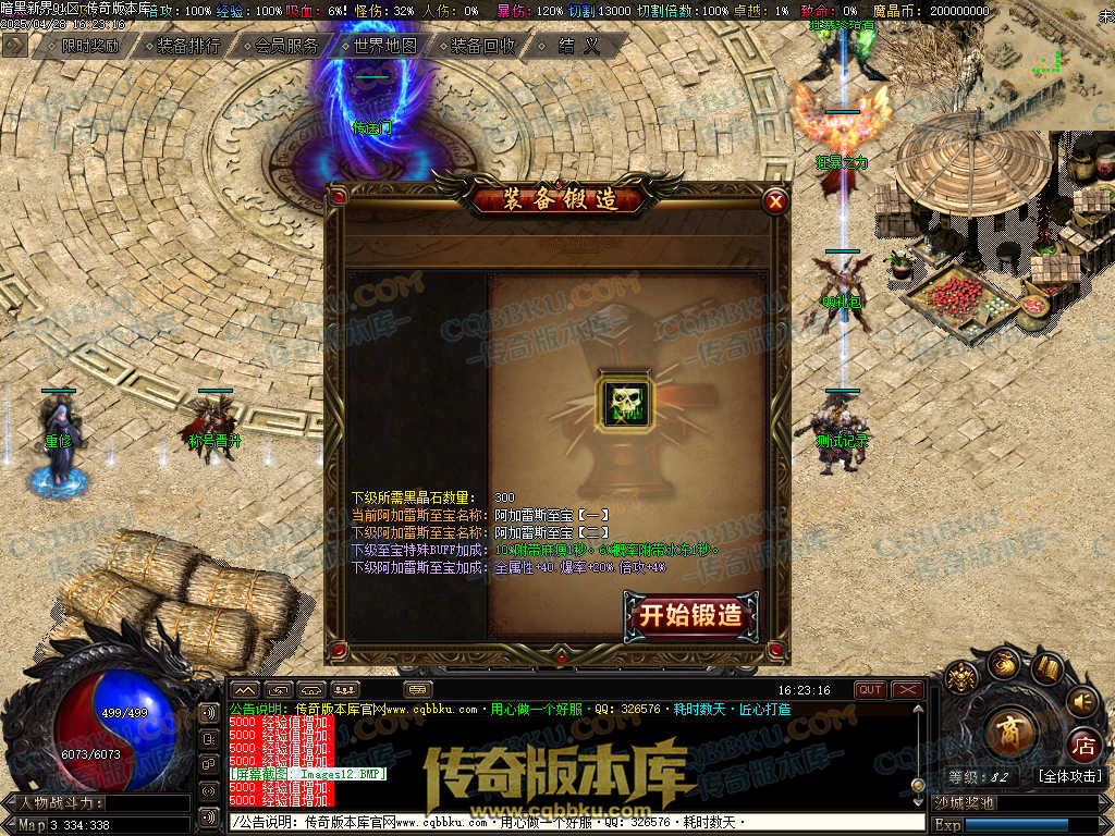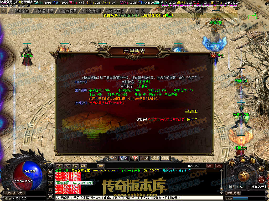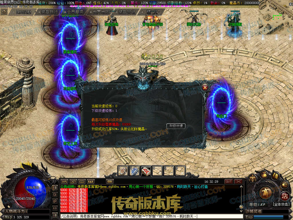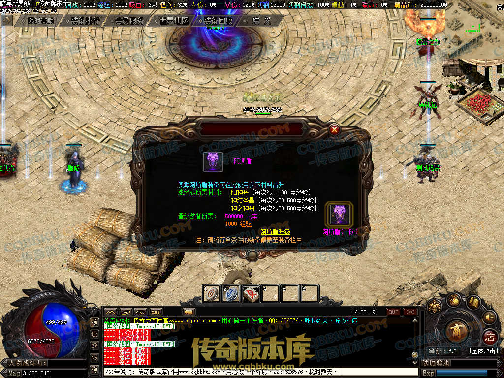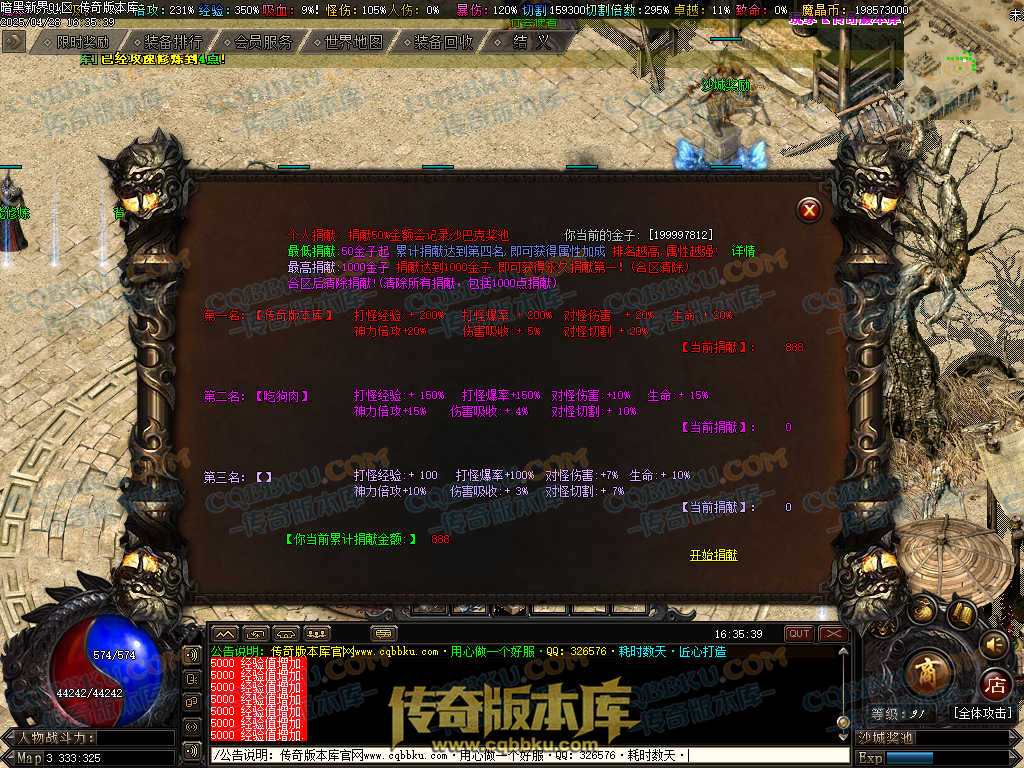 沙城捐献20元金子:爆率50%打怪经验50%切割倍数+5% 攻速+5 吸血+3% 人物倍攻+5% 对怪伤害5% 生命+5%