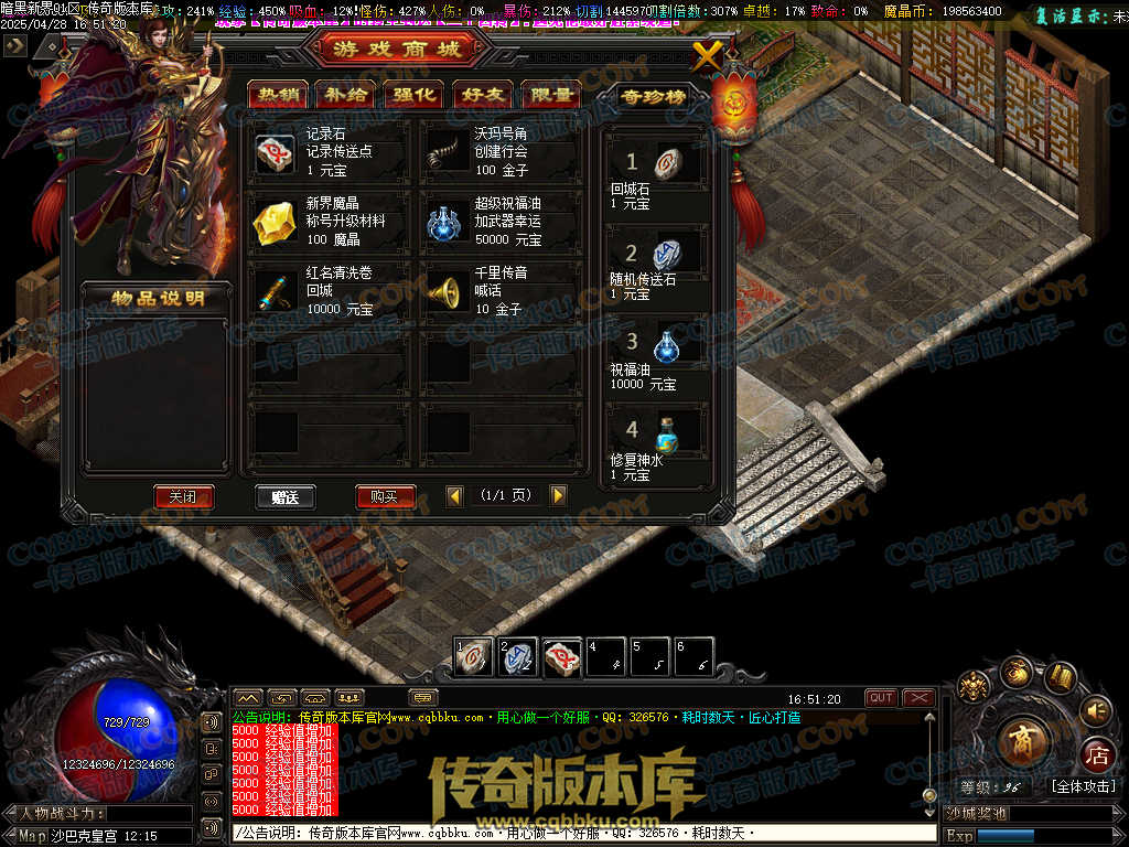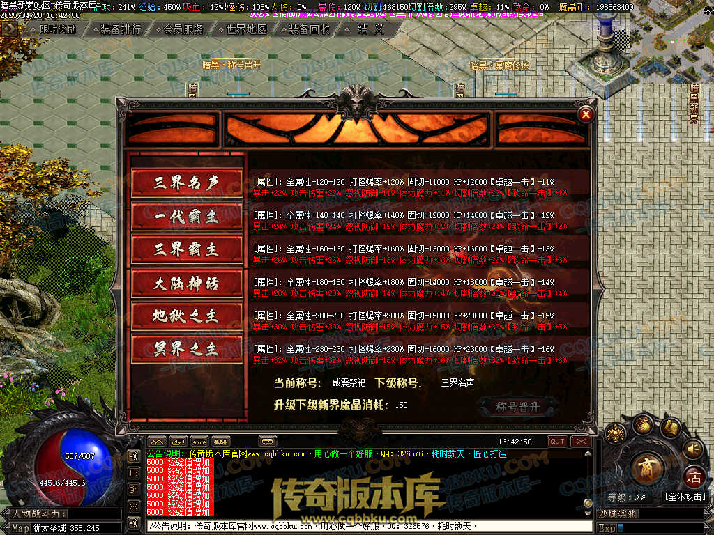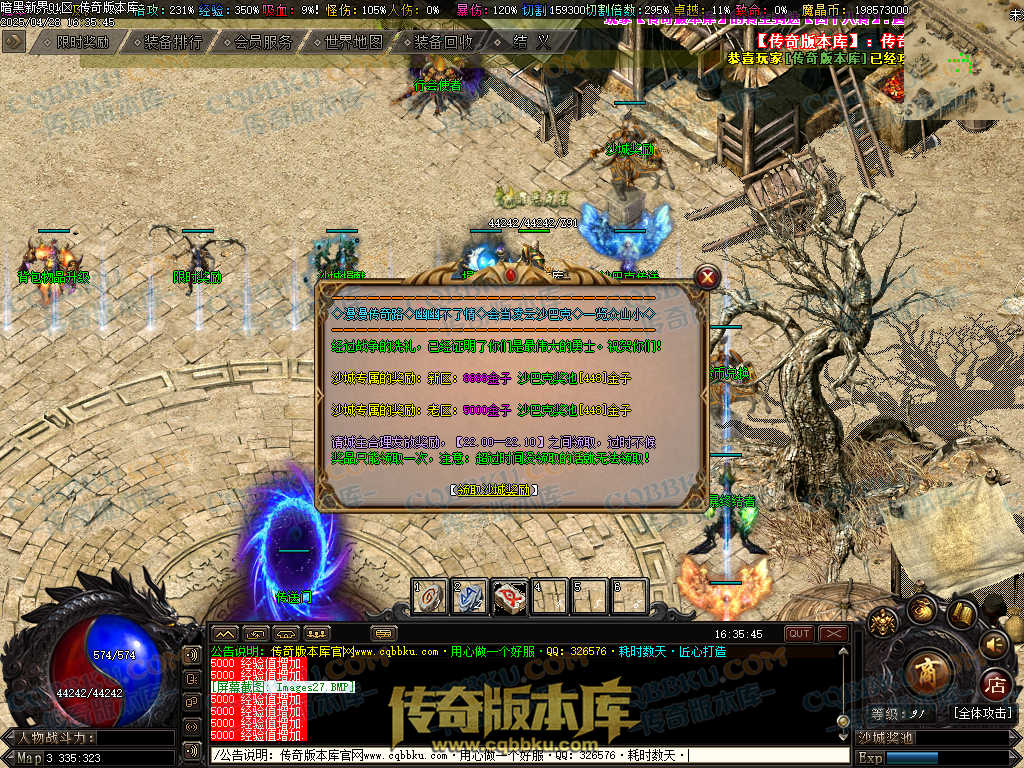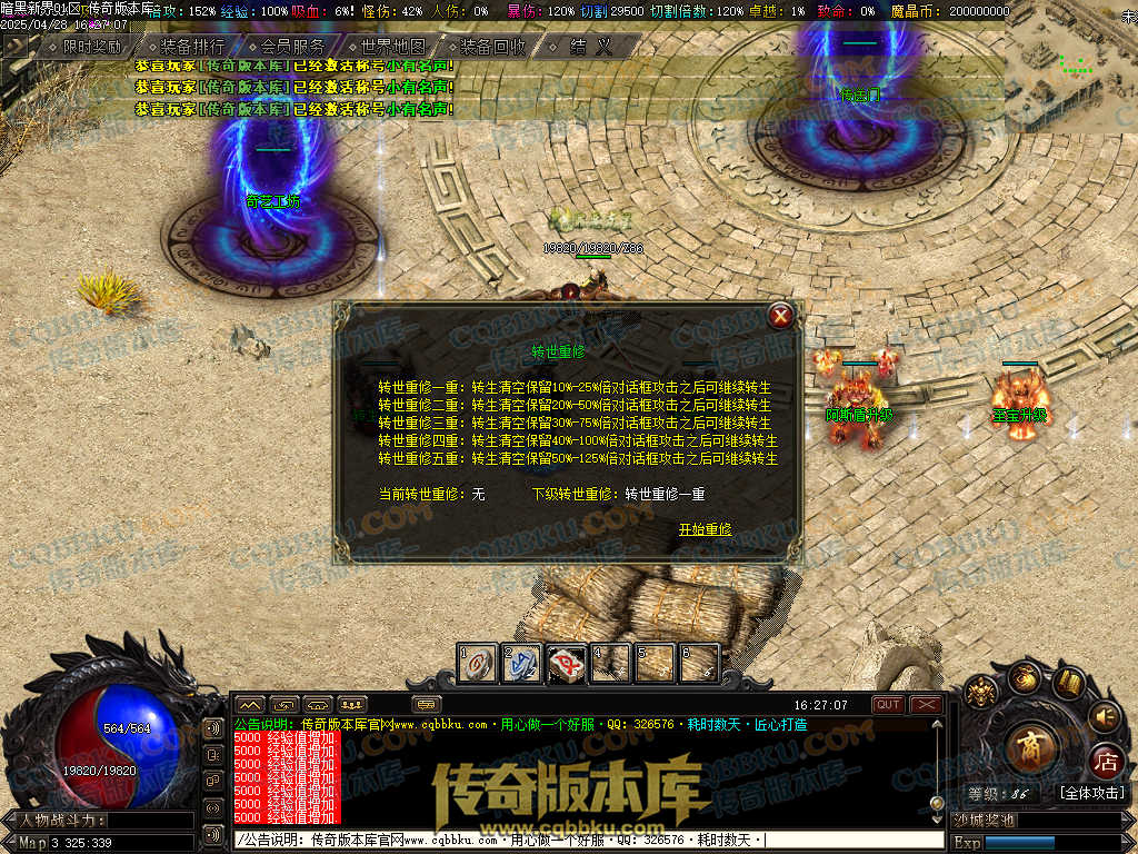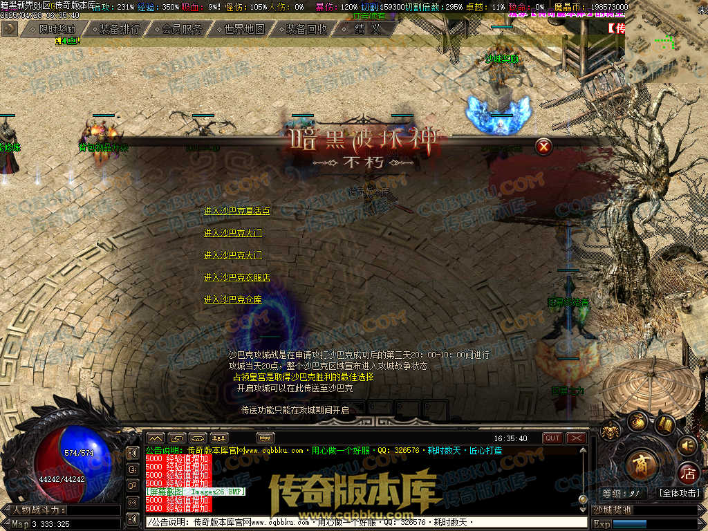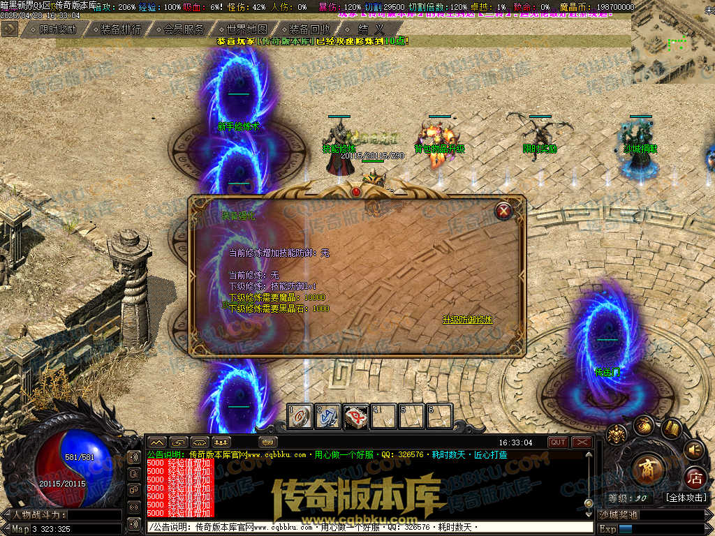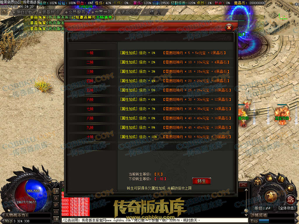 沙城捐献20元金子:爆率50%打怪经验50%切割倍数+5% 攻速+5 吸血+3% 人物倍攻+5% 对怪伤害5% 生命+5%