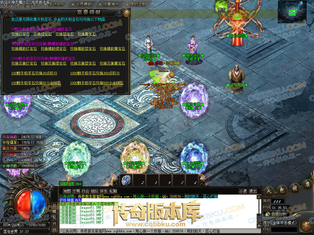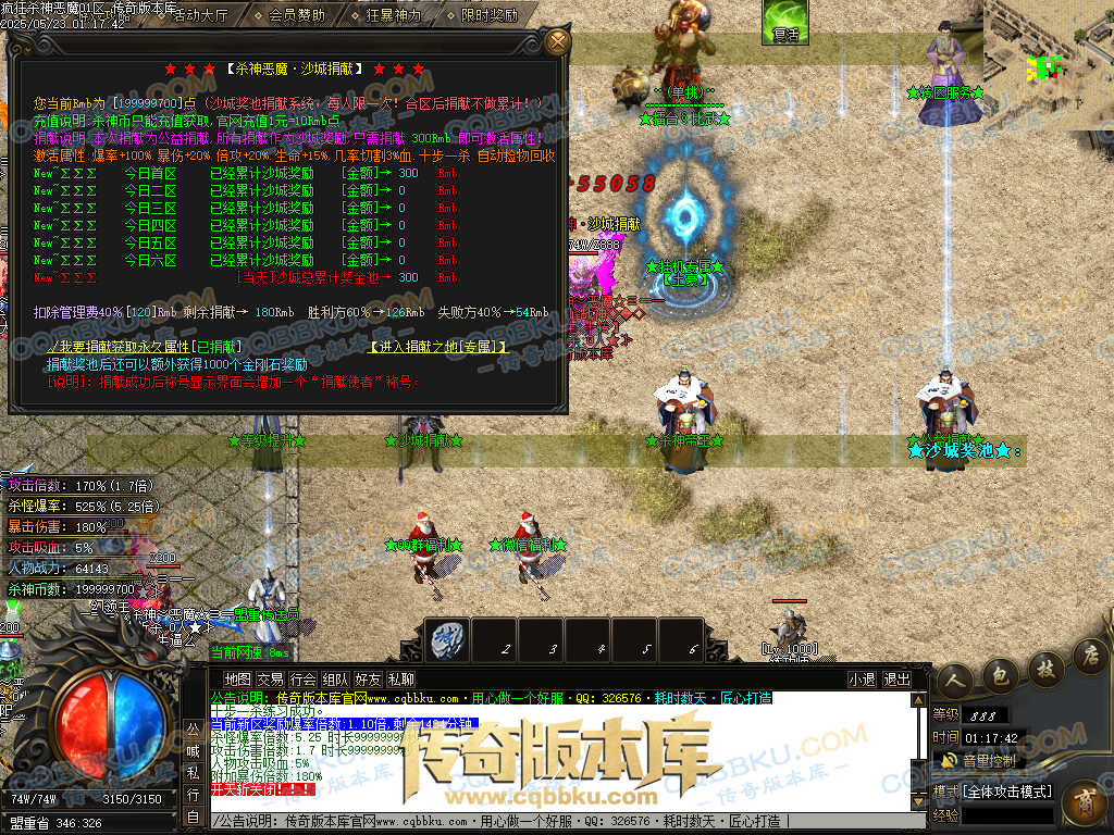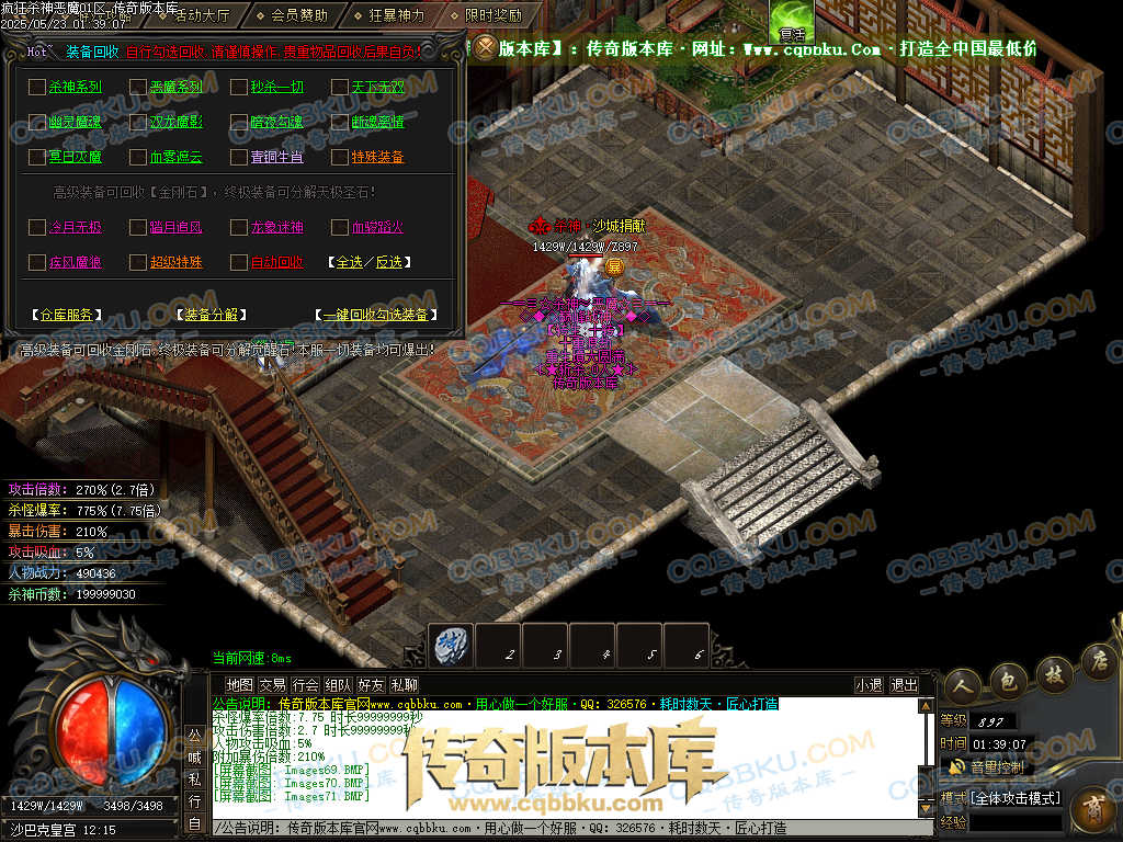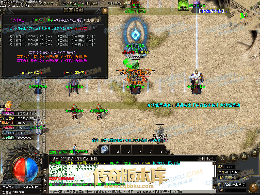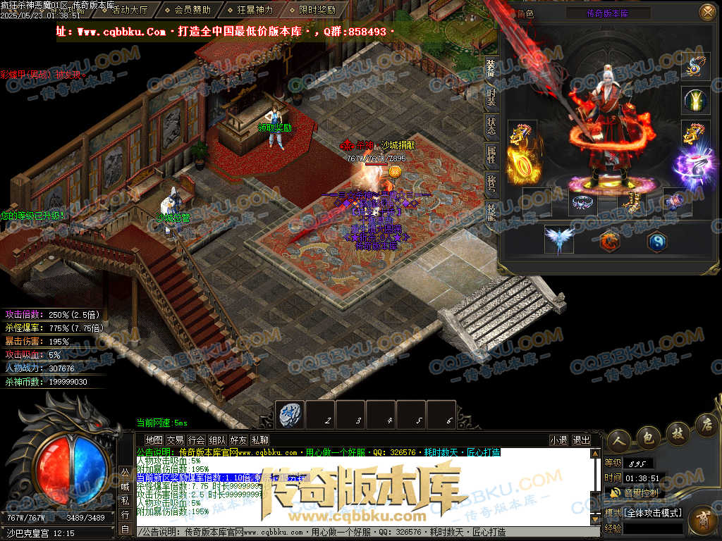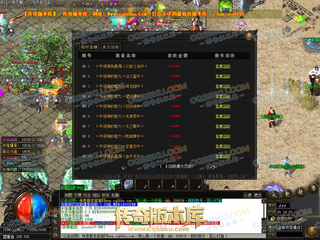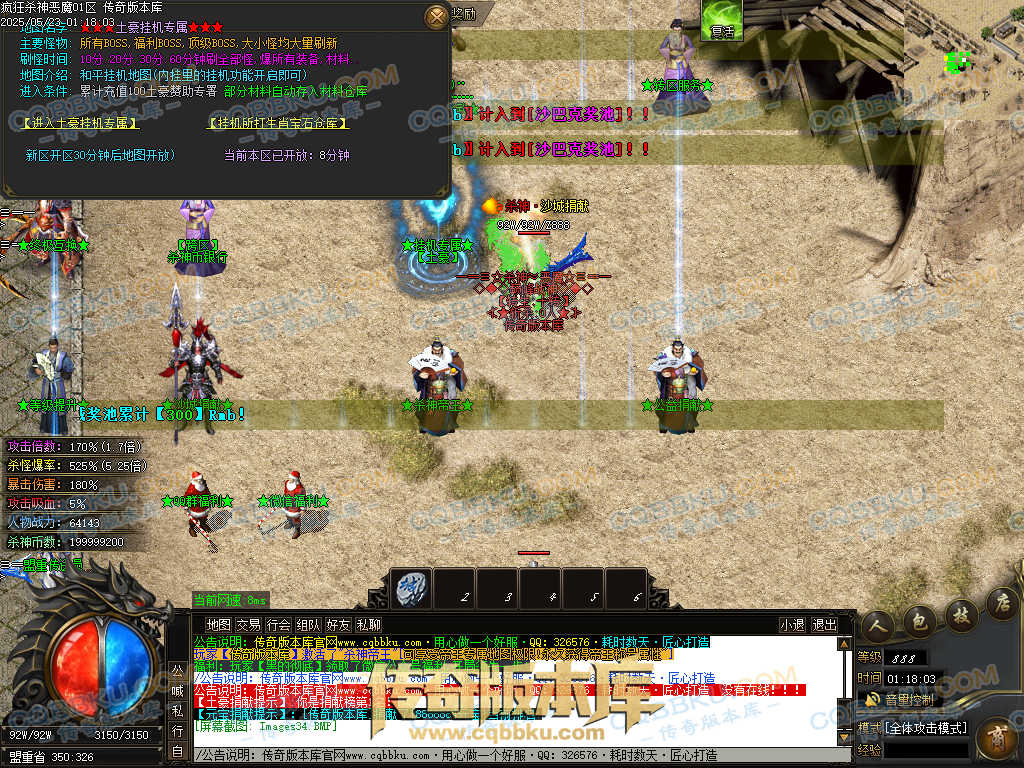 4.沙捐=300殺神币(30元充杀神币),可获得永久切割怪物属性(与赞助叠加),专属打宝地图,自动捡物回收