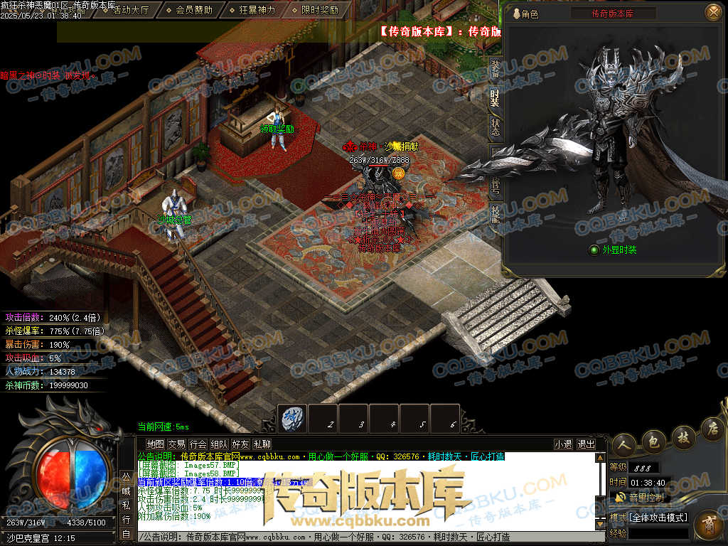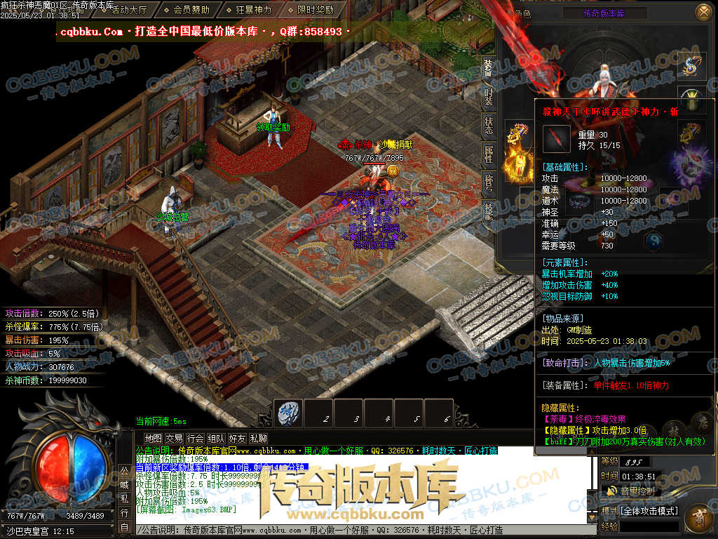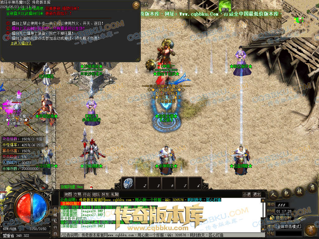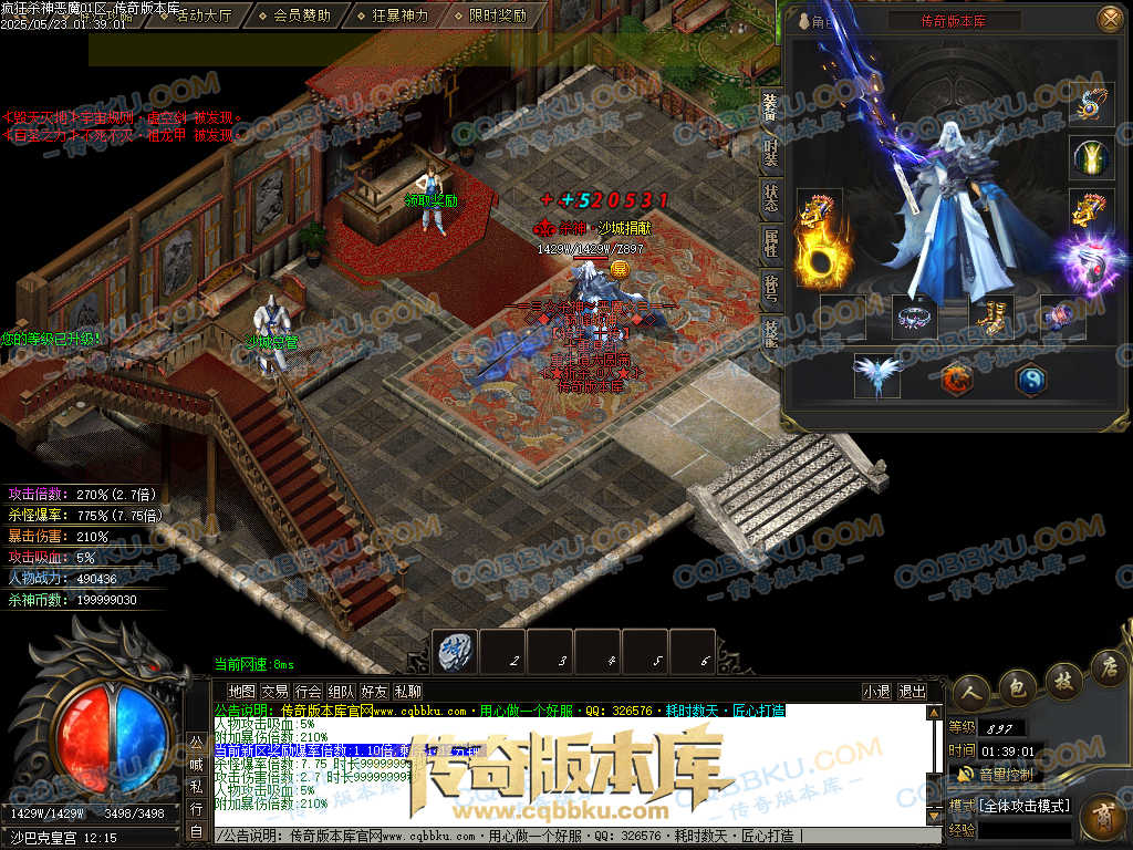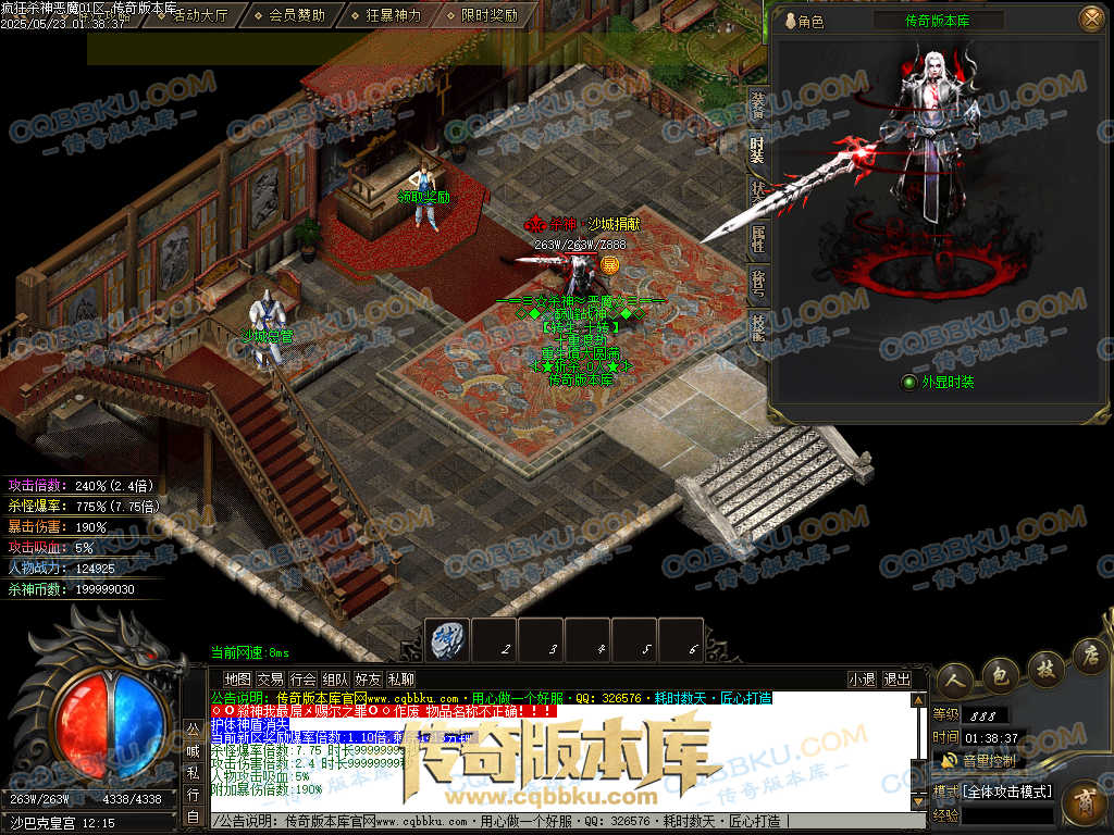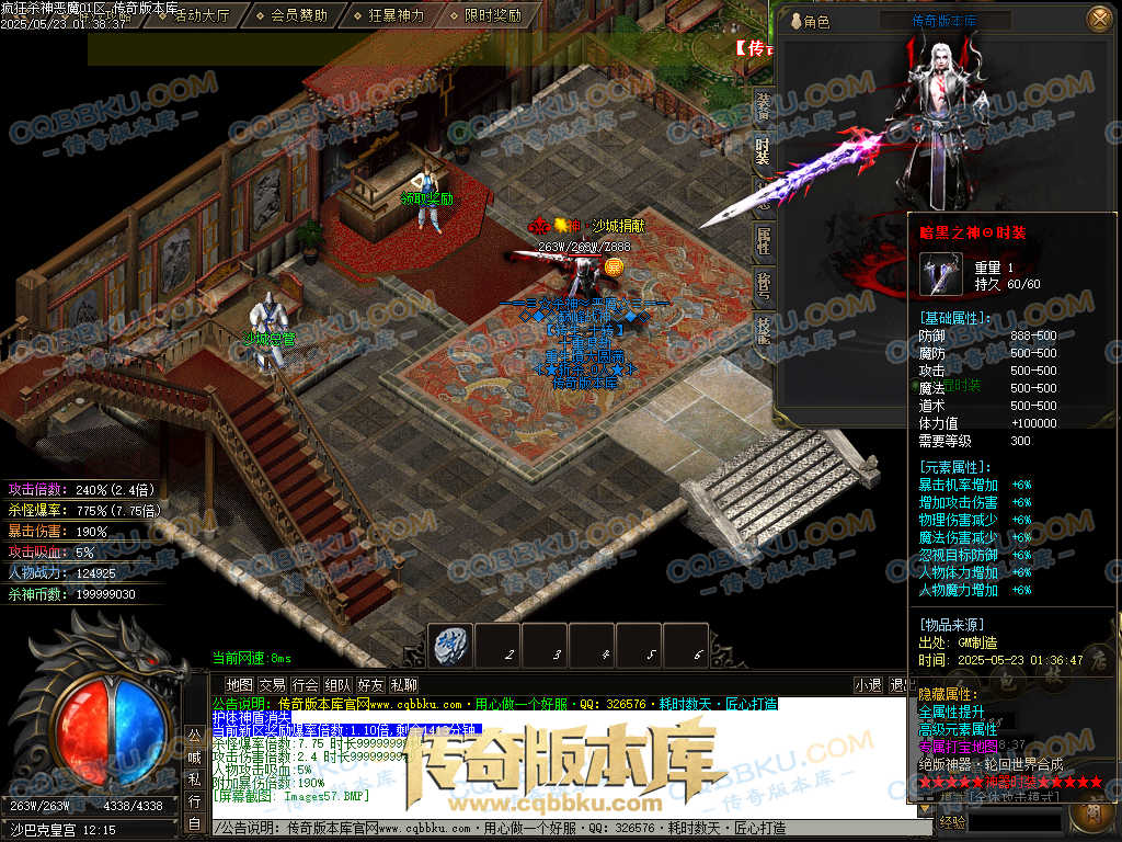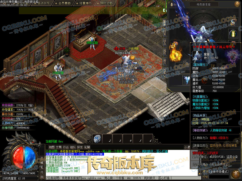 4.沙捐=300殺神币(30元充杀神币),可获得永久切割怪物属性(与赞助叠加),专属打宝地图,自动捡物回收