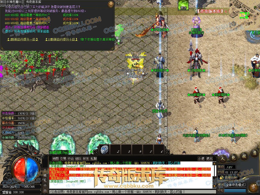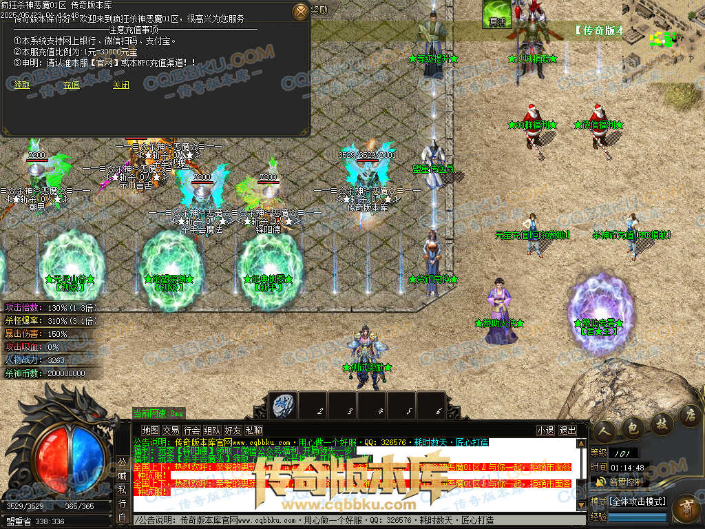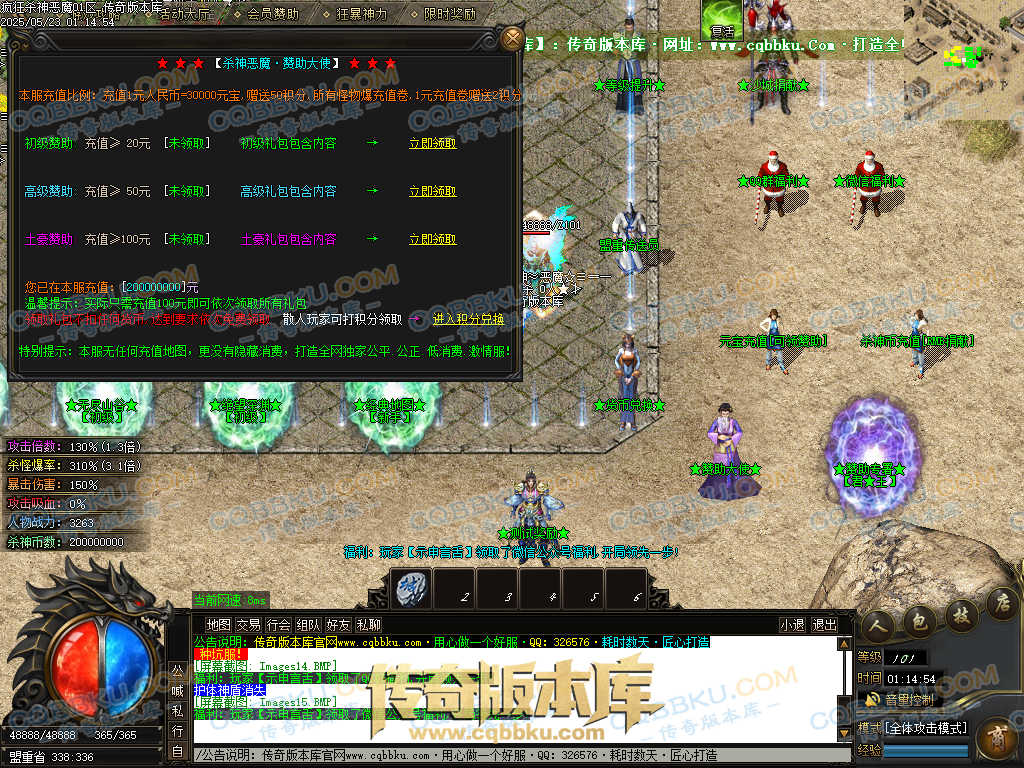 3.土豪赞助:100元(充元宝),一、二大陆安全挂机地图,永久终极属性提升(爆率、切割、鞭尸)