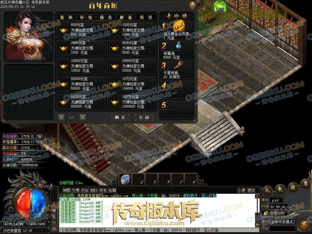 2.高级赞助:50元(充元宝),开通自动挂机功能,一大陆安全挂机地图,永久高级属性提升(爆率、切割、鞭尸)