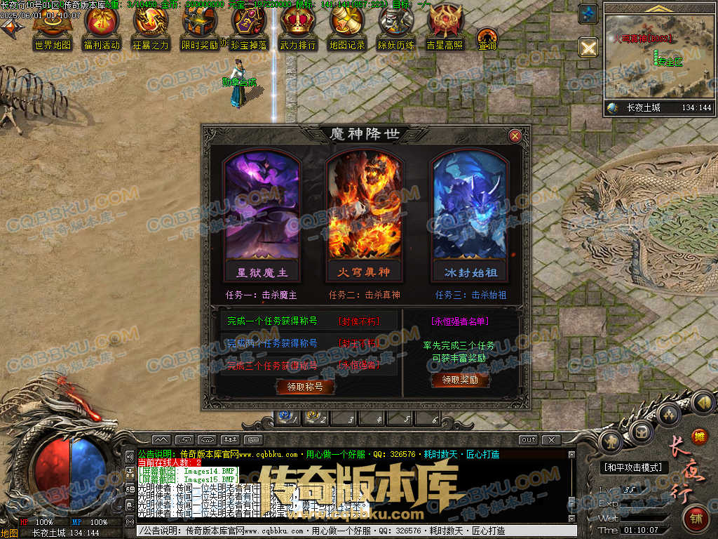11.魔神降世 三大世界BOOS,高几率掉落各种神器专属,挑战成功可获得爆率称号,金盒X5一夜暴富!!!(ps:世界BOSS实力强悍,不是一般人能撼动的)
