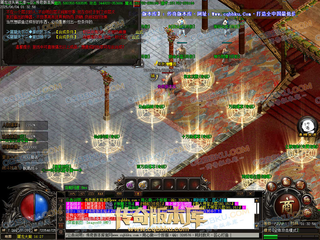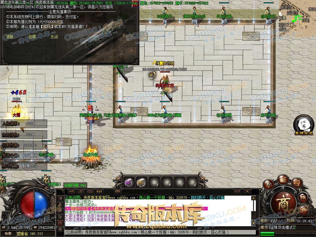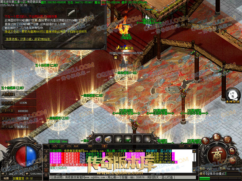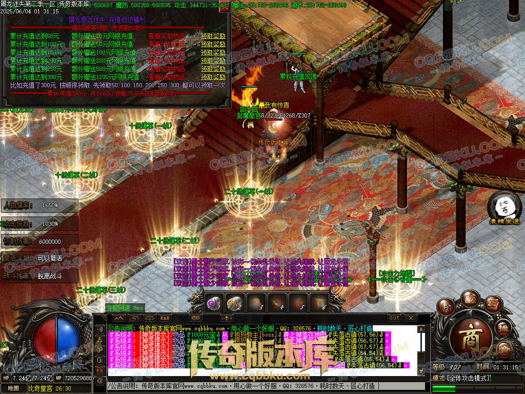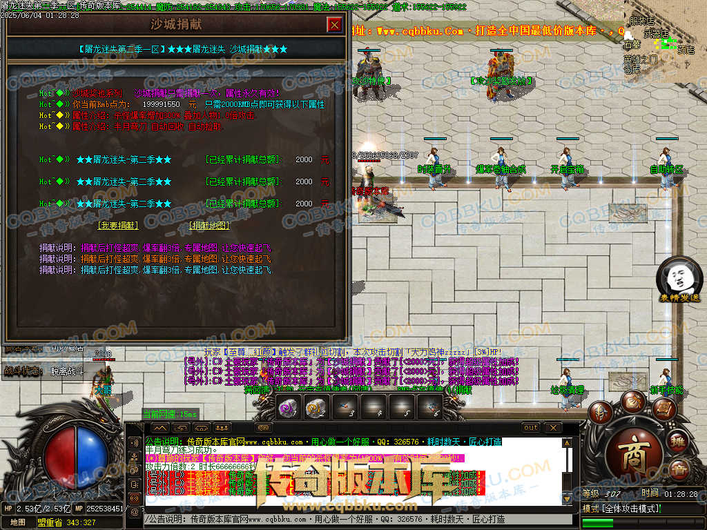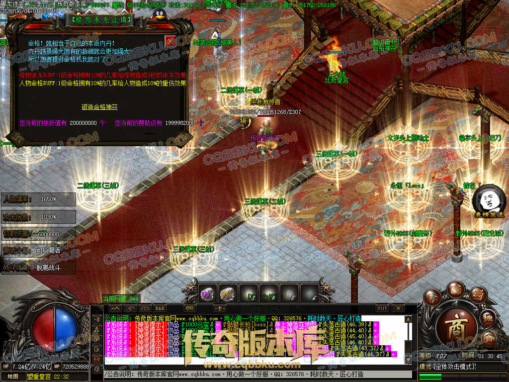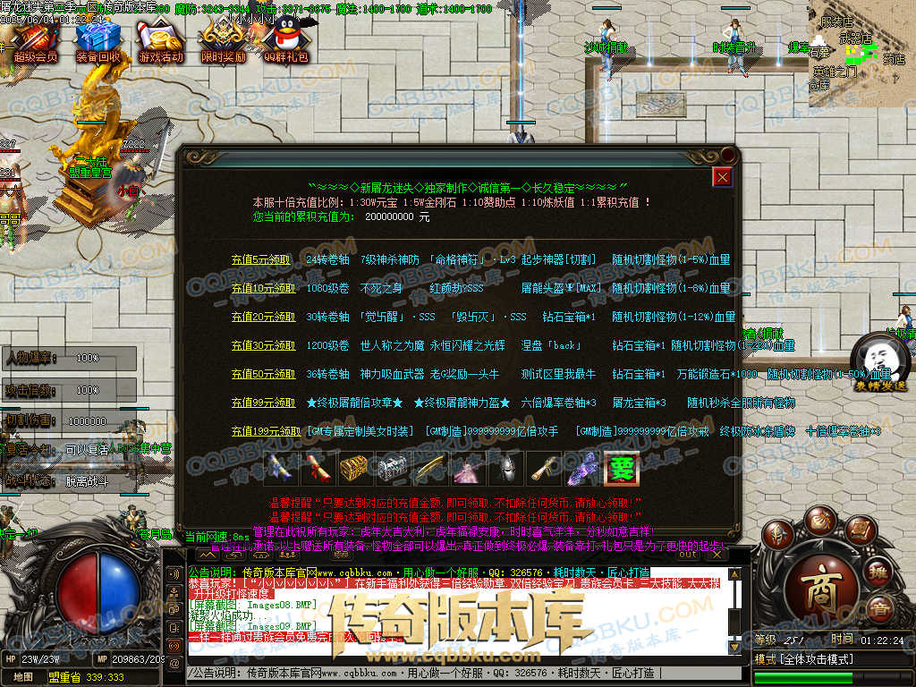 [土豪玩法]:上线充个300元,领取99满回馈礼包,终极屠龙命格,满爆率,100%鞭尸,全屏吸怪,刀刀冰冻,简称行走的推土机,进入地图 吸怪 用龙影 几刀全秒,进入任何地图都全清,因为所有怪都有可能给你爆好装备.领取此回馈,至少让你少奋斗24小时!!