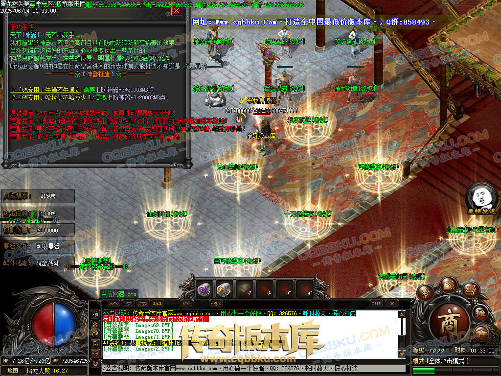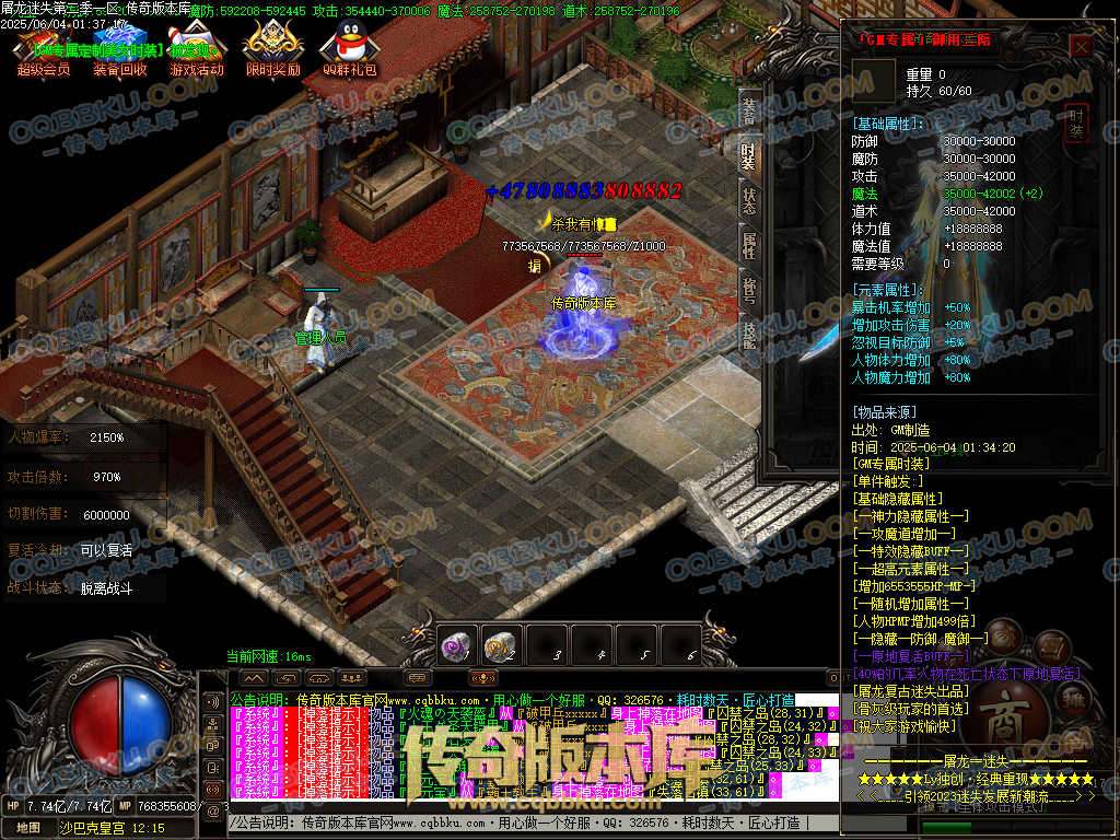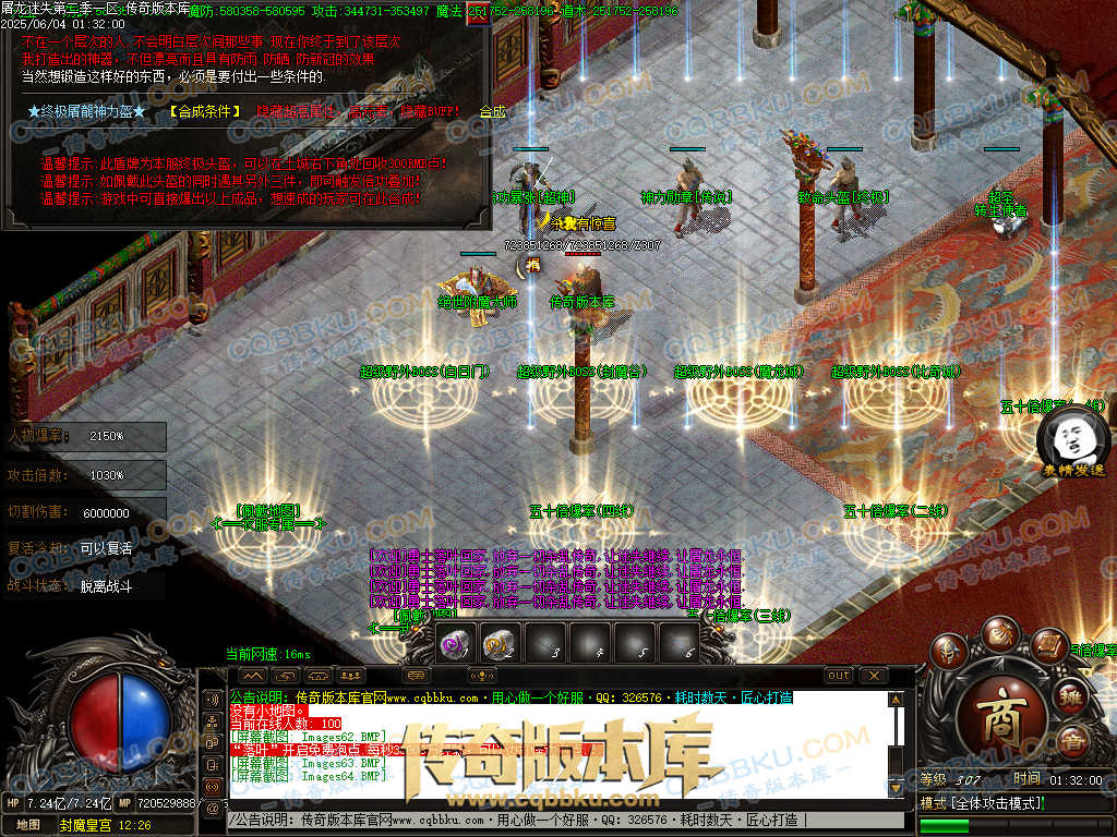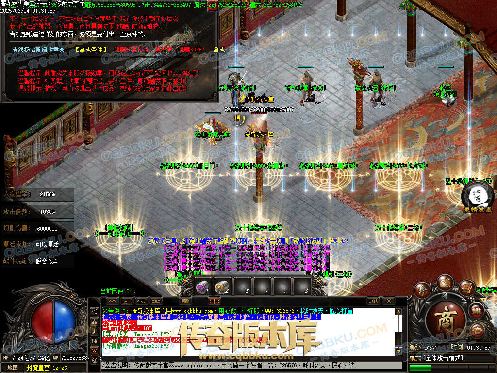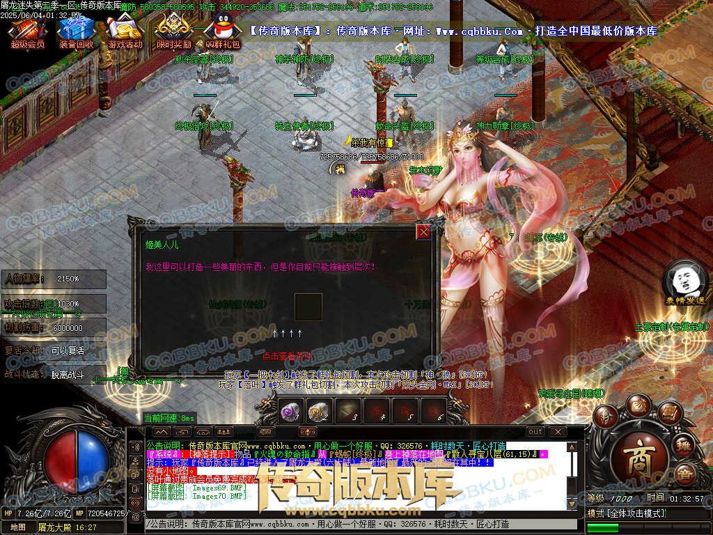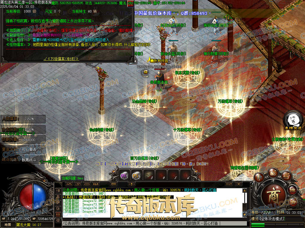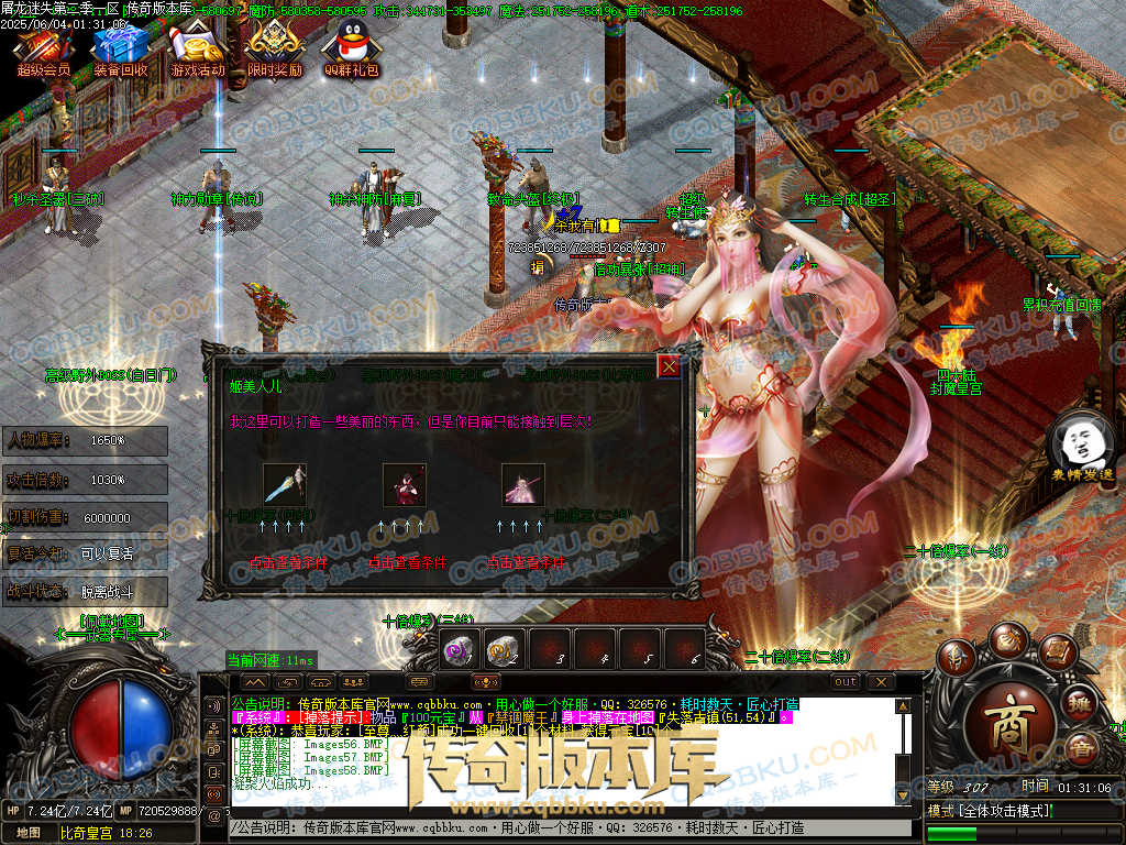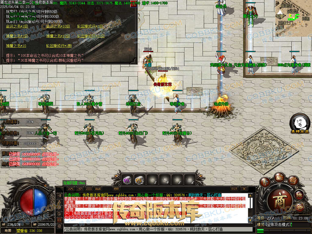 [土豪玩法]:上线充个300元,领取99满回馈礼包,终极屠龙命格,满爆率,100%鞭尸,全屏吸怪,刀刀冰冻,简称行走的推土机,进入地图 吸怪 用龙影 几刀全秒,进入任何地图都全清,因为所有怪都有可能给你爆好装备.领取此回馈,至少让你少奋斗24小时!!