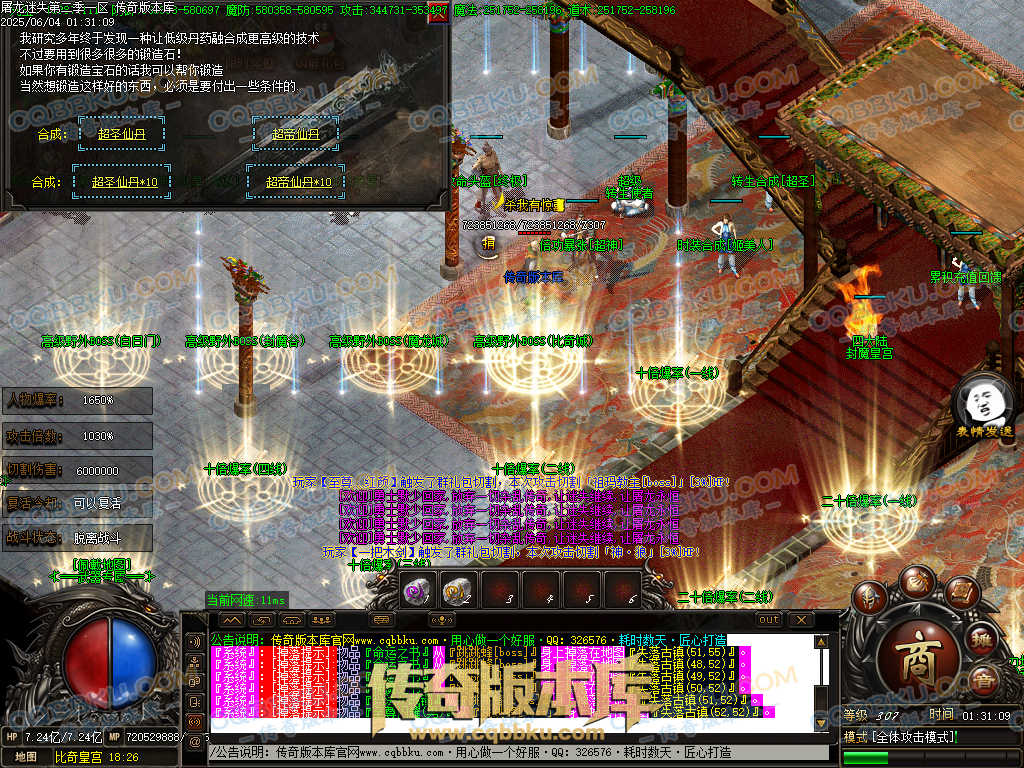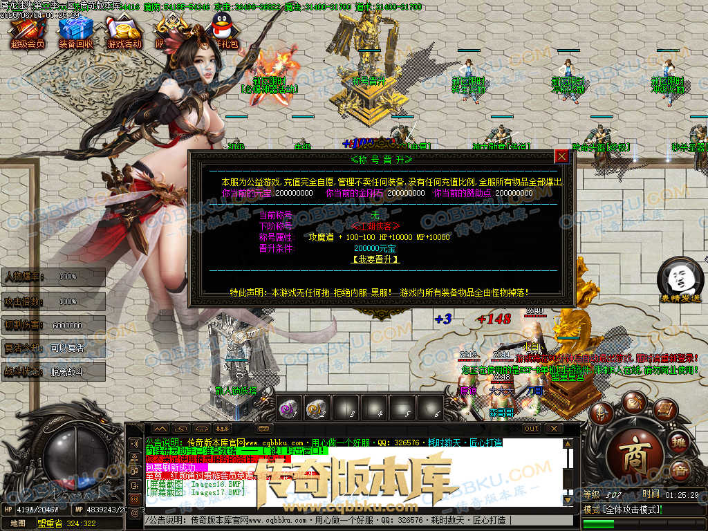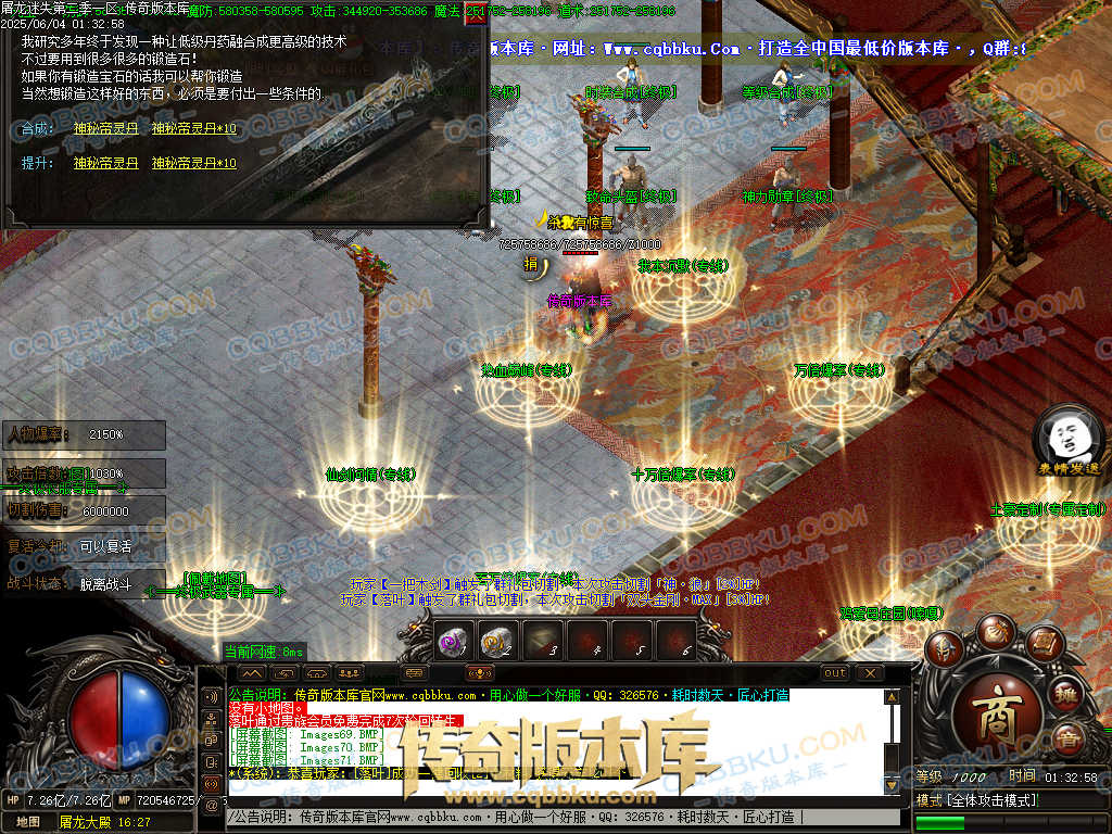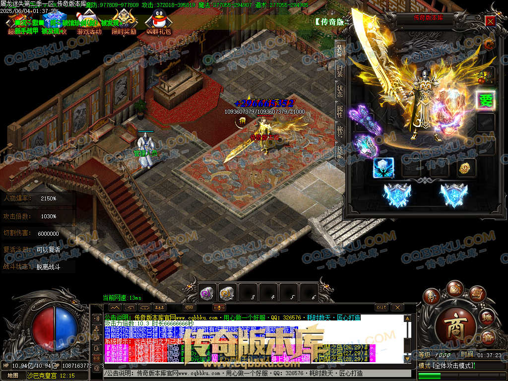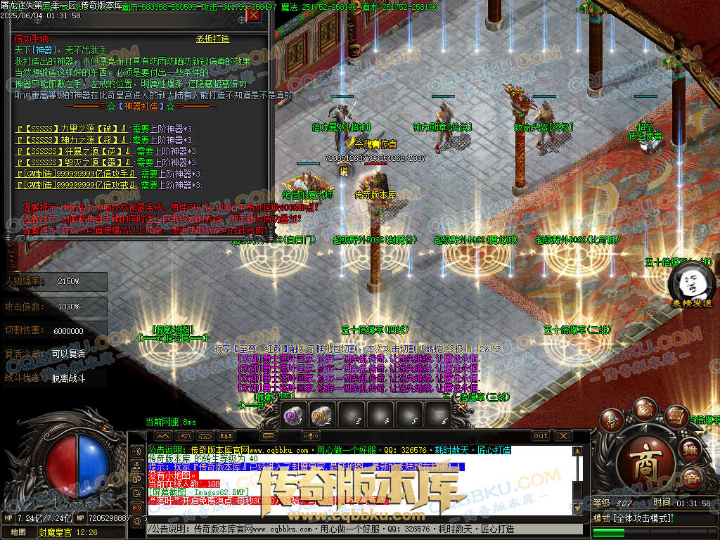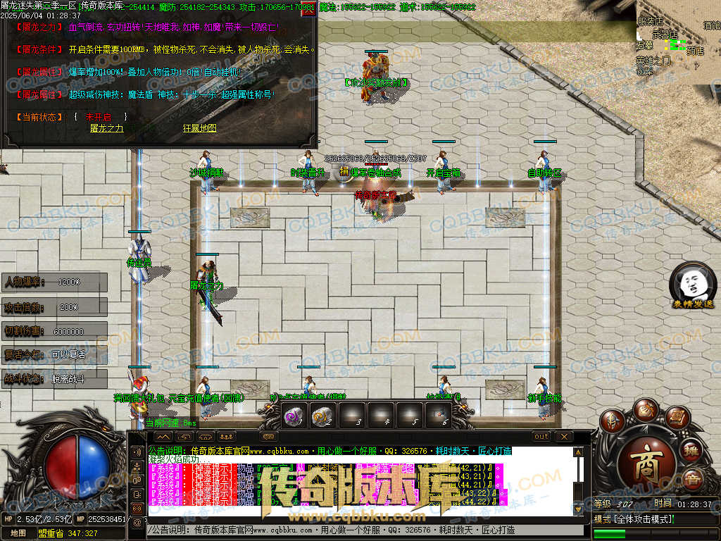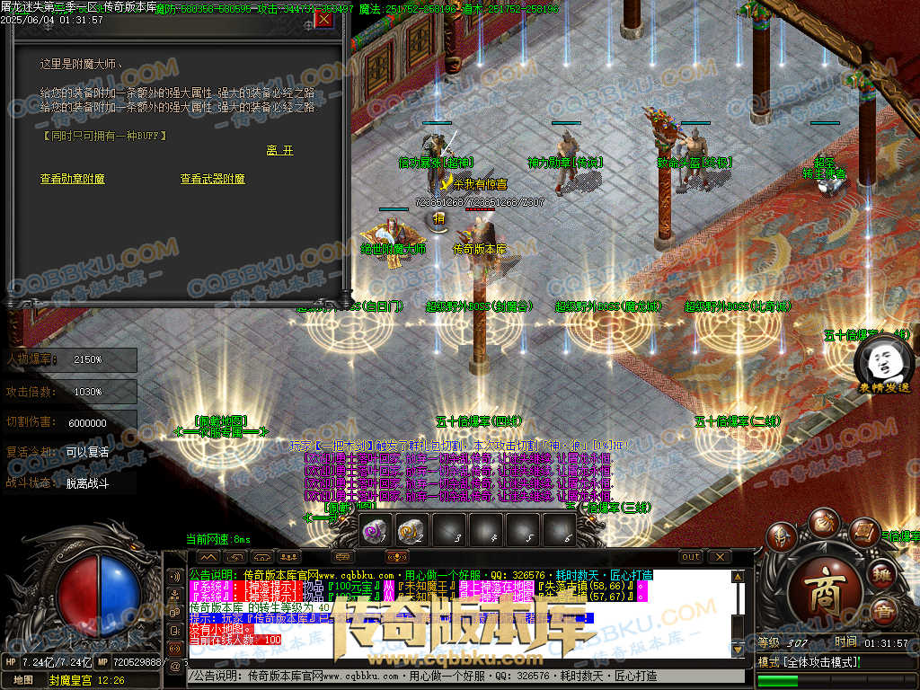 [土豪玩法]:上线充个300元,领取99满回馈礼包,终极屠龙命格,满爆率,100%鞭尸,全屏吸怪,刀刀冰冻,简称行走的推土机,进入地图 吸怪 用龙影 几刀全秒,进入任何地图都全清,因为所有怪都有可能给你爆好装备.领取此回馈,至少让你少奋斗24小时!!