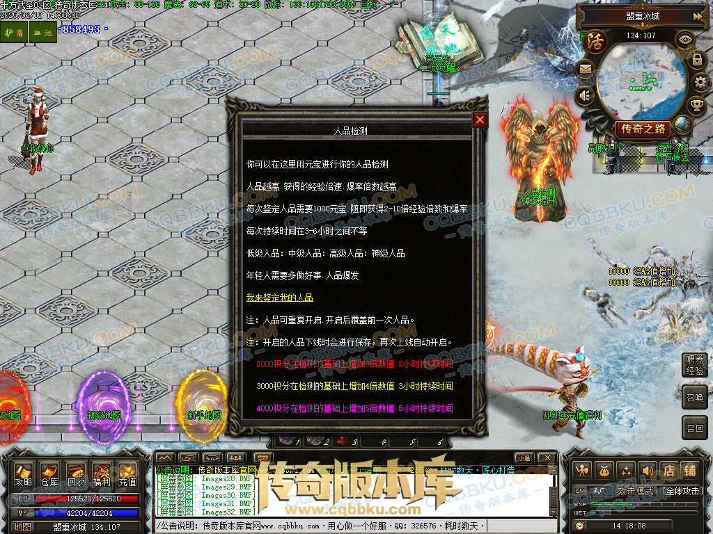 人品越高.获得的经验倍速.爆率倍数越高,每次鉴定人品需要1000元宝.随即获得2-10倍经验倍数和爆率