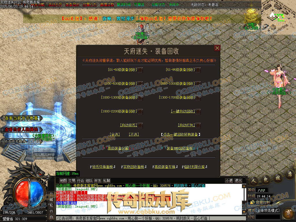 然后打开自动回收,自动吃货币。商城装备打包袋,买来放背包,自动打包√上 ,根据自身等级情况回收RMB装备。