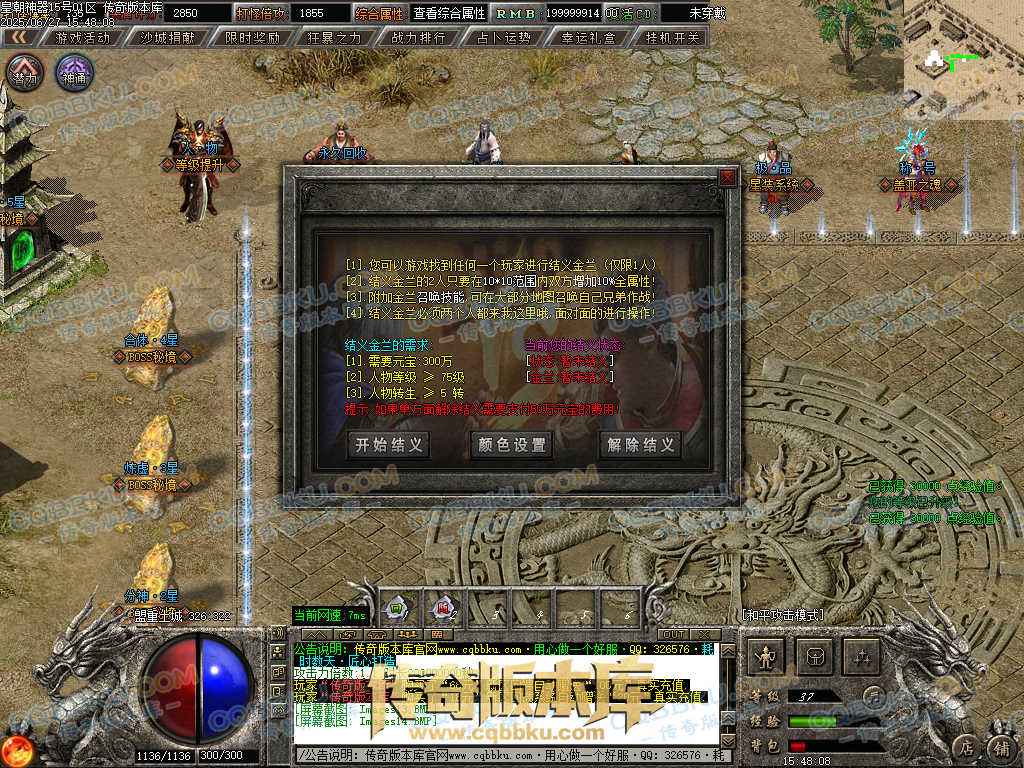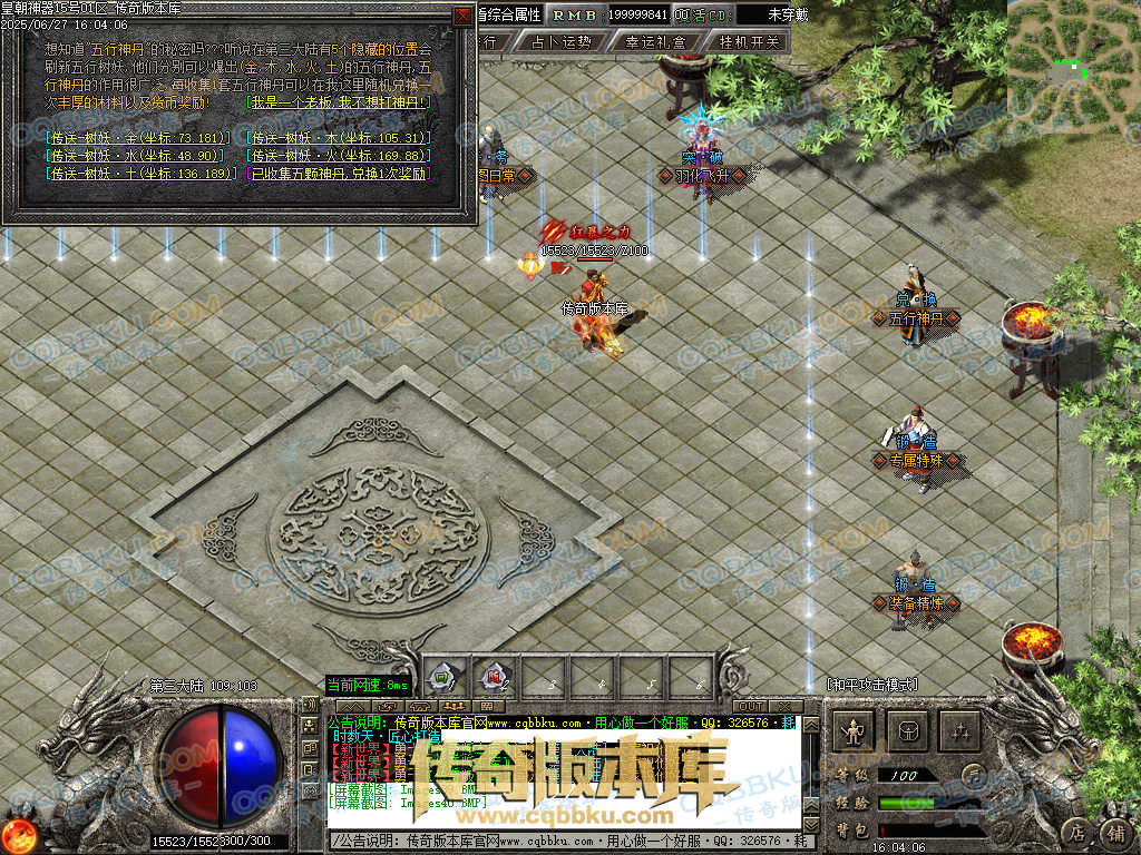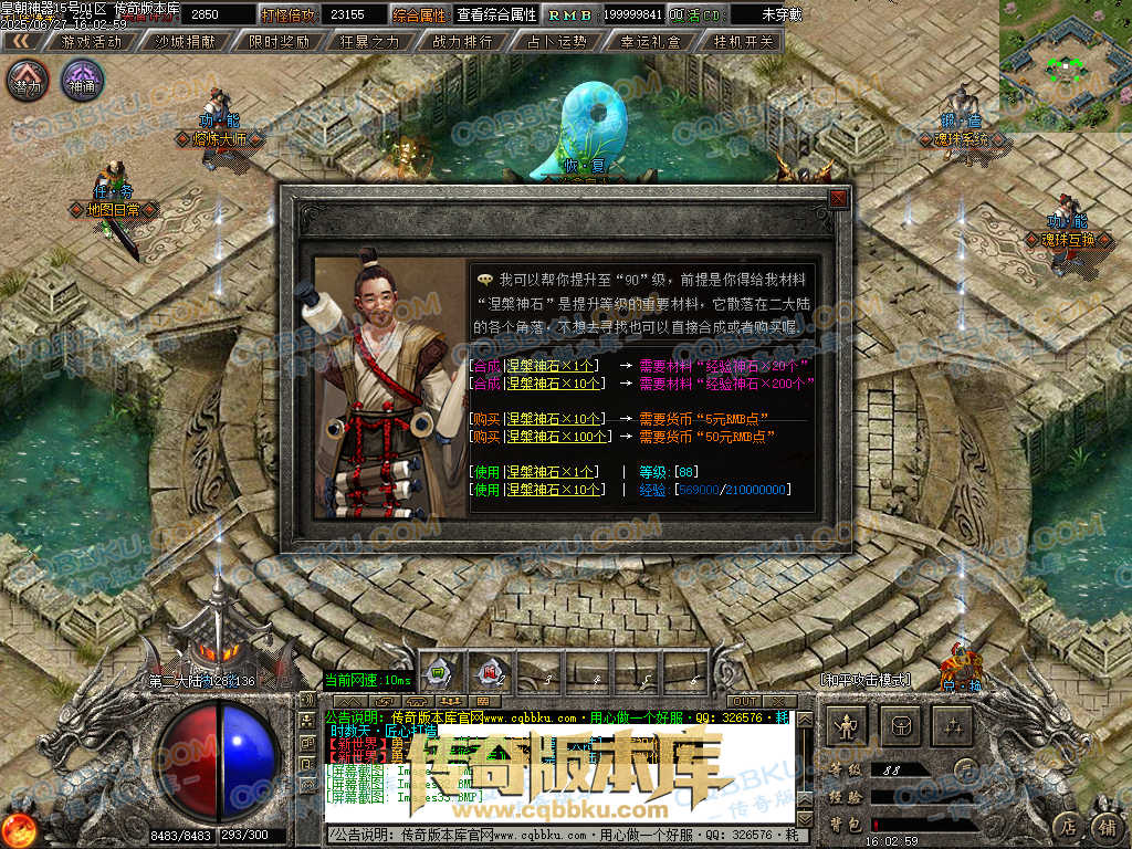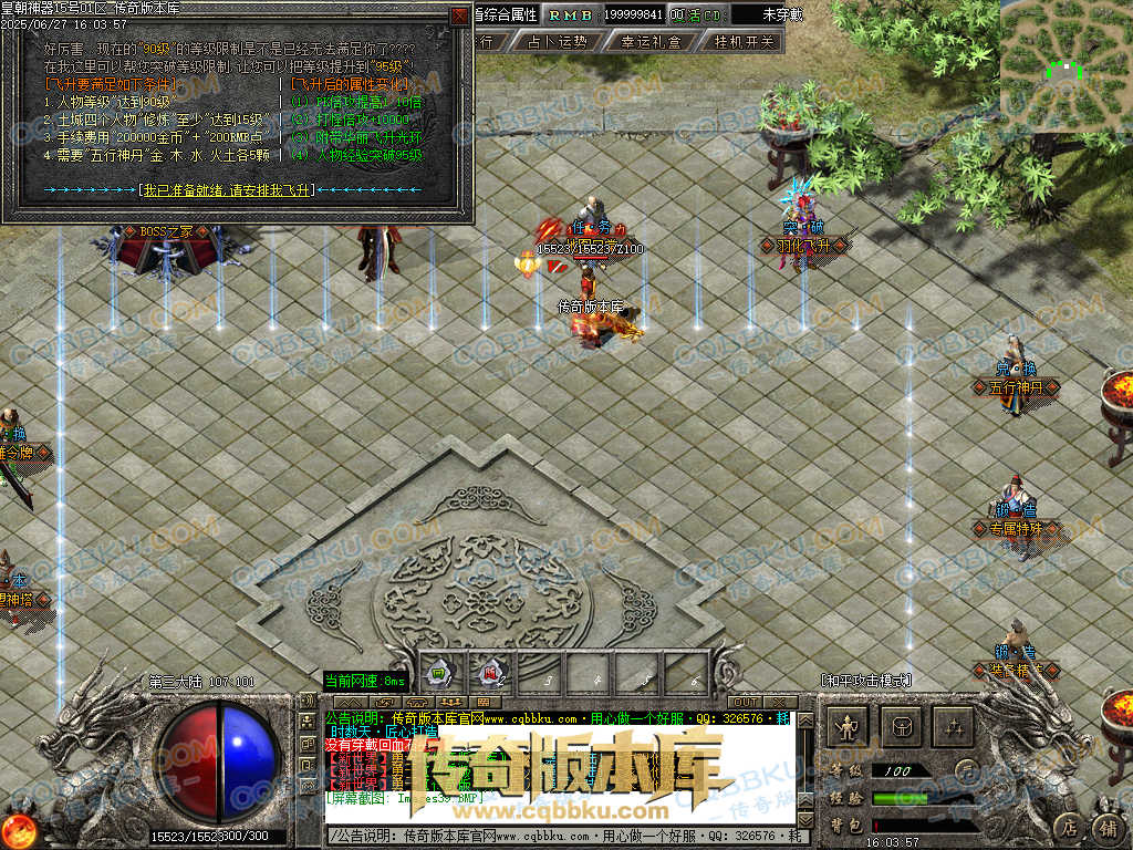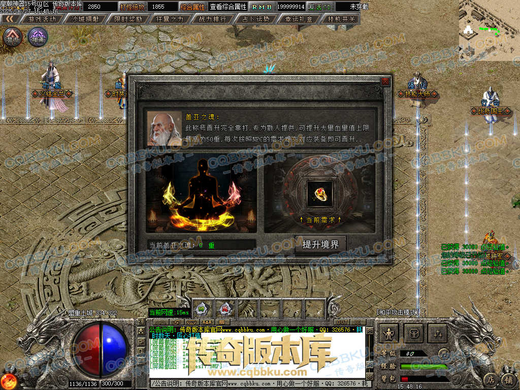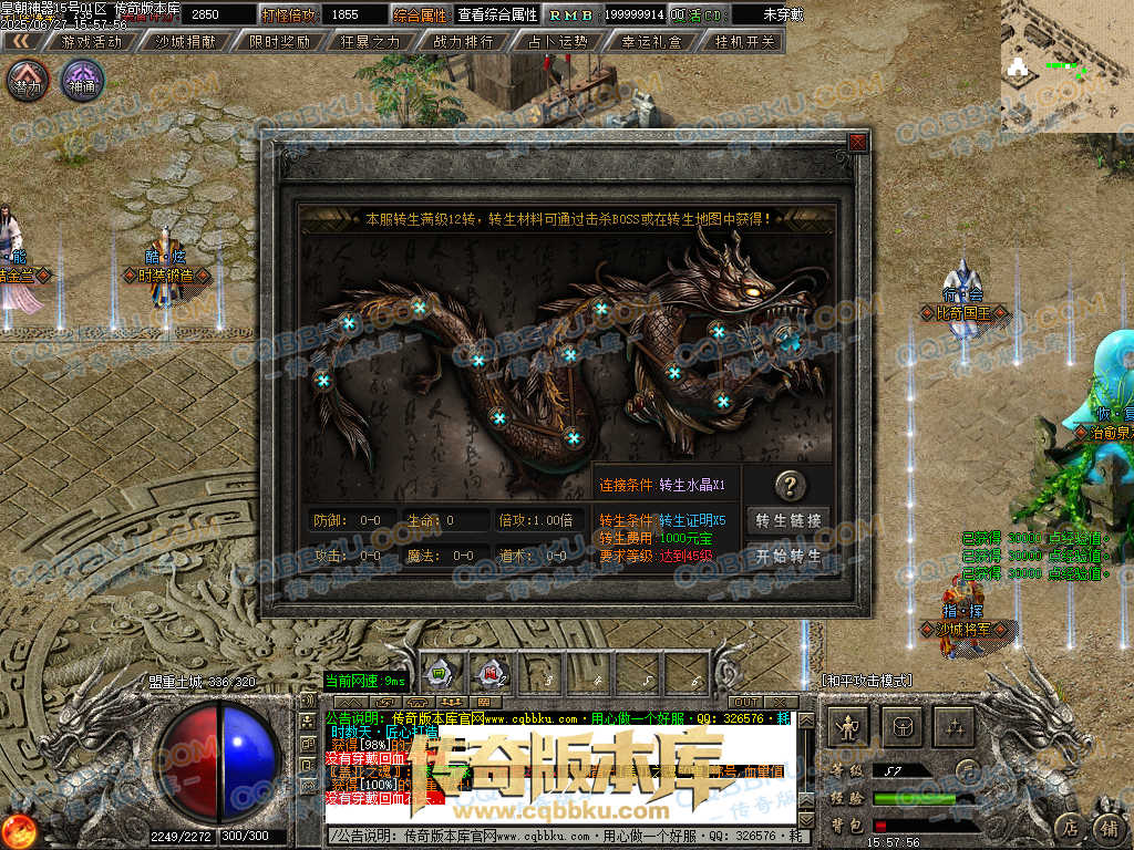 人物飞升, 需要5行丹每种5颗,NPC有怪物传送坐标,土豪玩家可以直接购买,大约950R,金币20W