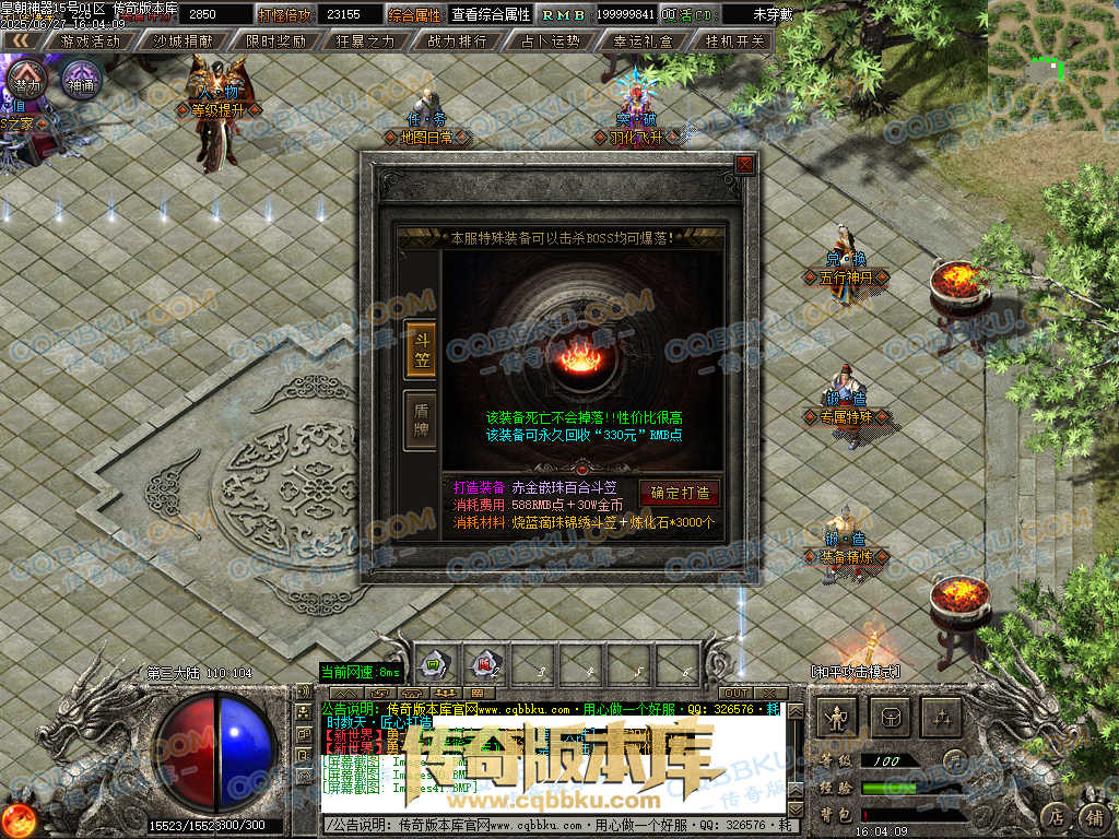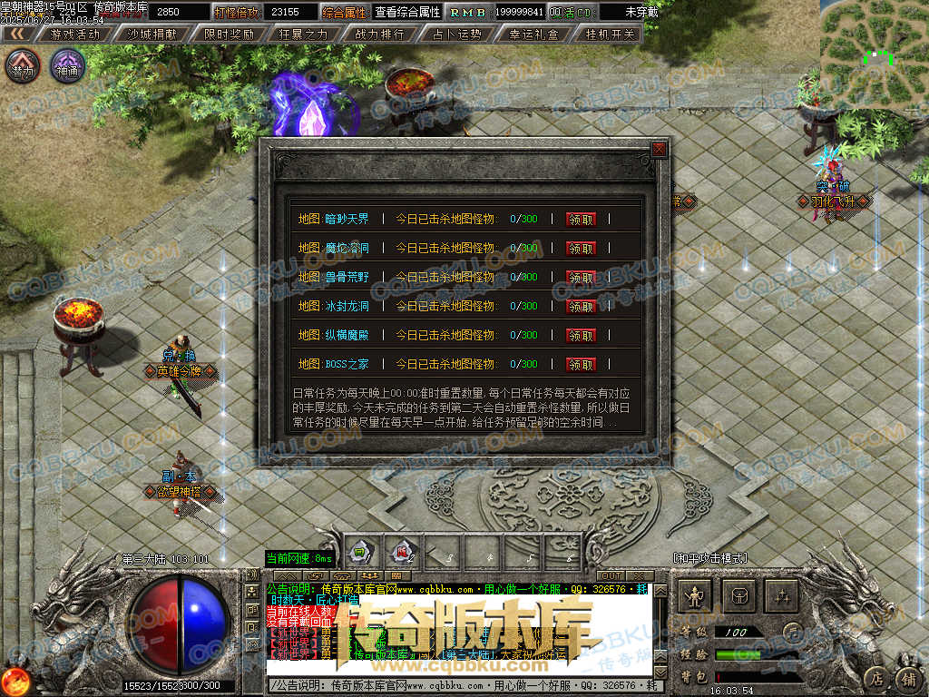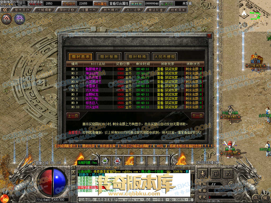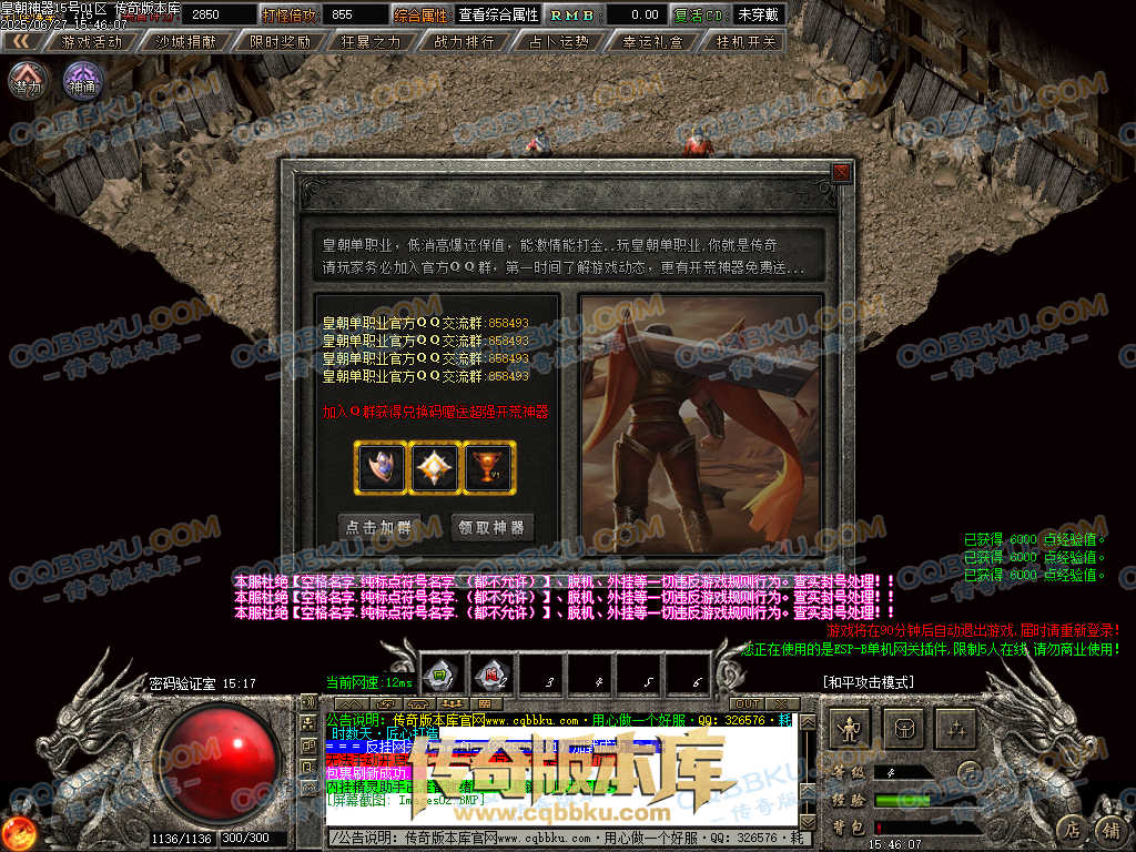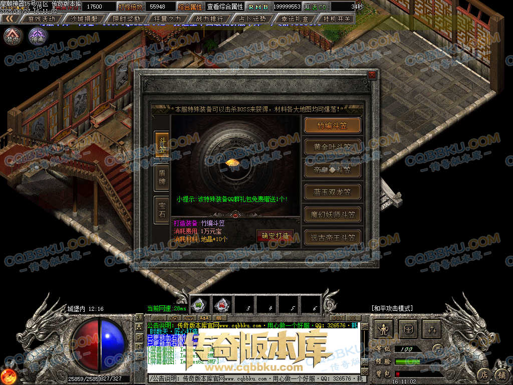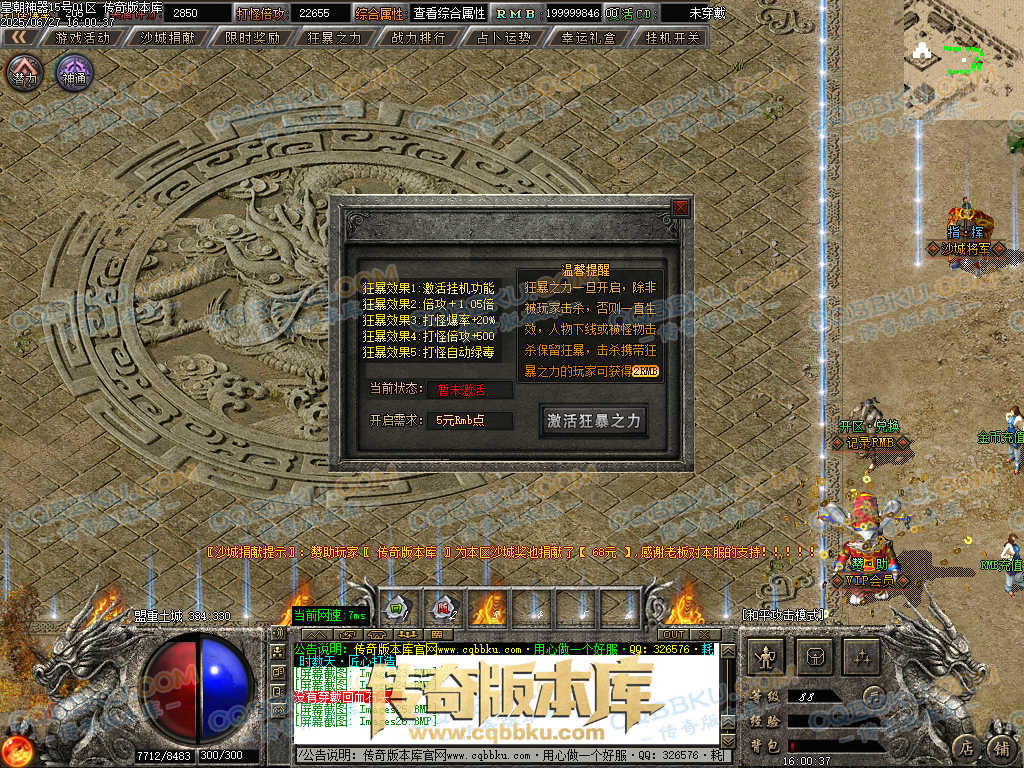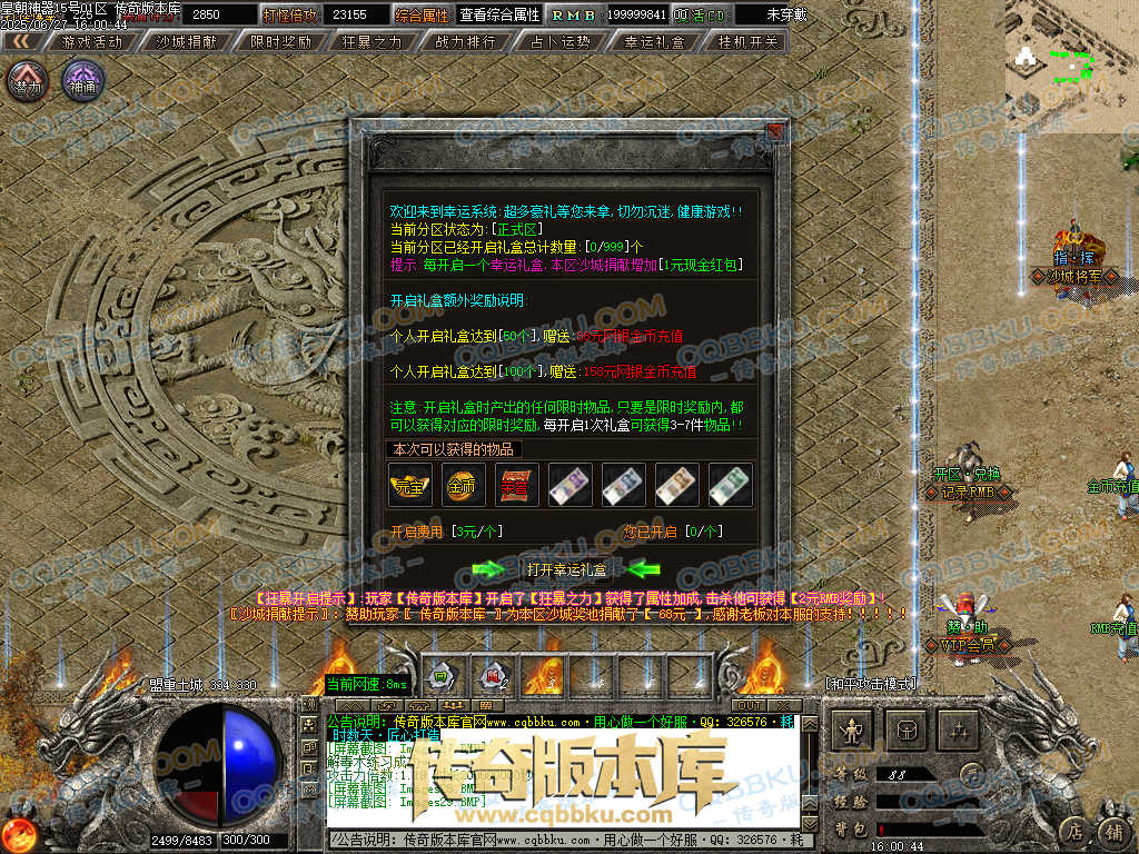 1:上线进行QQ礼包码、微信礼包码兑换:cqbbku 领取公益大礼包;赠送6大特殊、圣杯、符文、神章、斗笠、盾牌、血石;上线赠送自动捡物