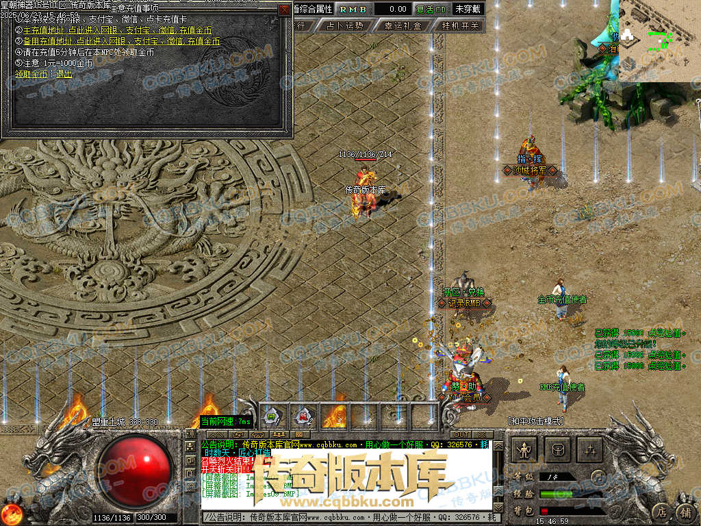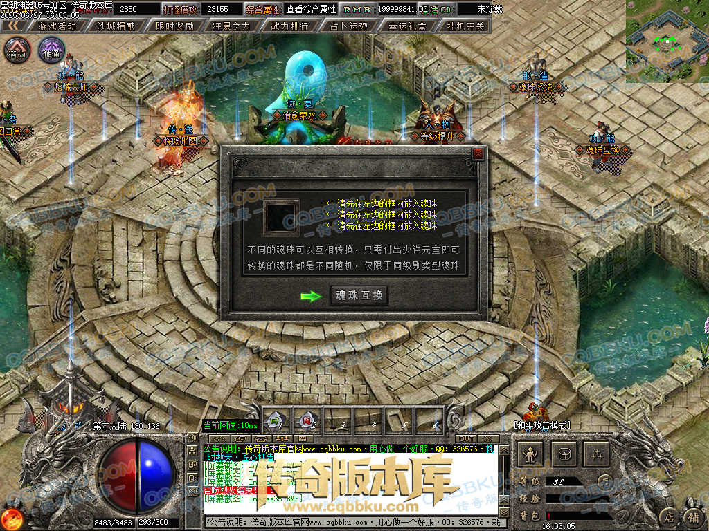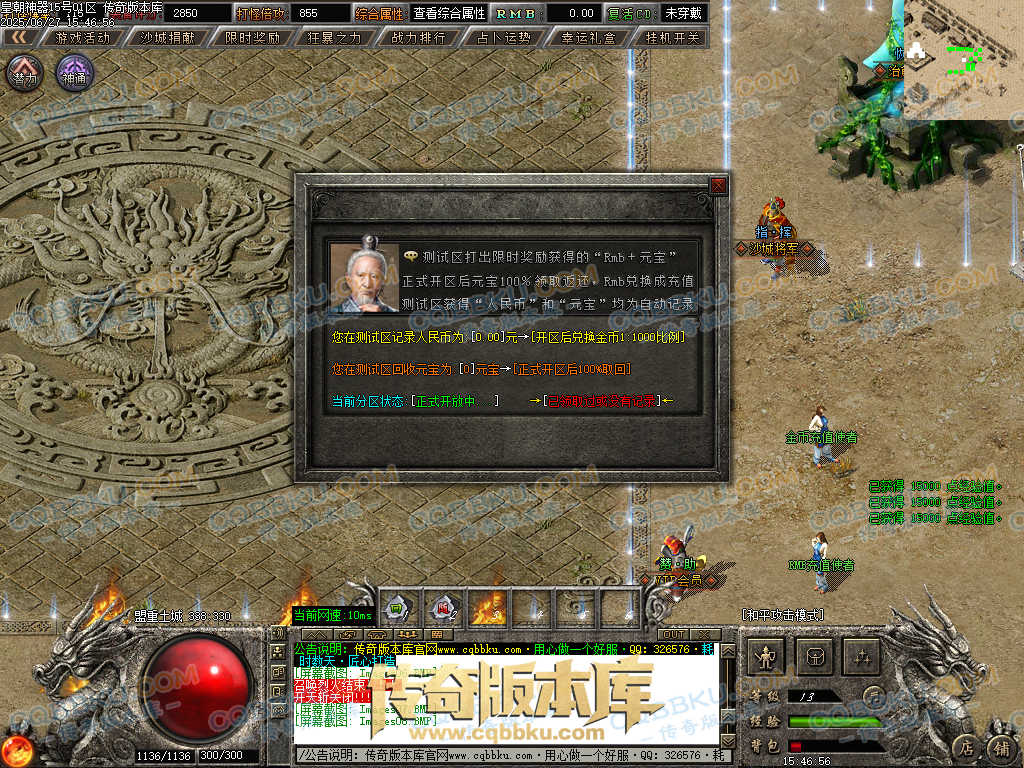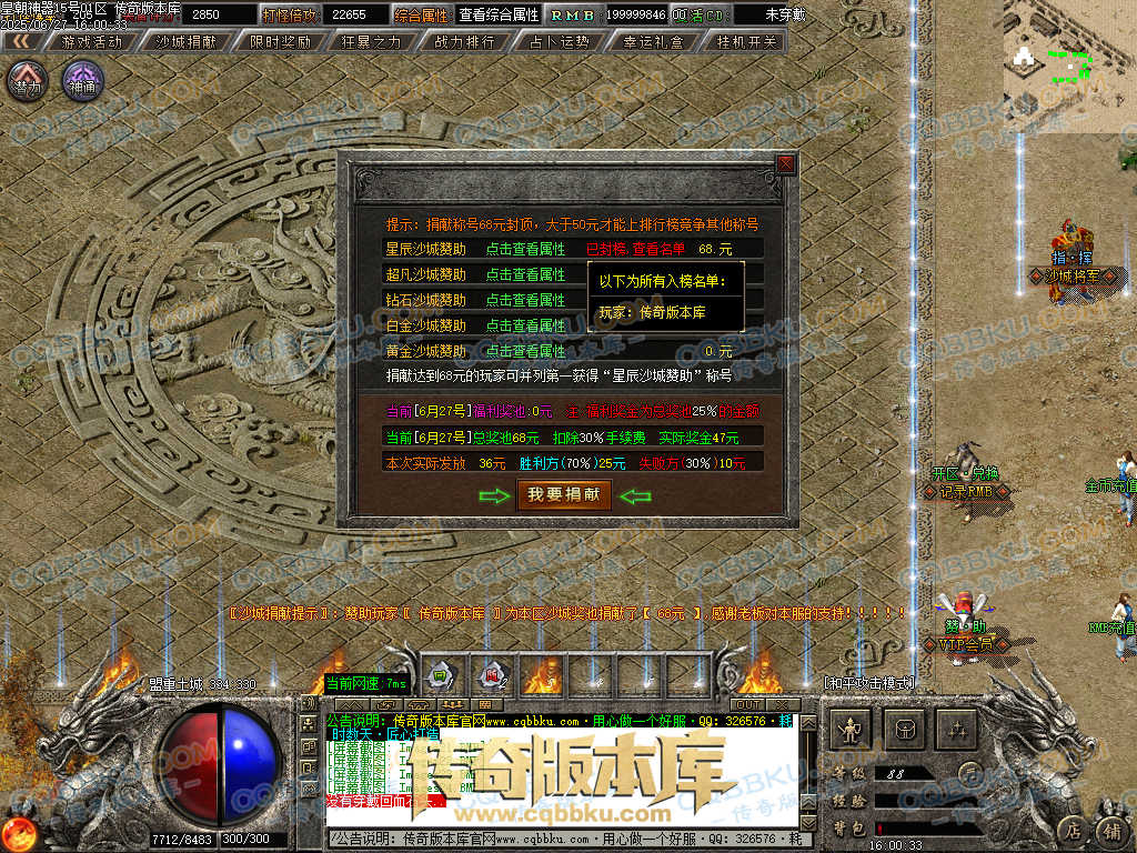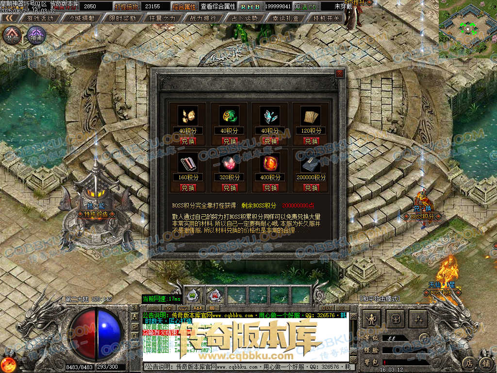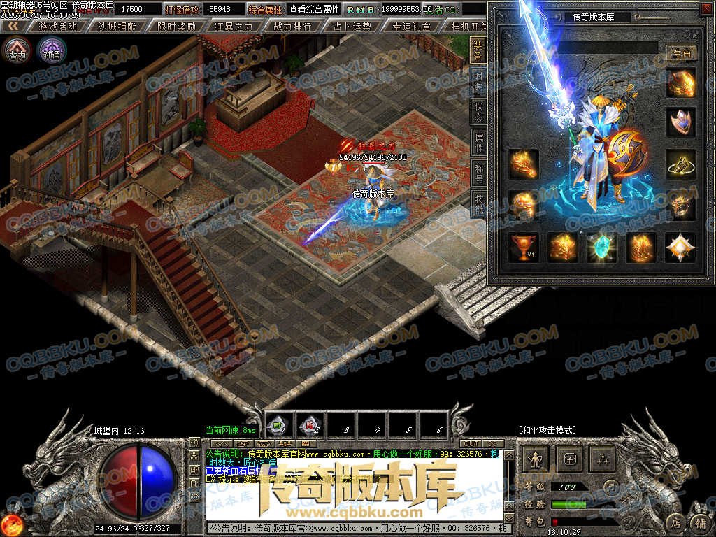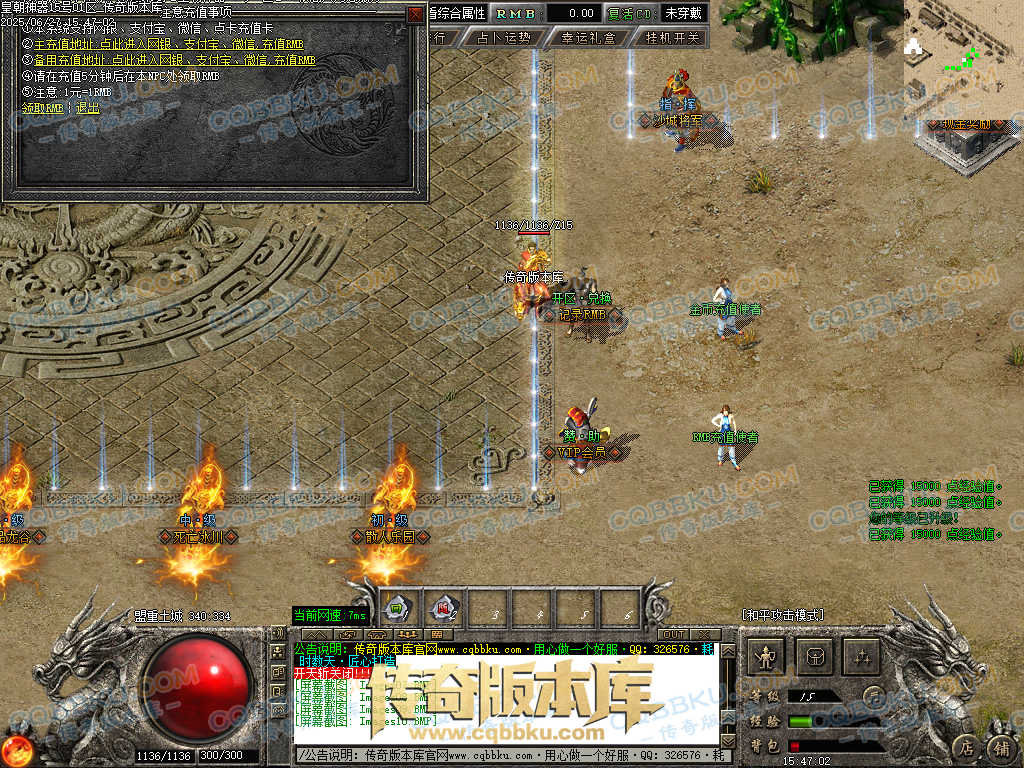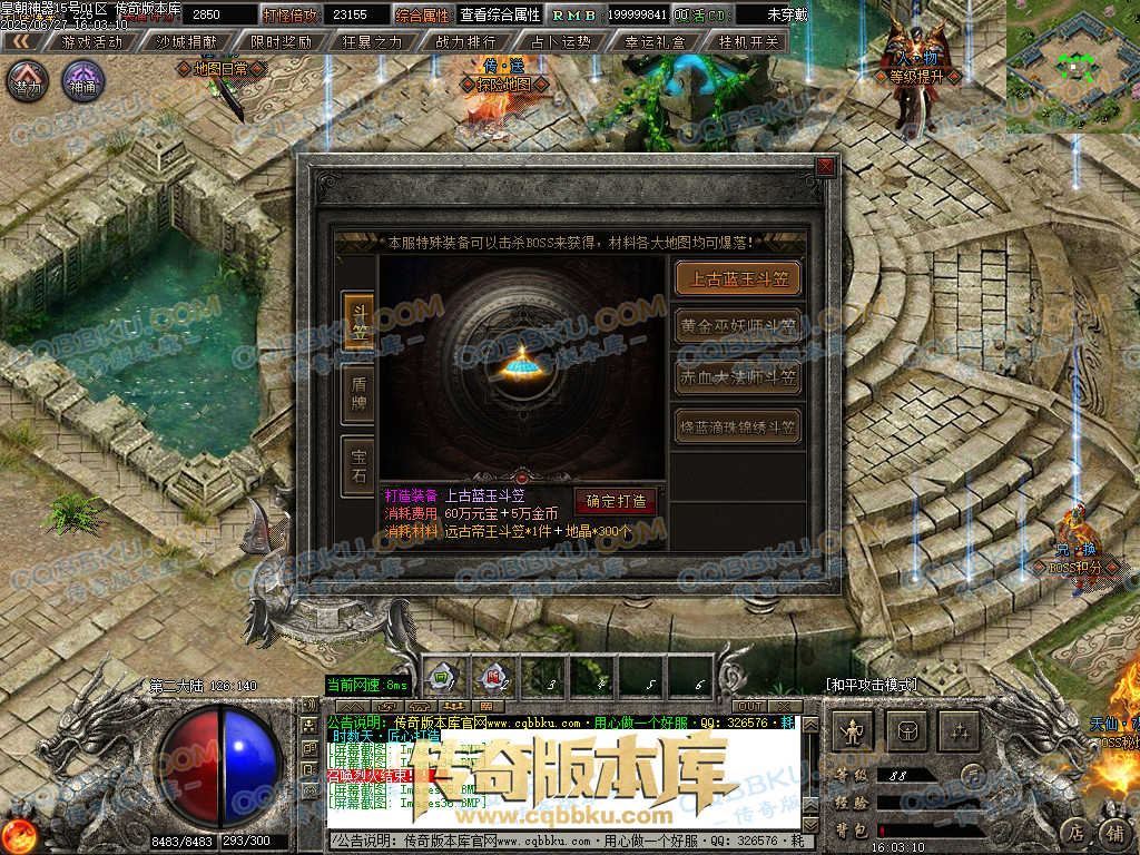 1:上线进行QQ礼包码、微信礼包码兑换:cqbbku 领取公益大礼包;赠送6大特殊、圣杯、符文、神章、斗笠、盾牌、血石;上线赠送自动捡物