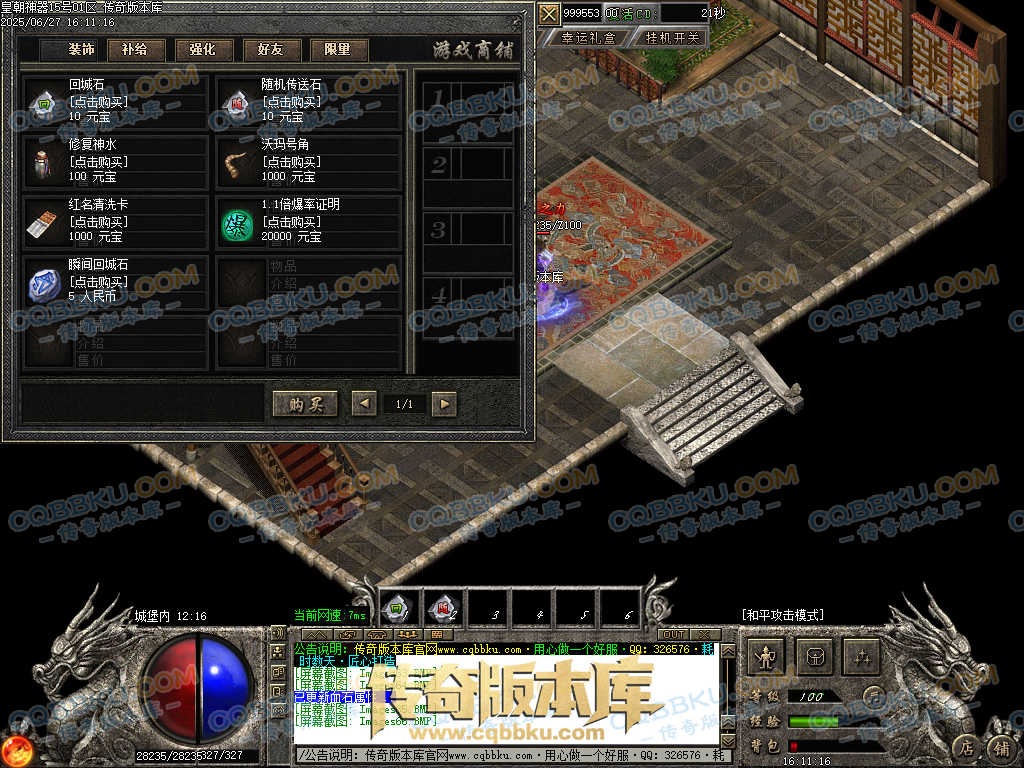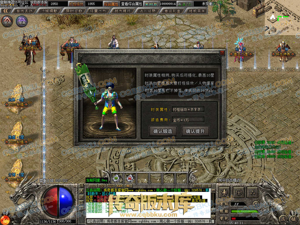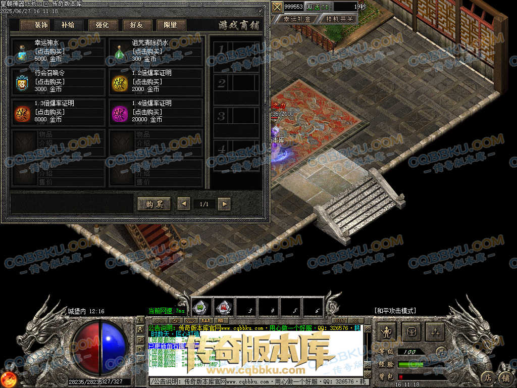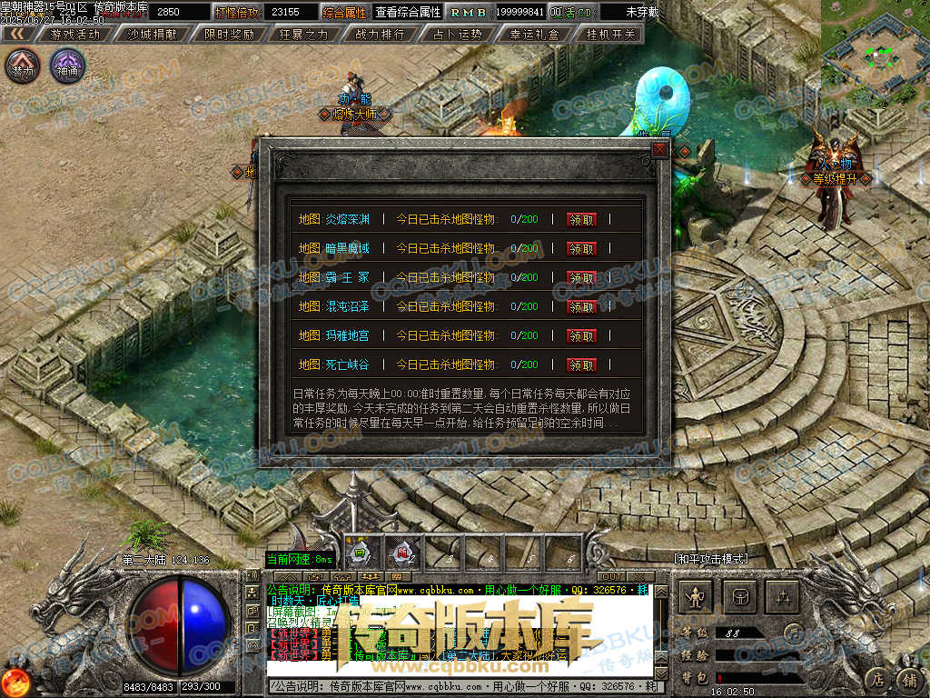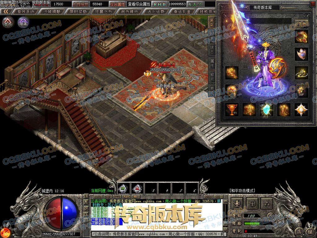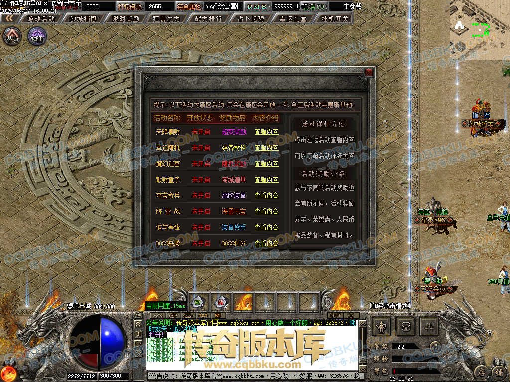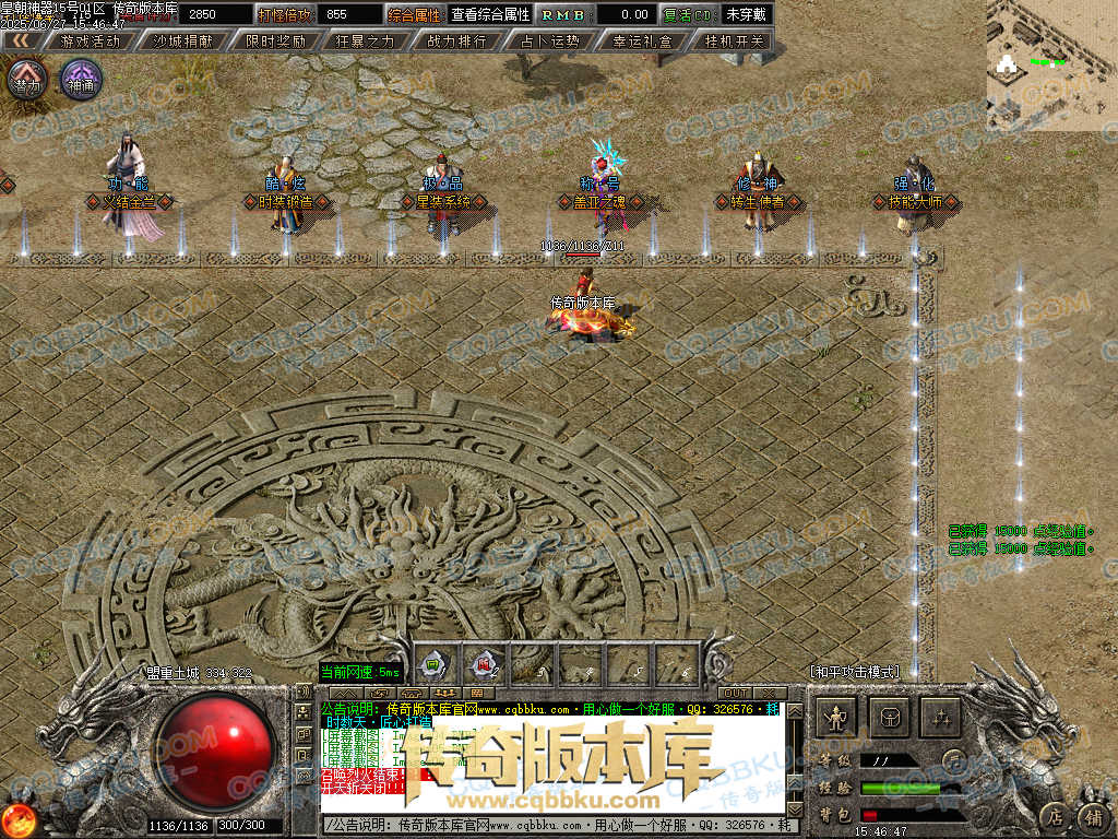 1:上线进行QQ礼包码、微信礼包码兑换:cqbbku 领取公益大礼包;赠送6大特殊、圣杯、符文、神章、斗笠、盾牌、血石;上线赠送自动捡物