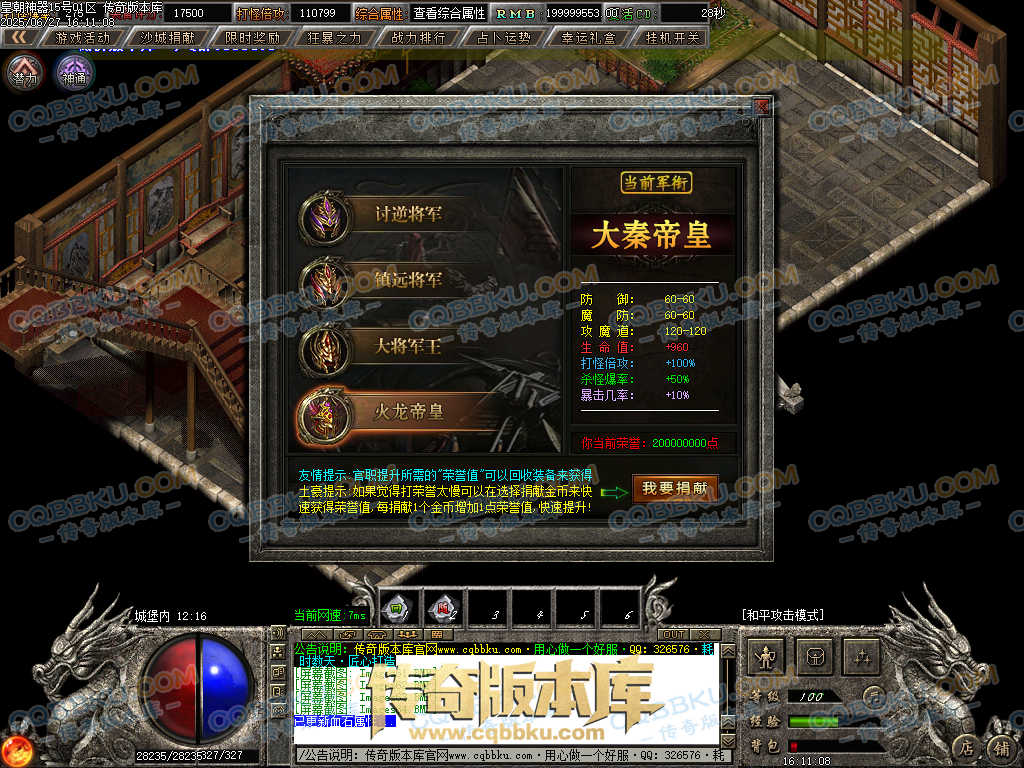 官职捐献(普通玩家可以回收装备获得荣誉值,高玩可以直接金币提升,前期提升到昭武将军需要468元的金币提供打怪倍攻47%,杀怪爆率24%,暴击几率6%;