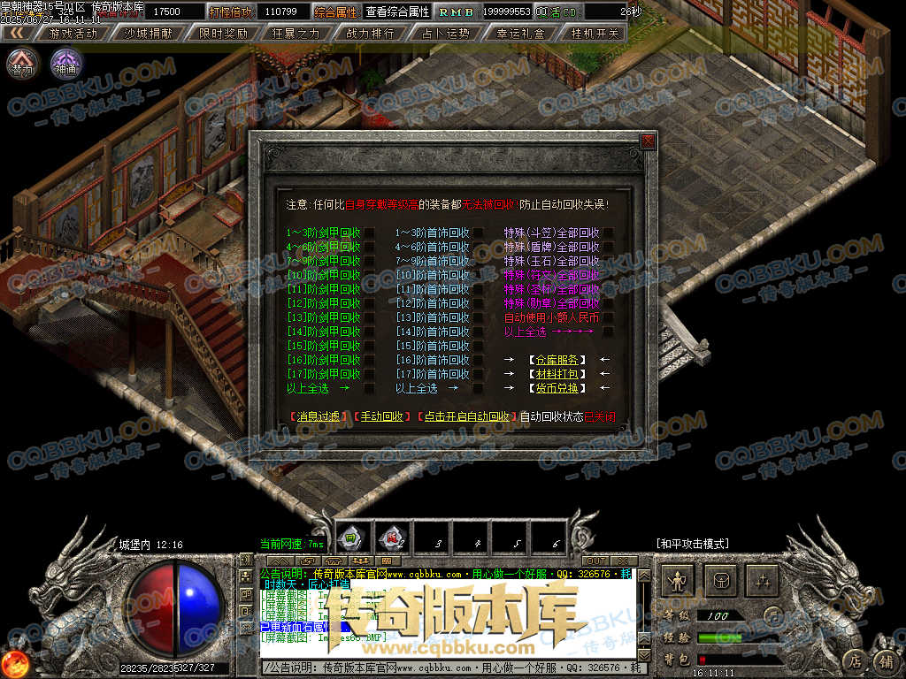 1:开区直接领取QQ礼包、微信礼包-沙捐献(30R)-狂暴(5R)-会员(50米金币)自动回收功能。