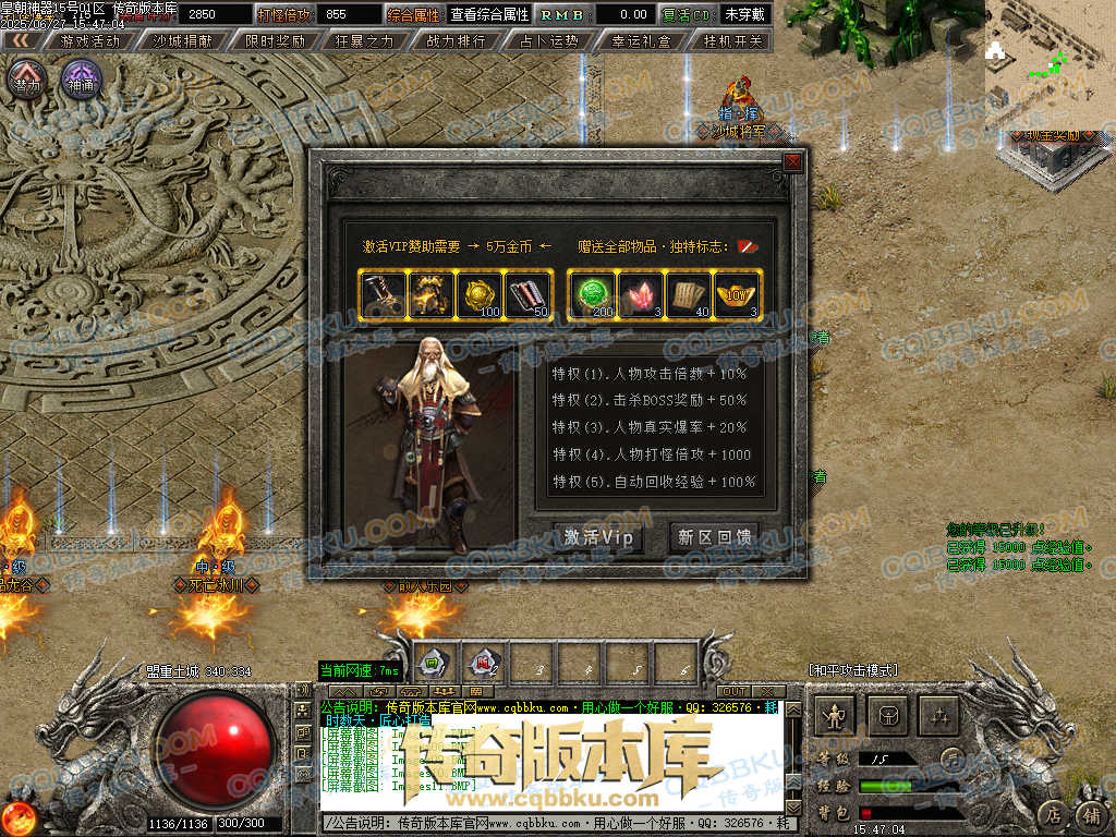 1:开区直接领取QQ礼包-沙捐献(30R)-狂暴(5R)-会员(50米金币)功能具备自动捡物,自动回收功能。