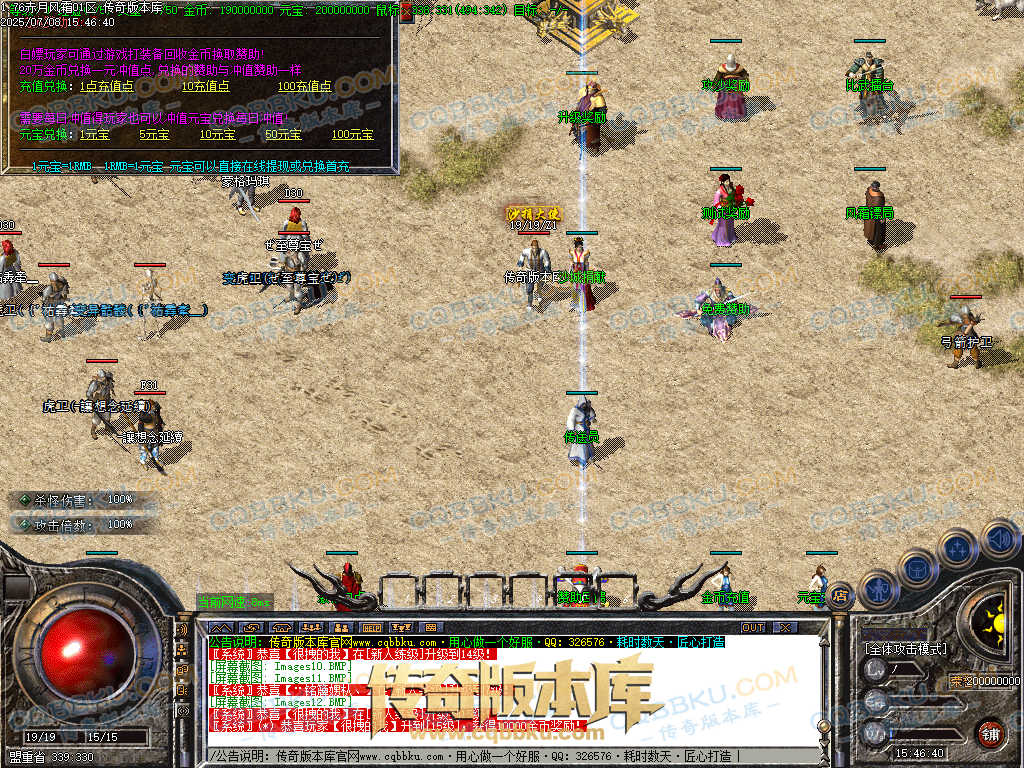 本服只售卖金币,比例1:20W 赠送风霜币1:10 土城安全区左侧可摆摊 元宝充值1:1,主要用于玩家服内装备交易使用,打金可提现,提现1:1,可兑换充值点和金币