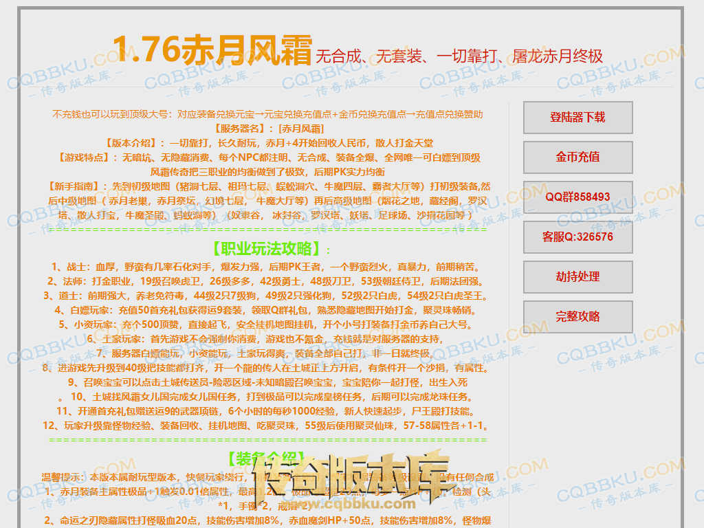 1、服务器为1.76金币复古+6极品版本,赤月封顶-屠龙终极-任何极品装备都靠玩家打怪爆出。无任何暗坑,金币好打。