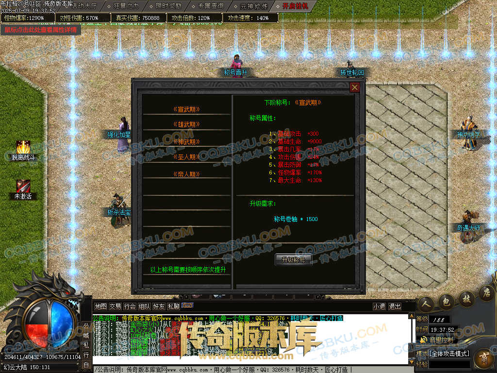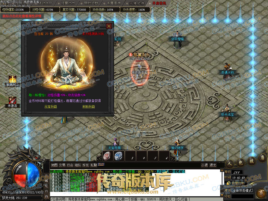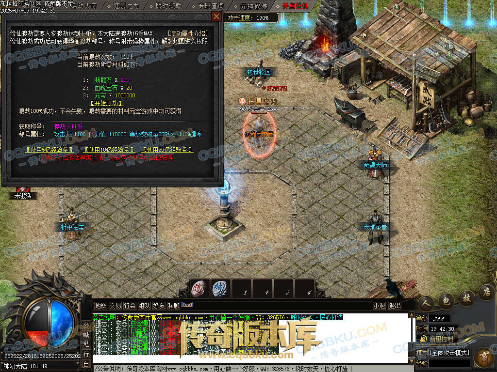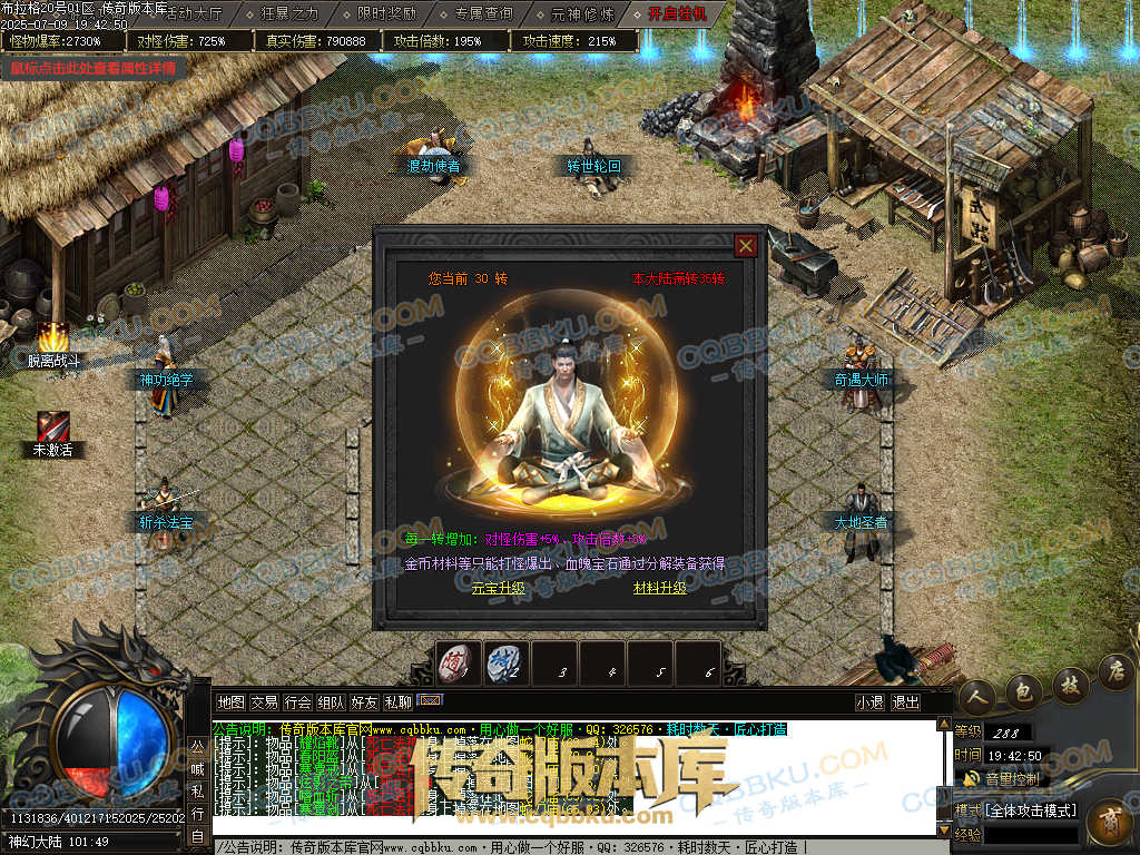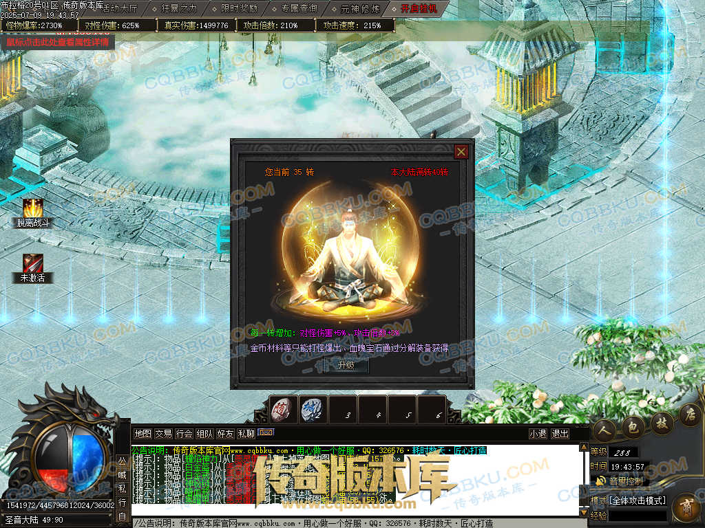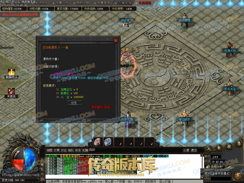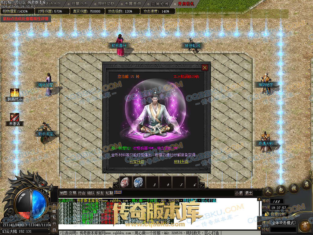 转世轮回:可以将转生转至35转! 渡劫使者:每次渡劫增加五级等级上限,满渡劫可以在NPC使用等级卷将等级提升至275级!