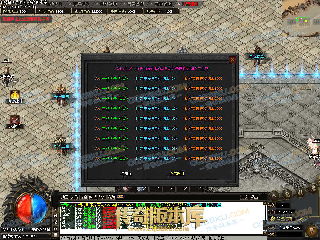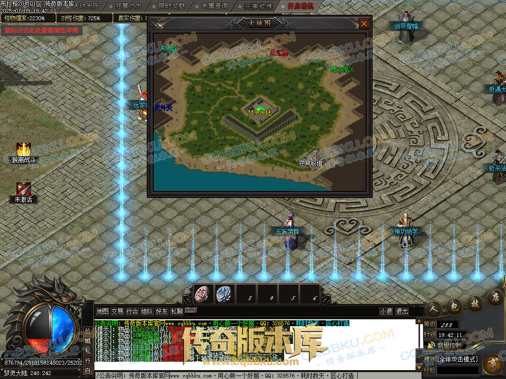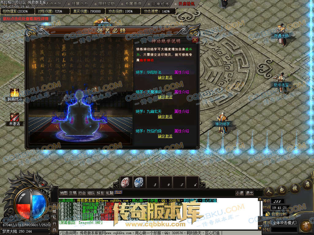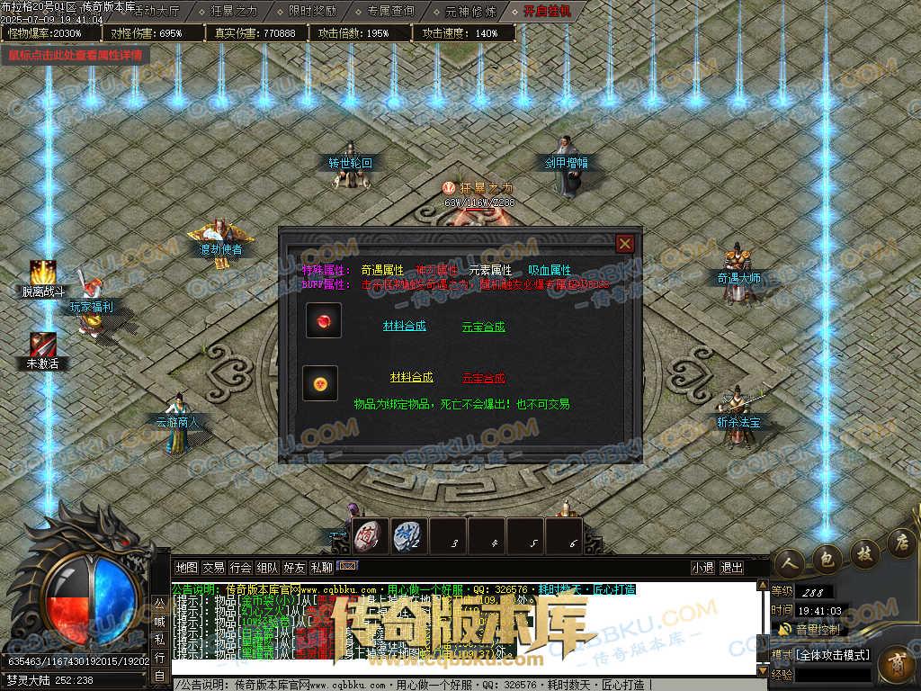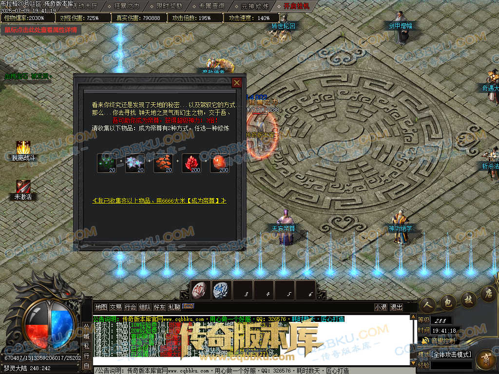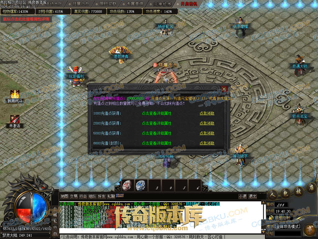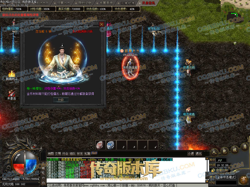 转世轮回:可以将转生转至35转! 渡劫使者:每次渡劫增加五级等级上限,满渡劫可以在NPC使用等级卷将等级提升至275级!