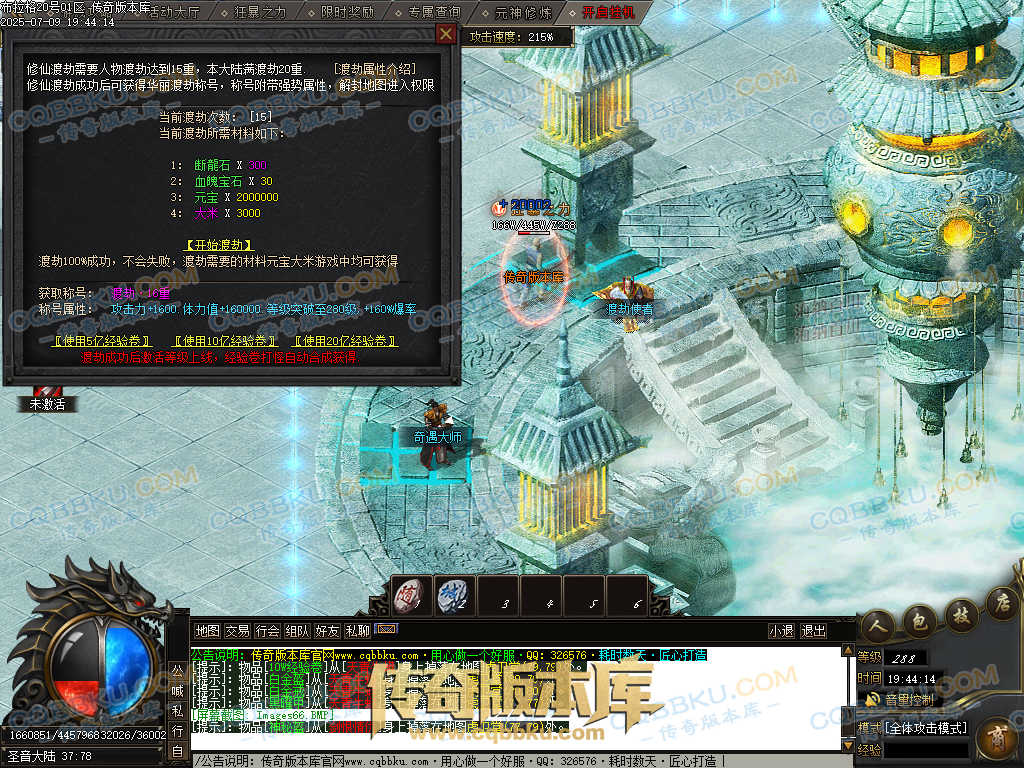 渡劫使者:渡劫到20重,将等级上限提升至300级,需要在NPC吃经验升级!