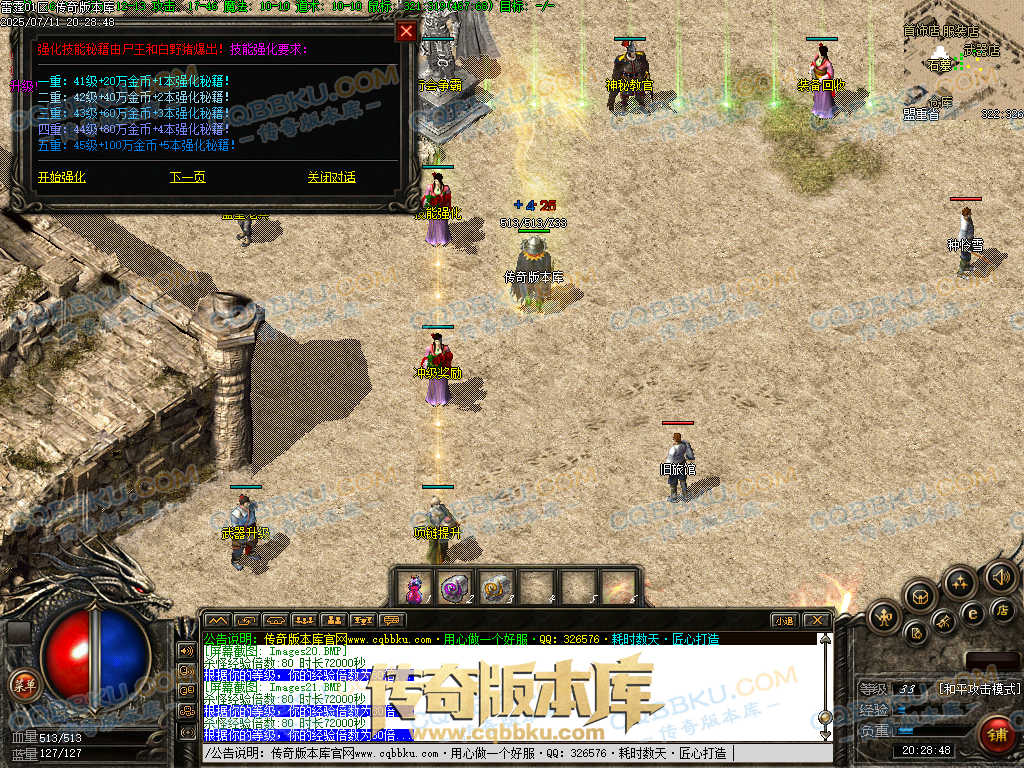 技能强化:技能强化从角色40-55级分别对应1-15重技能强化,需要等级+材料+金币(技能强化NPC处可查看);尸王、白野猪会掉各职业强化材料,推荐在尸王殿、沙影密道一层刷尸王比较效率,强化材料不用刻意去刷,等级到了去刷一圈基本够升一次,怪物刷新挺快的。