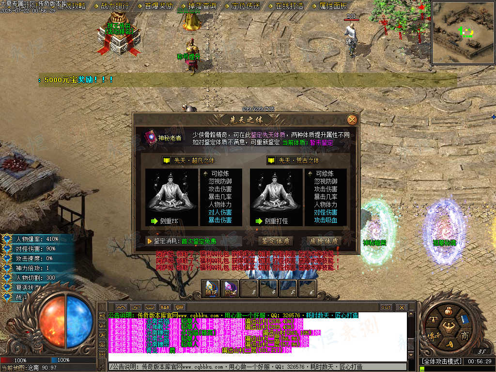 4、70级后可在【天师】处鉴定先天之体,可鉴定两种不同体质:超凡之体可额外提升对人伤害、暴击伤害;荒古之体可额外提升对怪伤害、攻击吸血;