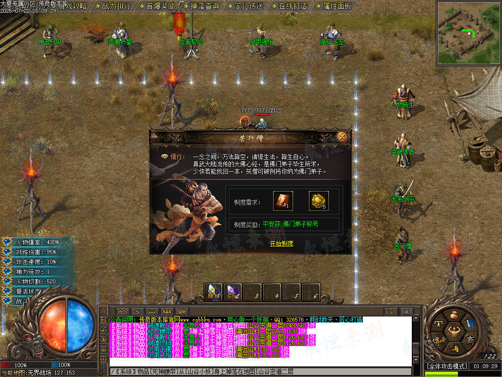 15、修罗道路线掉落心经和舍利子,收集后可在【苦行僧】处获得佛门弟子称号,解锁佛门禁地,可寻找【法显和尚】打造爆率法轮
