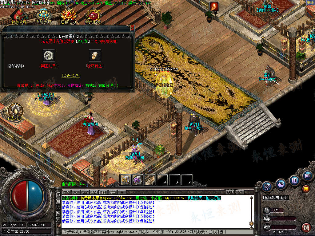 「骨灰档」元宝充值累计达到288:免费领取(不扣元宝):赠送国王勋章(1.3)、传送秘宝