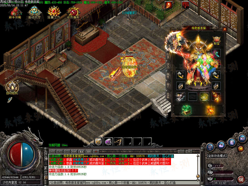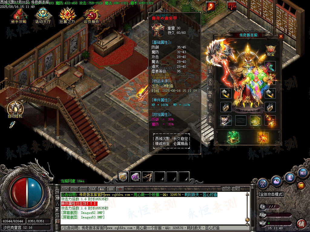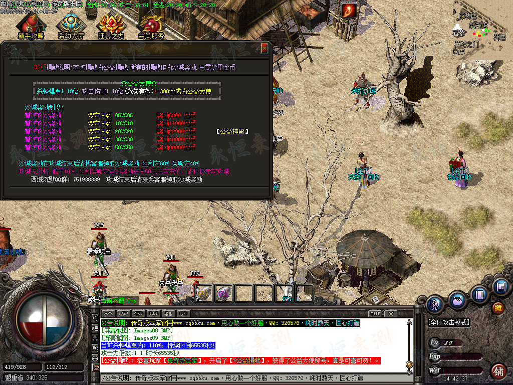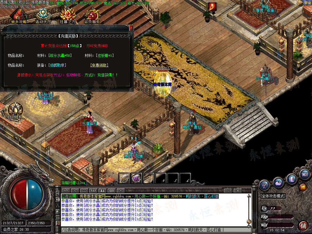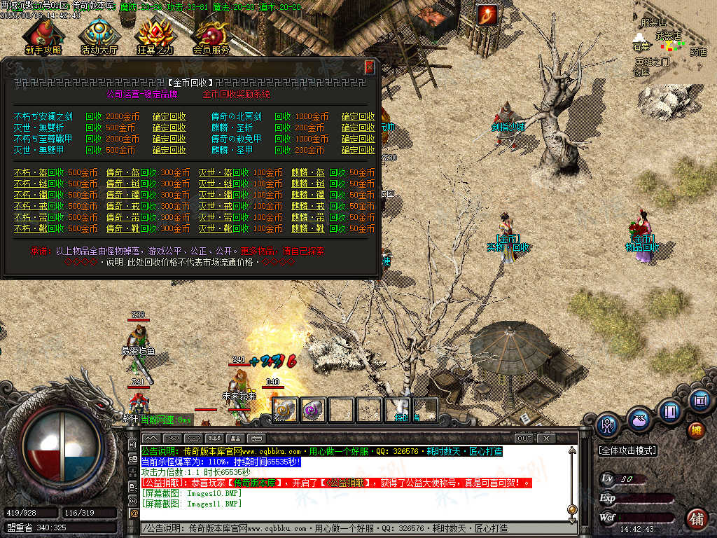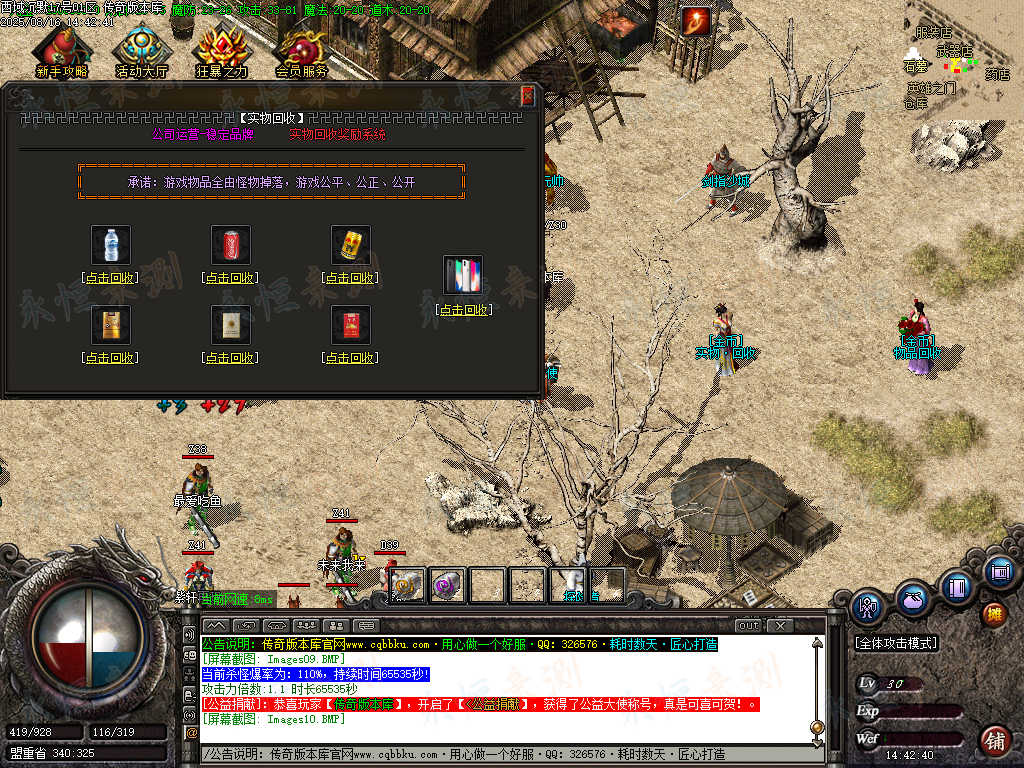 元宝充值:1=100+1充值点 (元宝、充值点可打,怪爆充值红包)
