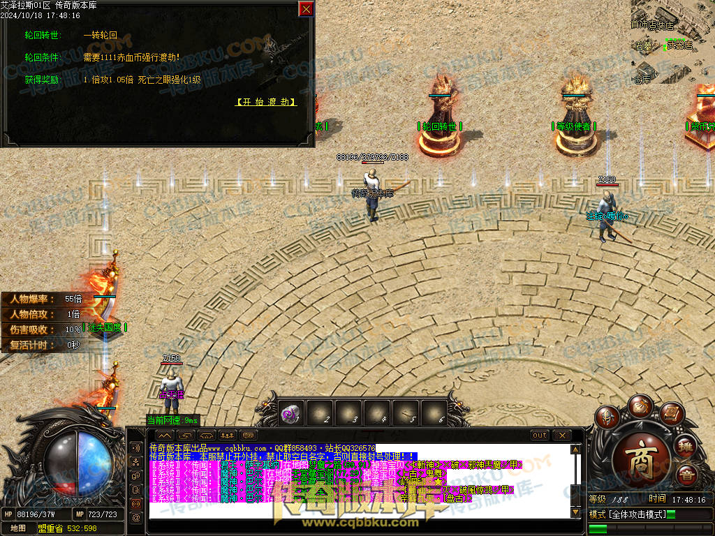 5.转身分28转.达到18转可以去魔幻星宫轮回.轮回1-10转.每个轮回都有独一无二BOSS.除有对话框神力倍数外5轮回开始增加人物血量(轮回只需要元宝几率成功)失败可以直接用赤血币