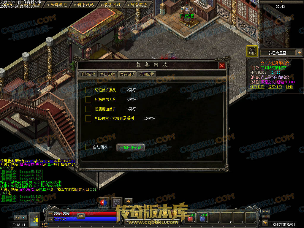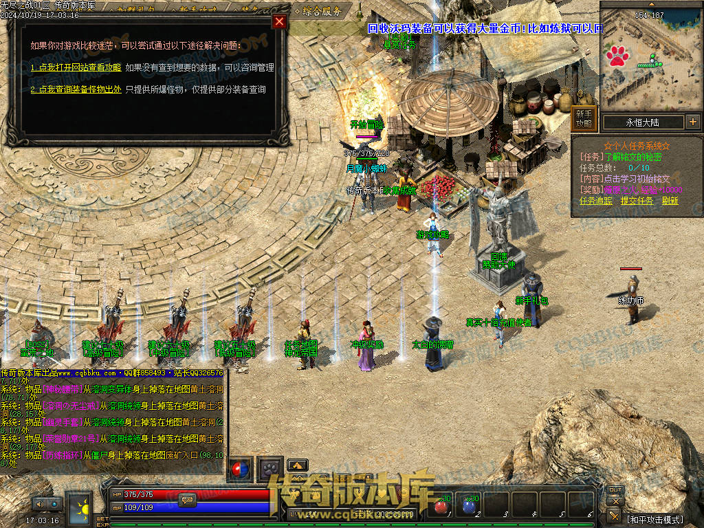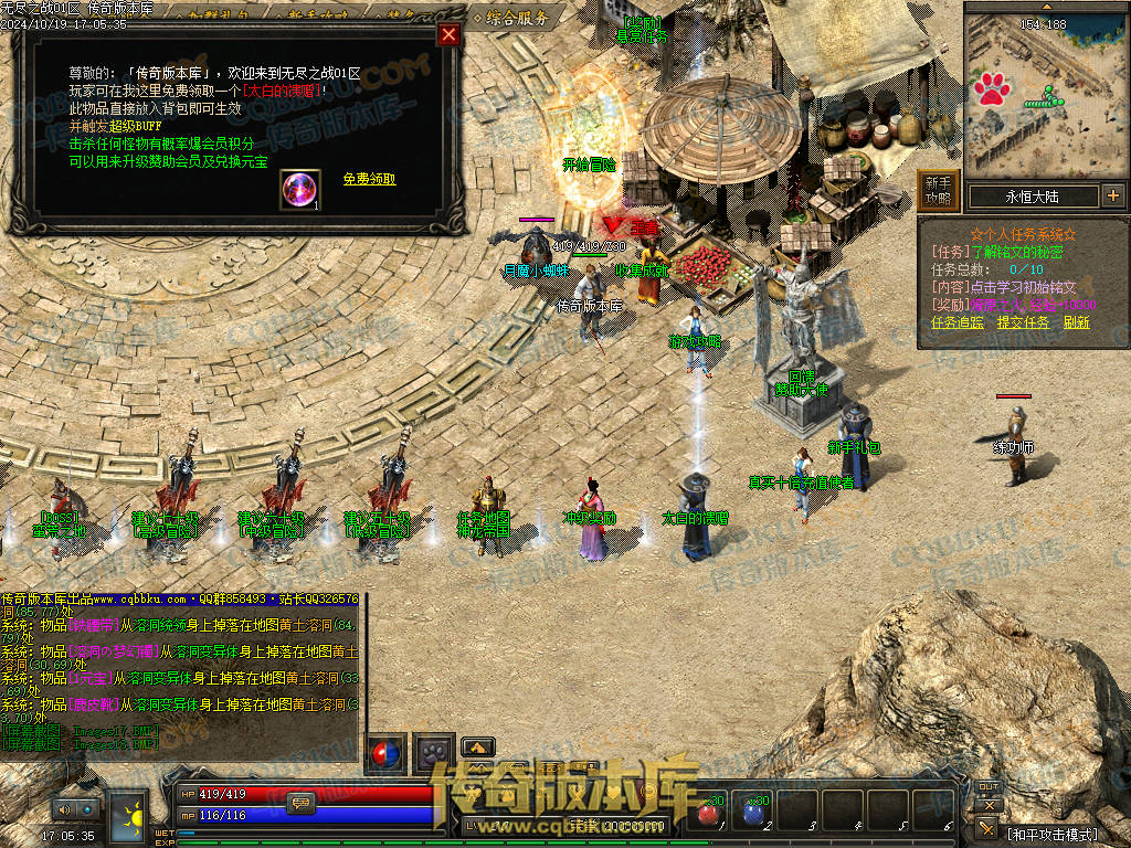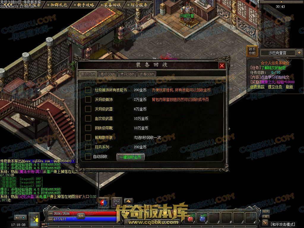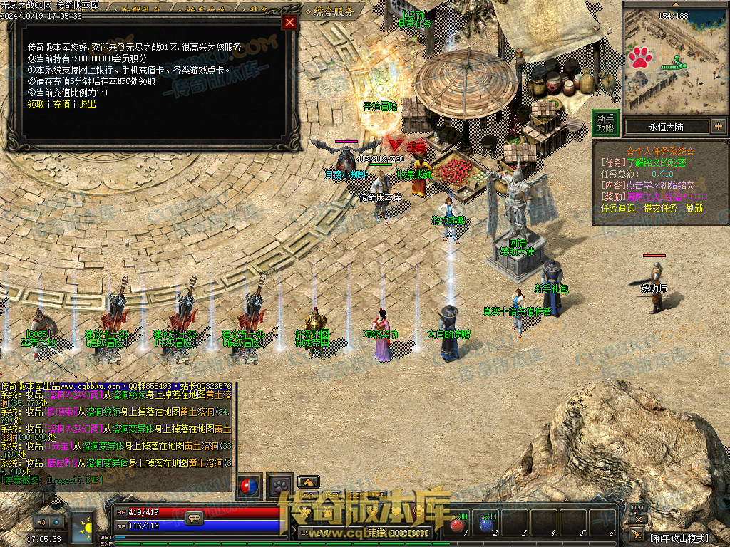 3.跟管理要了50路费后进游戏找充值NPC领取;随后双击背包里的首充礼包范围秒拣、自动回收、自动挂机就都有了再去找赞助NPC用积分兑换5000元宝足够用了。