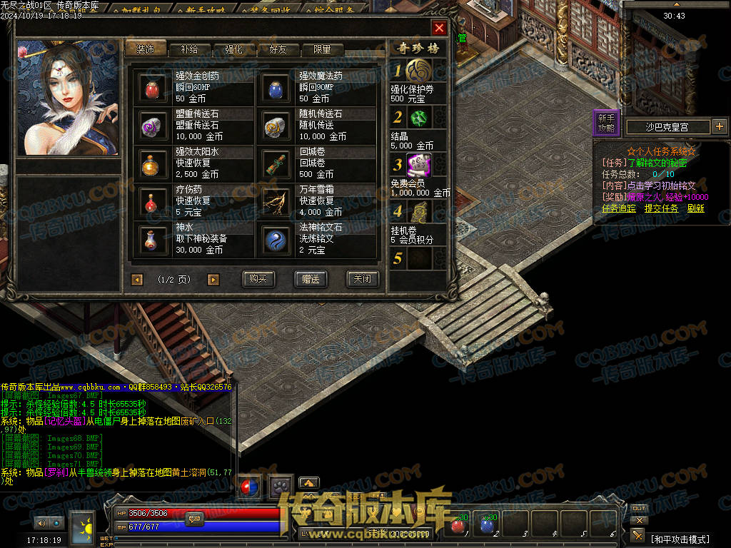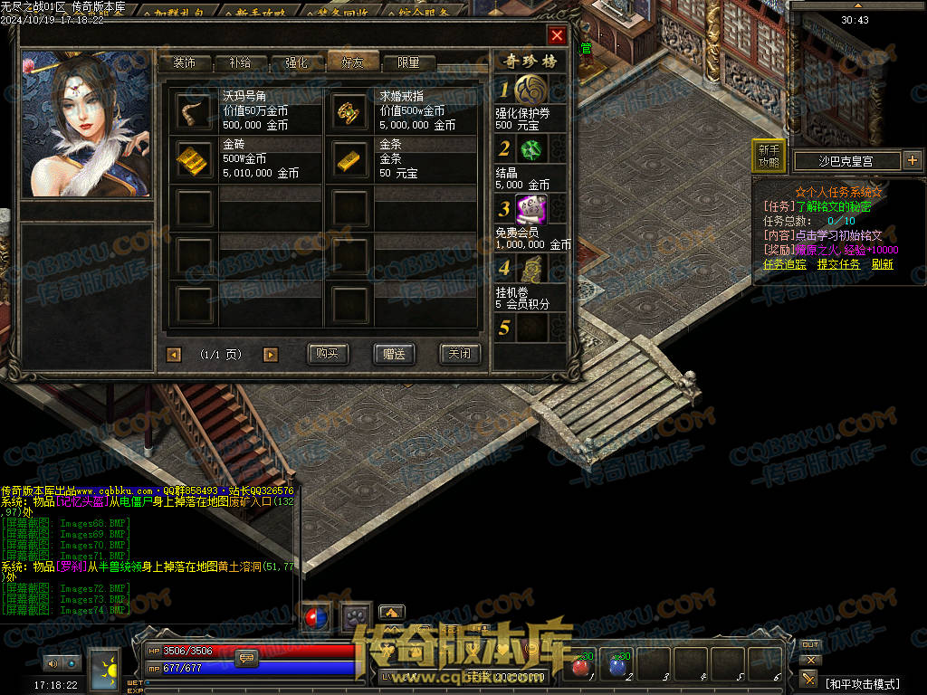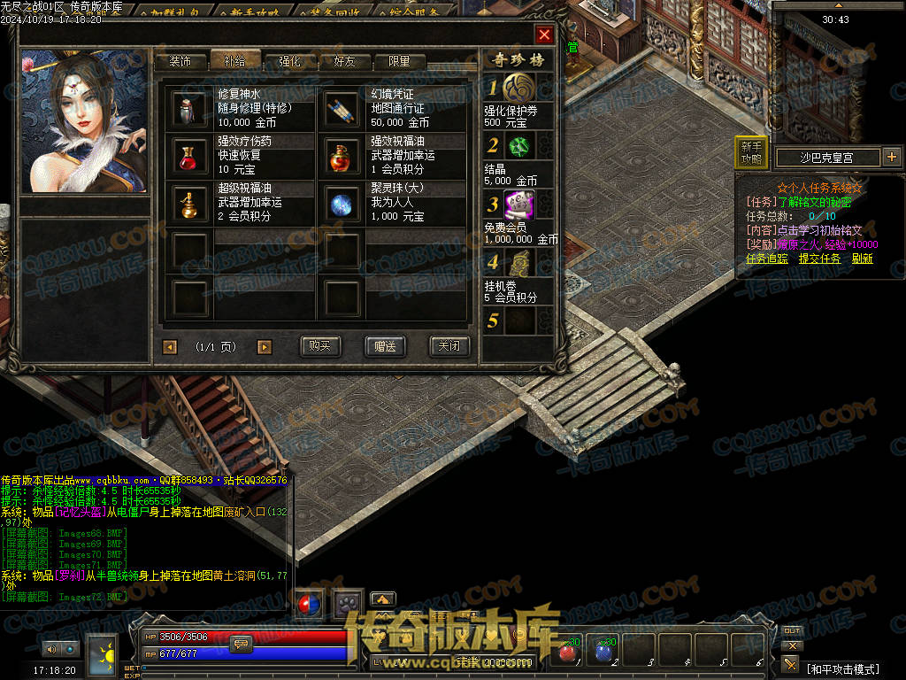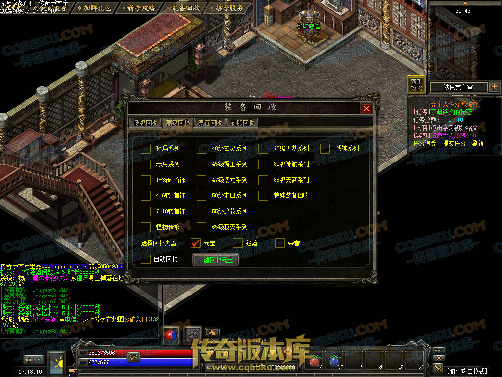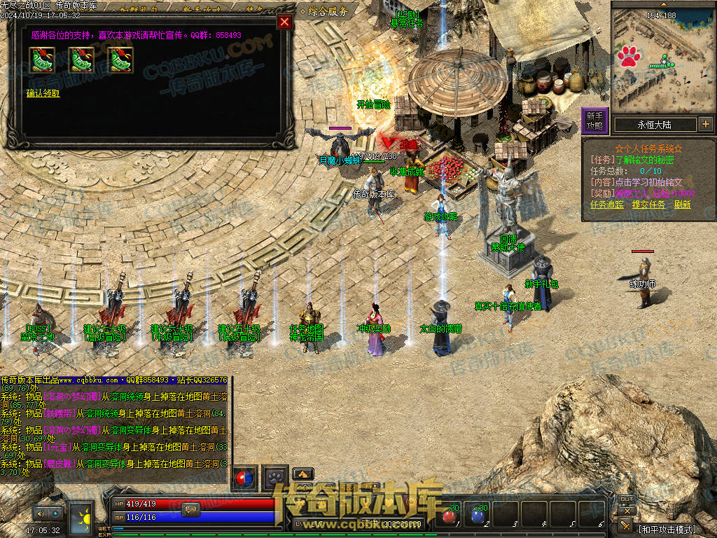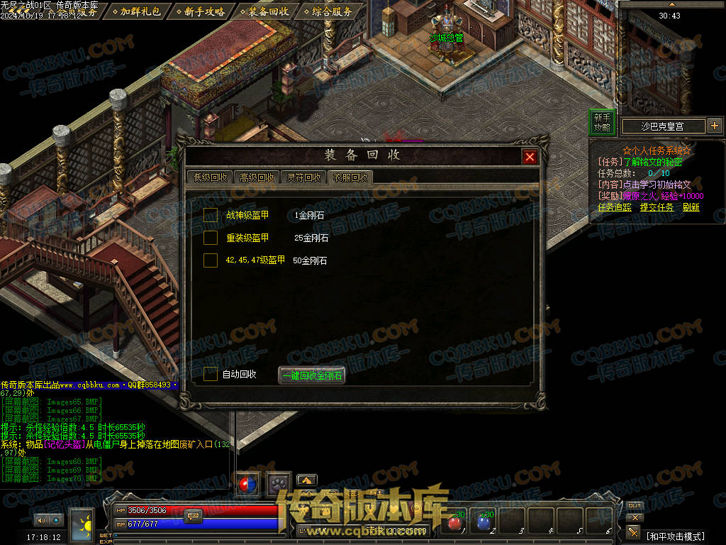 3.跟管理要了50路费后进游戏找充值NPC领取;随后双击背包里的首充礼包范围秒拣、自动回收、自动挂机就都有了再去找赞助NPC用积分兑换5000元宝足够用了。