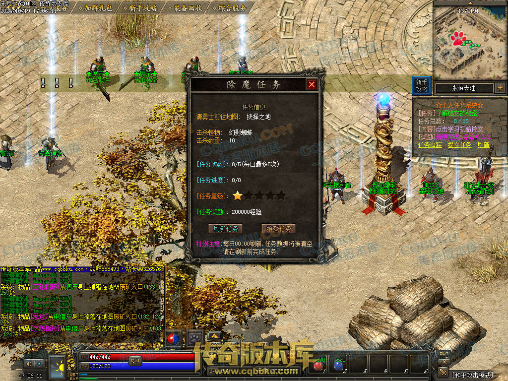 土城做除魔任务有经验奖励和4倍经验卷轴奖励每天可做一次更可以花元宝追加一次除魔任务。