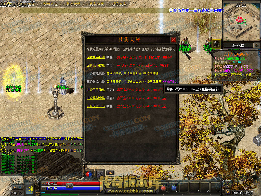 2.逐日剑法及开天斩等技能可使用书页前往盟重书店抽取或击杀远古尸王、诺玛地图获得。